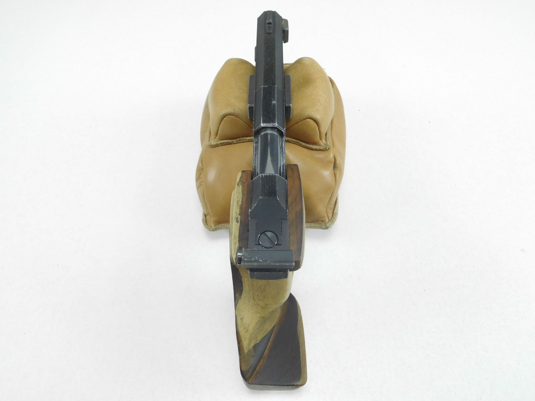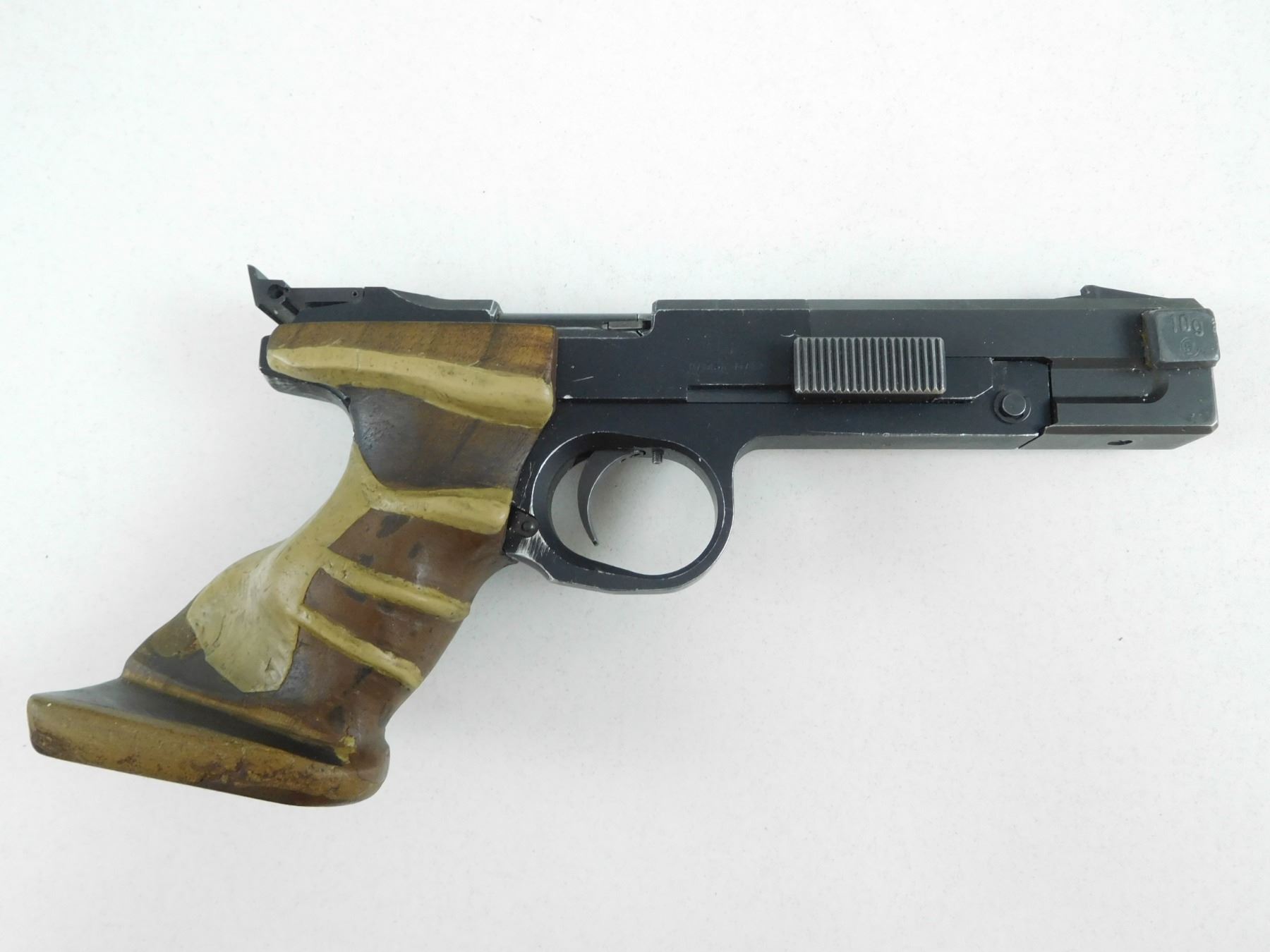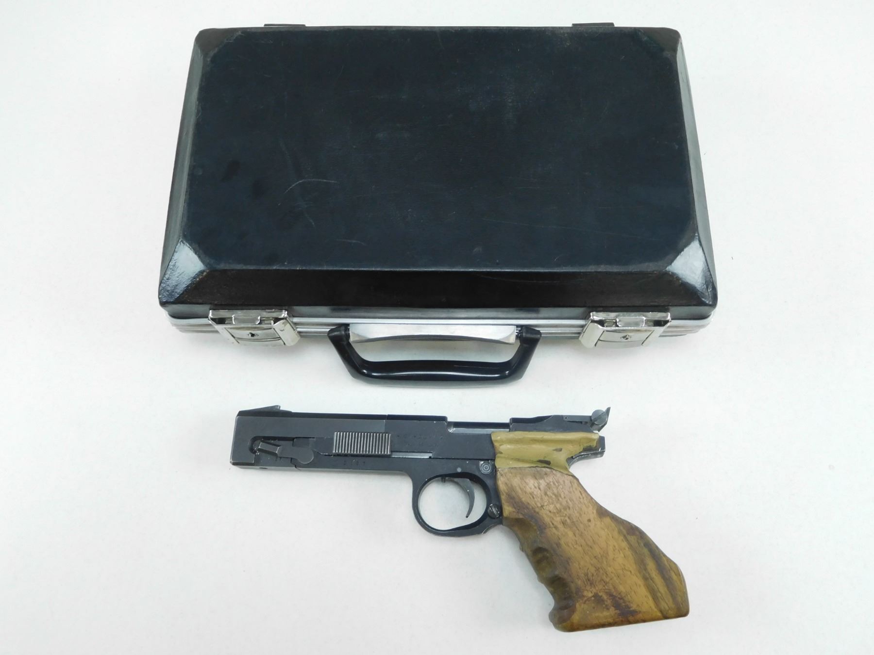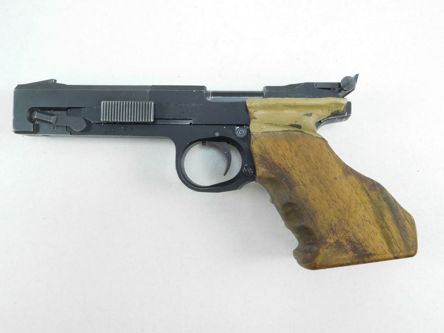 I.G.I. DOMINO , MODEL: SP602 , CALIBER: 22 LR , COMES WITH A CASE AND MAGAZINE, FIXED FRONT BLADE AND ADJUSTABLE REAR NOTCH SIGHTS, ERGONOMIC WOODEN TARGET GRIPS, BORE IS AVERAGE , BARREL LENGTH: 140MM , SERIAL # 0127 , STOCK # 2696 , CONDITION: 6/10 , CLASS: CANADIAN RESTRICTED CLASS