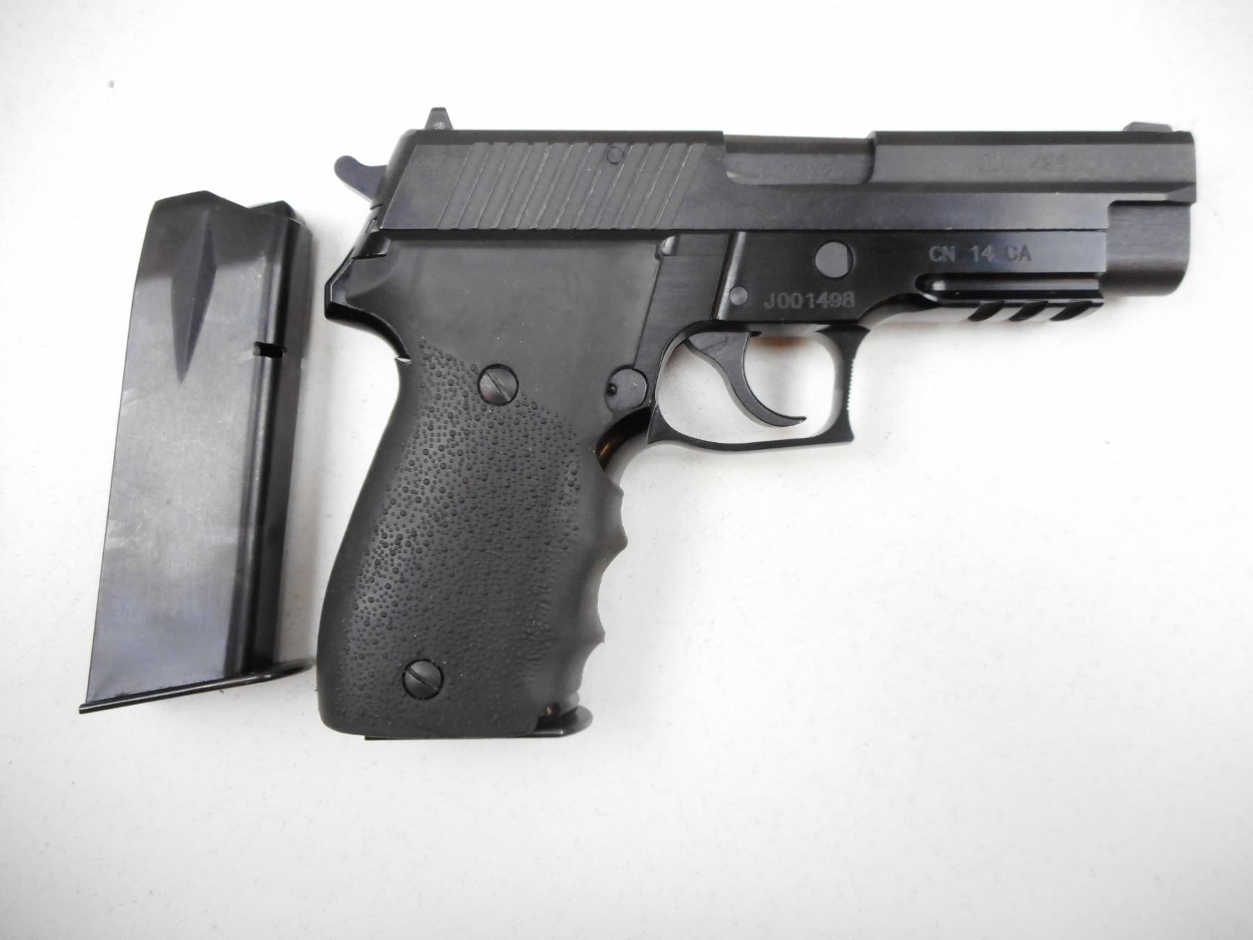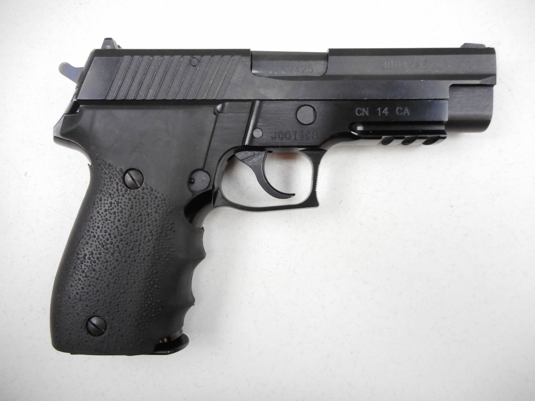 DOMINION ARMS , MODEL: P762 , CALIBER: 7.62 X 25 TOKAREV , COMES WITH 2 MAGAZINES, ADJUSTABLE NOTCH AND BLADE SIGHTS, TEXTURED RUBBER WRAP AROUND GRIPS, UNDER BARREL PICATTINY RAIL, EXCELLENT BORE , BARREL LENGTH: 114MM , SERIAL # J001498 , STOCK # 2728 , CONDITION: 9/10 , CLASS: CANADIAN RESTRICTED CLASS