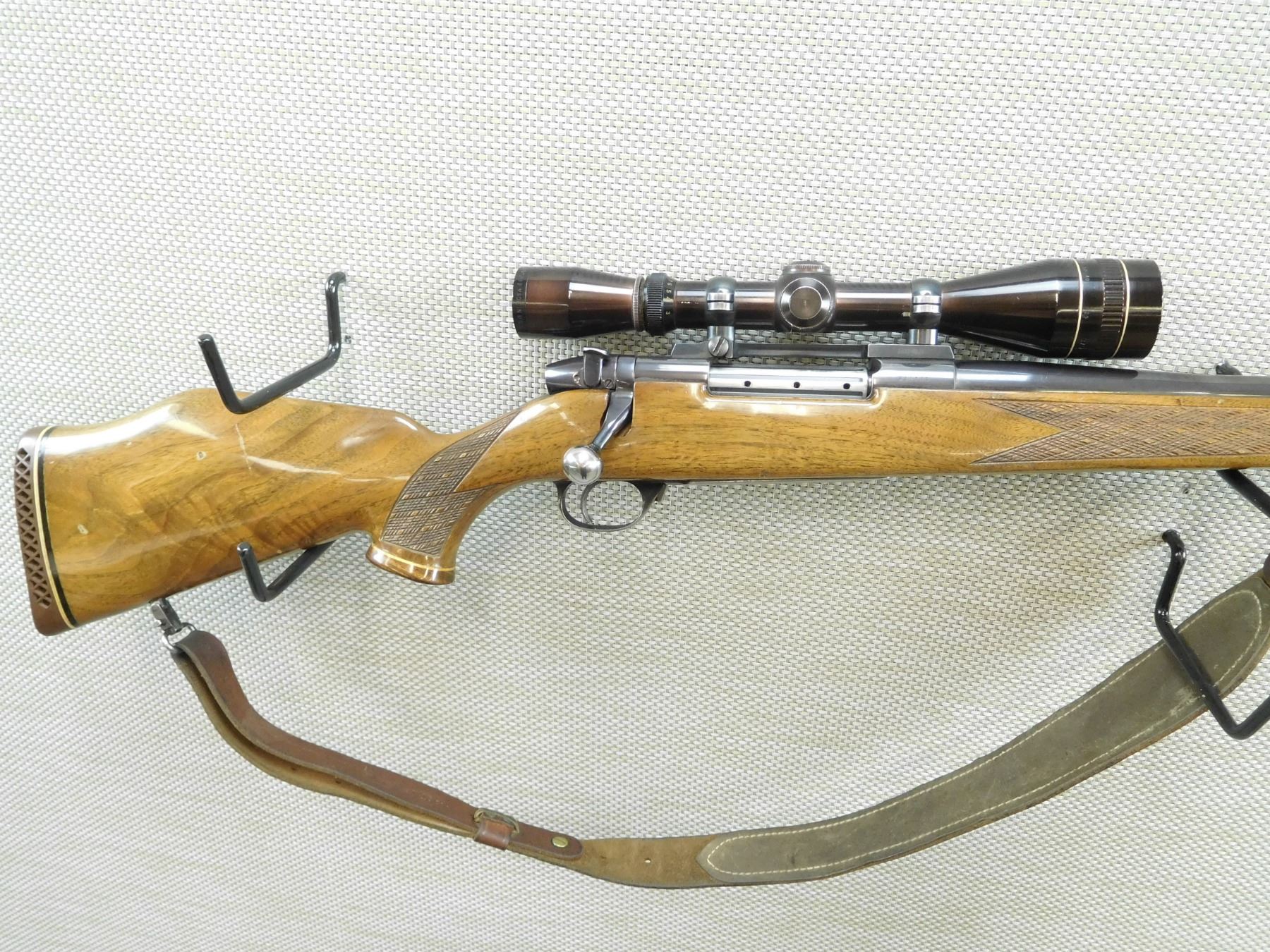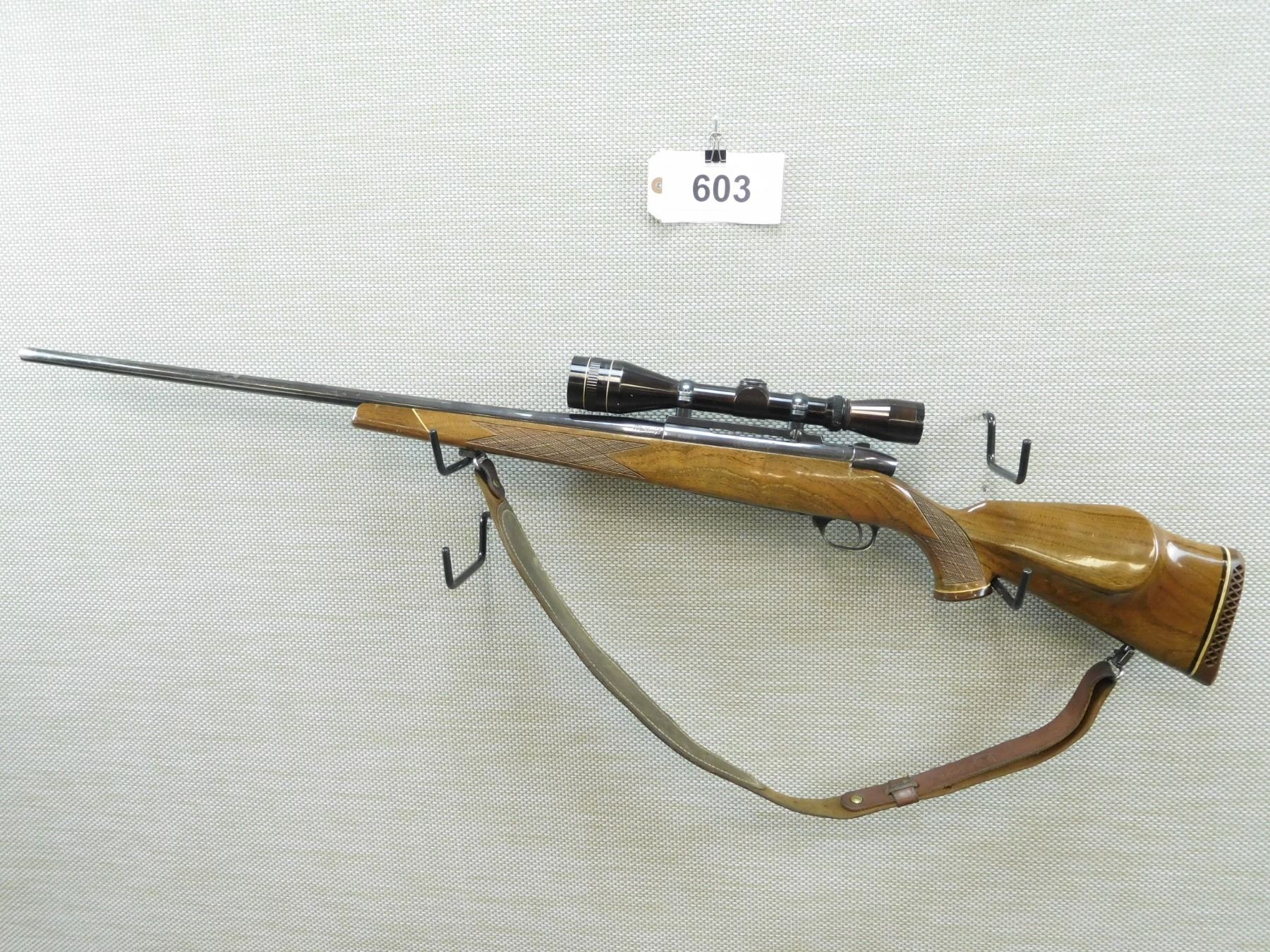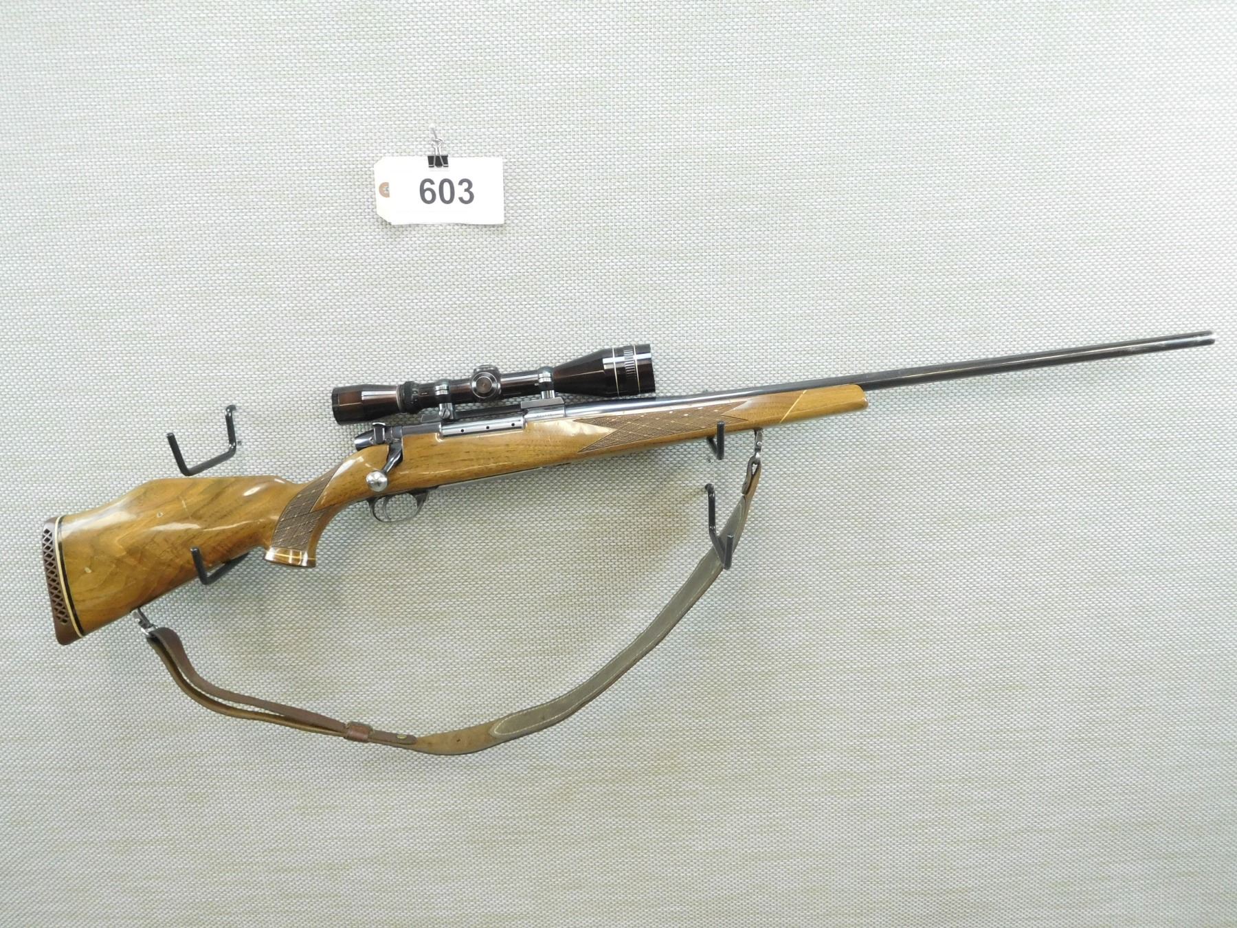 WEATHERBY , MODEL: MARK V , CALIBER: 300 MAG , HINGED FLOOR PLATE, EXCELLENT BORE, LEUPOLD 3 - 9 SCOPE, NO SIGHTS, CHECKERED FOREND AND ROSE WOOD CAPPED PISTOL GRIP MONTE CARLO BUTT STOCK, SLING SWIVELS WITH A LEATHER SLING, VENTED RUBBER RECOIL PAD, SHOWS SOME HANDLING MARKS , BARREL LENGTH: 26" , SERIAL # H94746 , STOCK # 7972 , CONDITION: 7/10 , CLASS: CANADIAN NON RESTRICTED CLASS