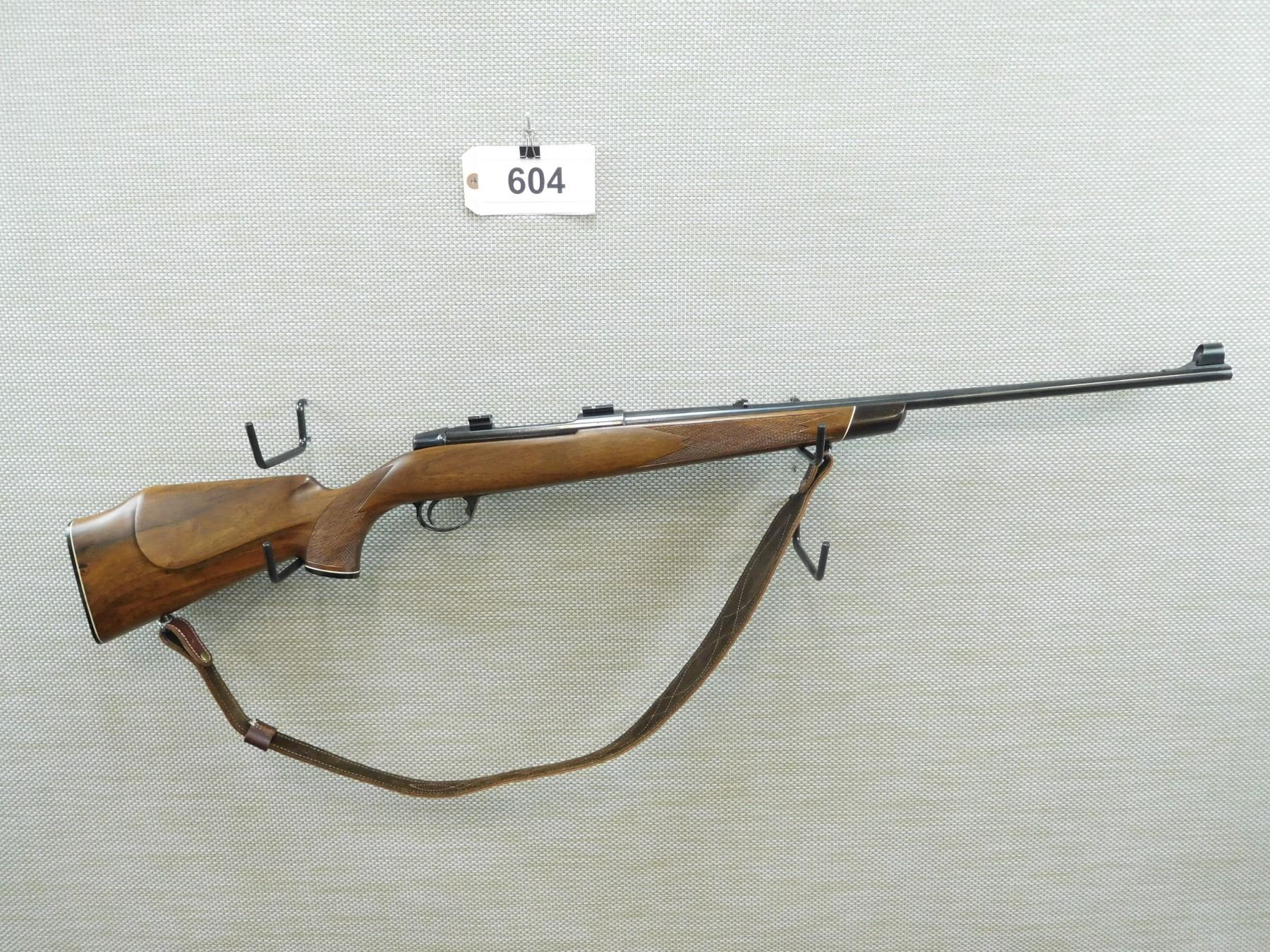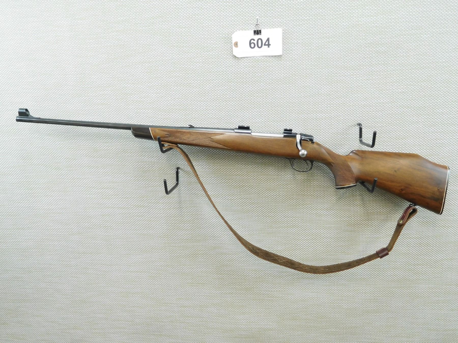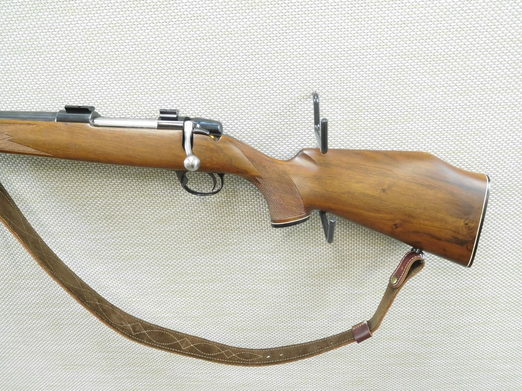 CARL GUSTAFF , MODEL: HVA - LEFT HANDED , CALIBER: 243 WIN , HINGED FLOOR PLATE, , INCLUDES SCOPE MOUNTS, COMES WITH A NON ATTACHED TASCO WORLD CLASS 3 - 9 SCOPE WITH WEAVER RINGS, CHECKERED PISTOL GRIP AND FOREND THAT IS CAPPED WITH ROSEWOOD, MONTE CARLO BUTT STOCK, HOODED FRONT SIGHT AND FLIP ADJUSTABLE REAR SIGHT, EXCELLENT BORE, SLING SWIVELS WITH LEATHER SLING , BARREL LENGTH: 24" , SERIAL # 630782 , STOCK # 7973 , CONDITION: 8/10 , CLASS: CANADIAN NON RESTRICTED CLASS