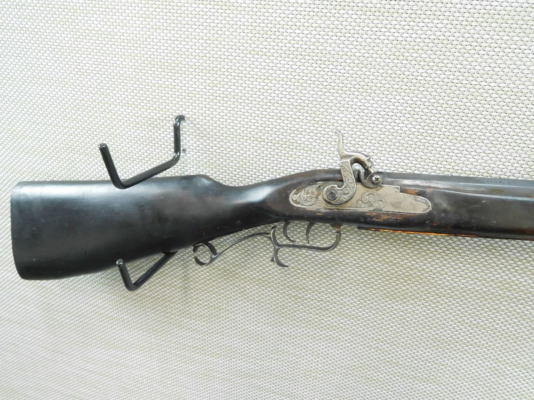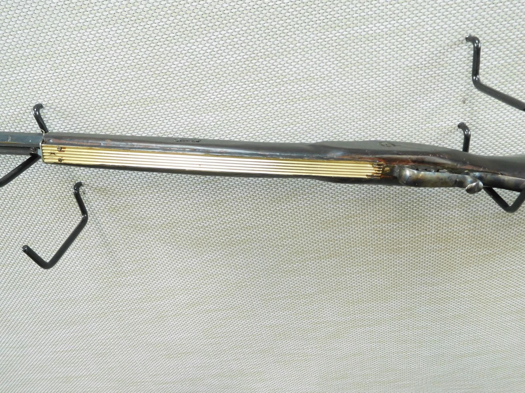 THOMPSON CENTER , MODEL: HAWKEN REPRODUCTION , CALIBER: 45 CAL PERCUSSION , SHOWS EXTENSIVE HANDLING MARKS, HEAVY OCTAGONAL BARREL, GOOD BORE, BRASS UNDERRAIL HAS BEEN ADDED TO FOREND, SET TRIGGER, STOCK HAS BEEN EXTENDED, MISSING THE BUTT PLATE, ENGRAVED SIDE PLATE, MISSING THE RAM ROD, BLADE FRONT AND FIXED REAR SIGHT , BARREL LENGTH: 28" , SERIAL # 131112 , STOCK # 7983 , CONDITION: 4/10 , CLASS: CANADIAN NON RESTRICTED CLASS
