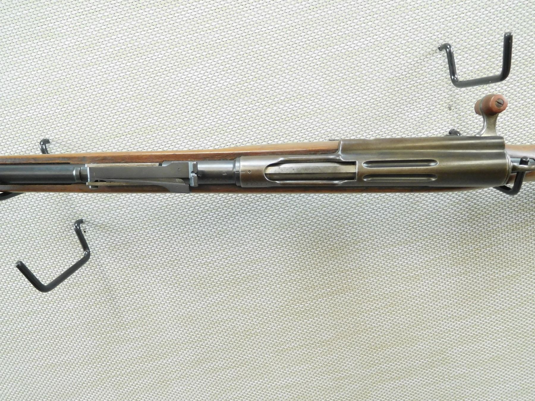 SCHMIDT RUBIN , MODEL: SPORTER , CALIBER: 7.5 X 55 SWISS , COMES WITH MAGAZINE, BOLT MATCHES RECEIVER, EXCELLENT BORE, SPORTERIZED MILITARY CONFIGURATION, MISSING THE REAR SLING SWIVEL, SHOWS SOME HANDLING MARKS, RAISED FRONT AND ADJUSTABLE REAR SIGHT, CRACK AT THE WRIST , BARREL LENGTH: 25 1/2" , SERIAL # 32220 , STOCK # 8007 , CONDITION: 5/10 , CLASS: CANADIAN NON RESTRICTED CLASS