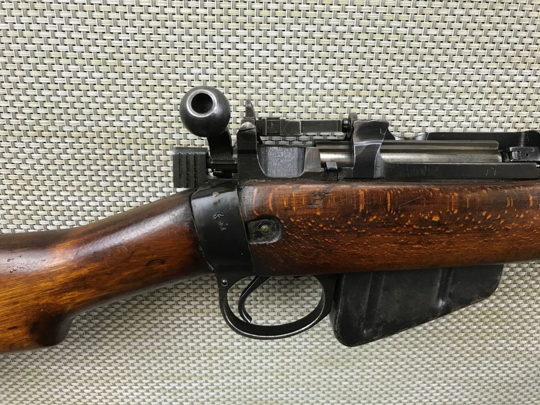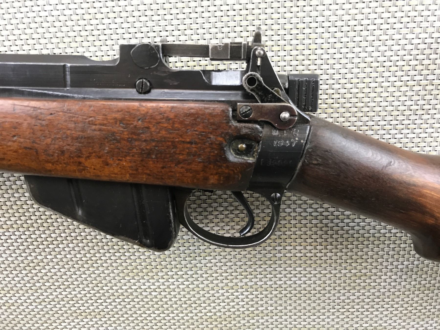 LEE ENFIELD , MODEL: NO 5 MK I JUNGLE CARBINE , CALIBER: 303 BR , COMES WITH MAGAZINE, DATED 1947, MATCHING SERIAL BOLT AND RECEIVER, EXCELLENT BORE, EQUIPPED WITH A MILITARY CANVAS SLING, ORIGINAL FLASH HIDER INTACT, BARLEY CORN FRONT SIGHT AND PEEP ADJUSTABLE REAR SIGHT, ARSENAL REPAIR OF THE STOCK AT THE HEEL, SHOWS SOME HANDLING MARKS , BARREL LENGTH: 19" , SERIAL # BJ9999 , STOCK # 8054 , CONDITION: 7/10 , CLASS: CANADIAN NON RESTRICTED CLASS