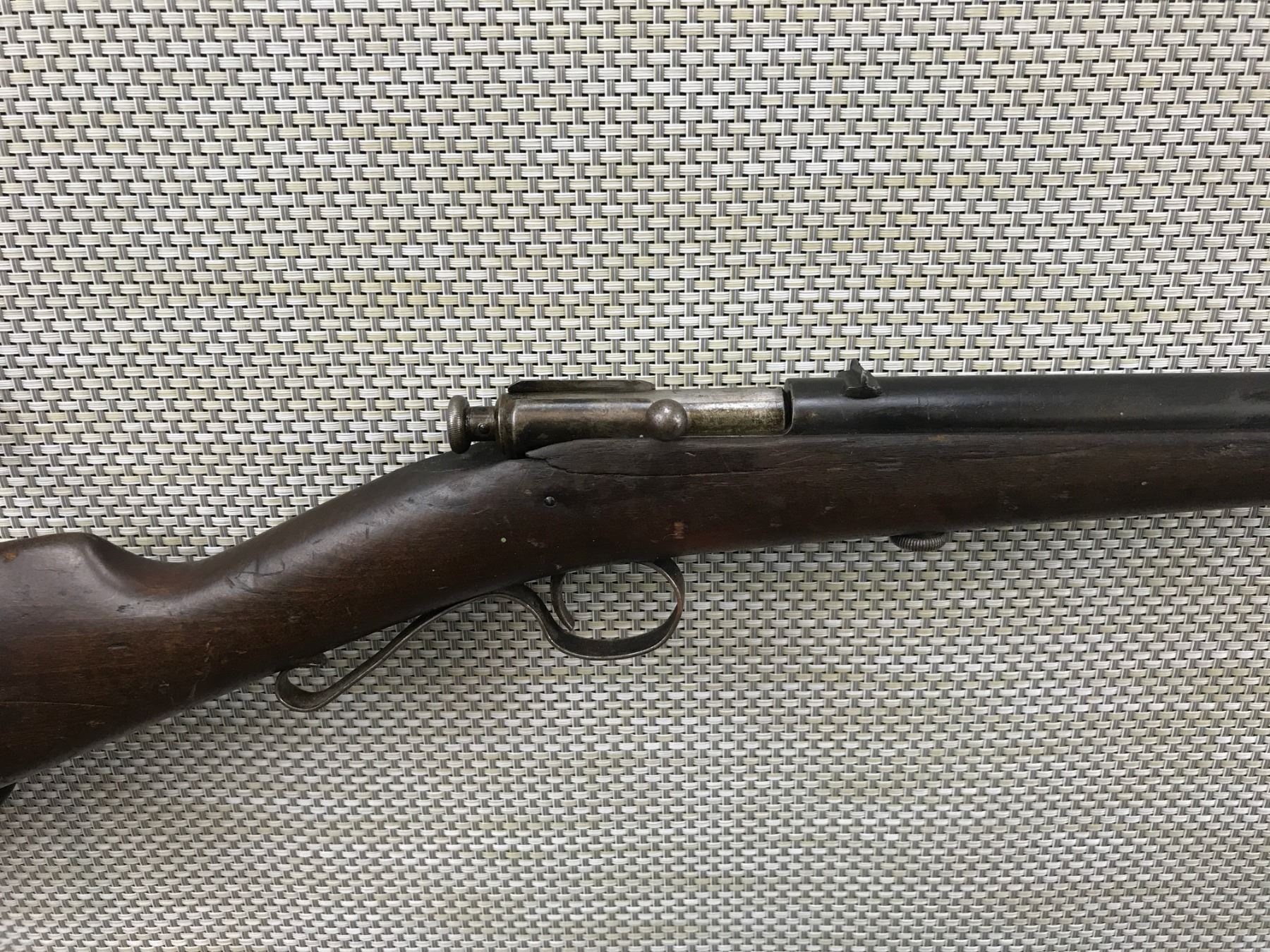 WINCHESTER , MODEL: 1902 , CALIBER: 22 SHORT LONG AND EXTRA LONG IS MARKED ON THE BARREL , DARK BORE, CRACKED AND CHIPPED BUTT STOCK AT THE WRIST, SHOWS EXTENSIVE HANDLING MARKS, PLASTIC BUTT PLATE , BARREL LENGTH: 18" , SERIAL # N/A , STOCK # 8058 , CONDITION: 4/10 , CLASS: CANADIAN NON RESTRICTED CLASS