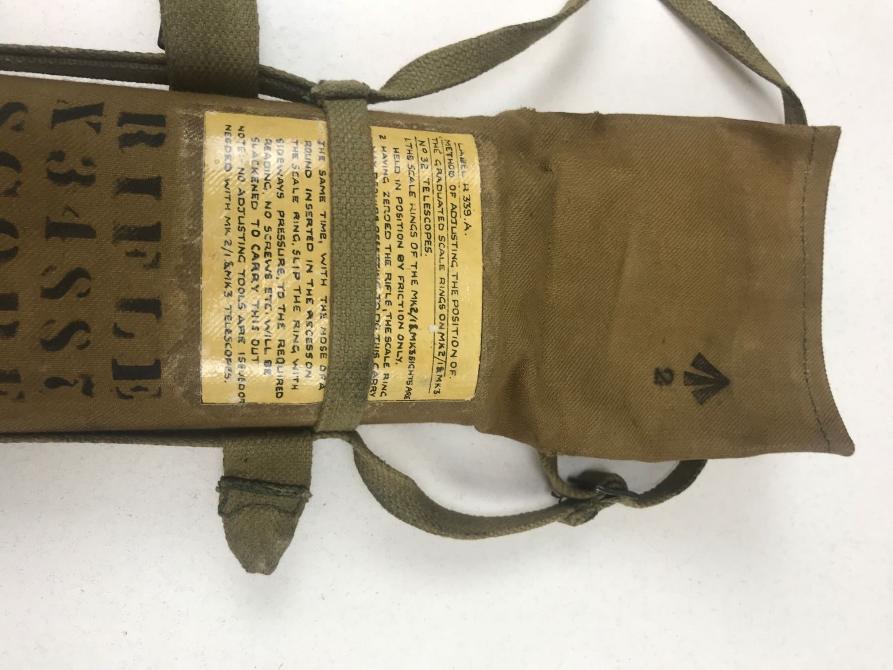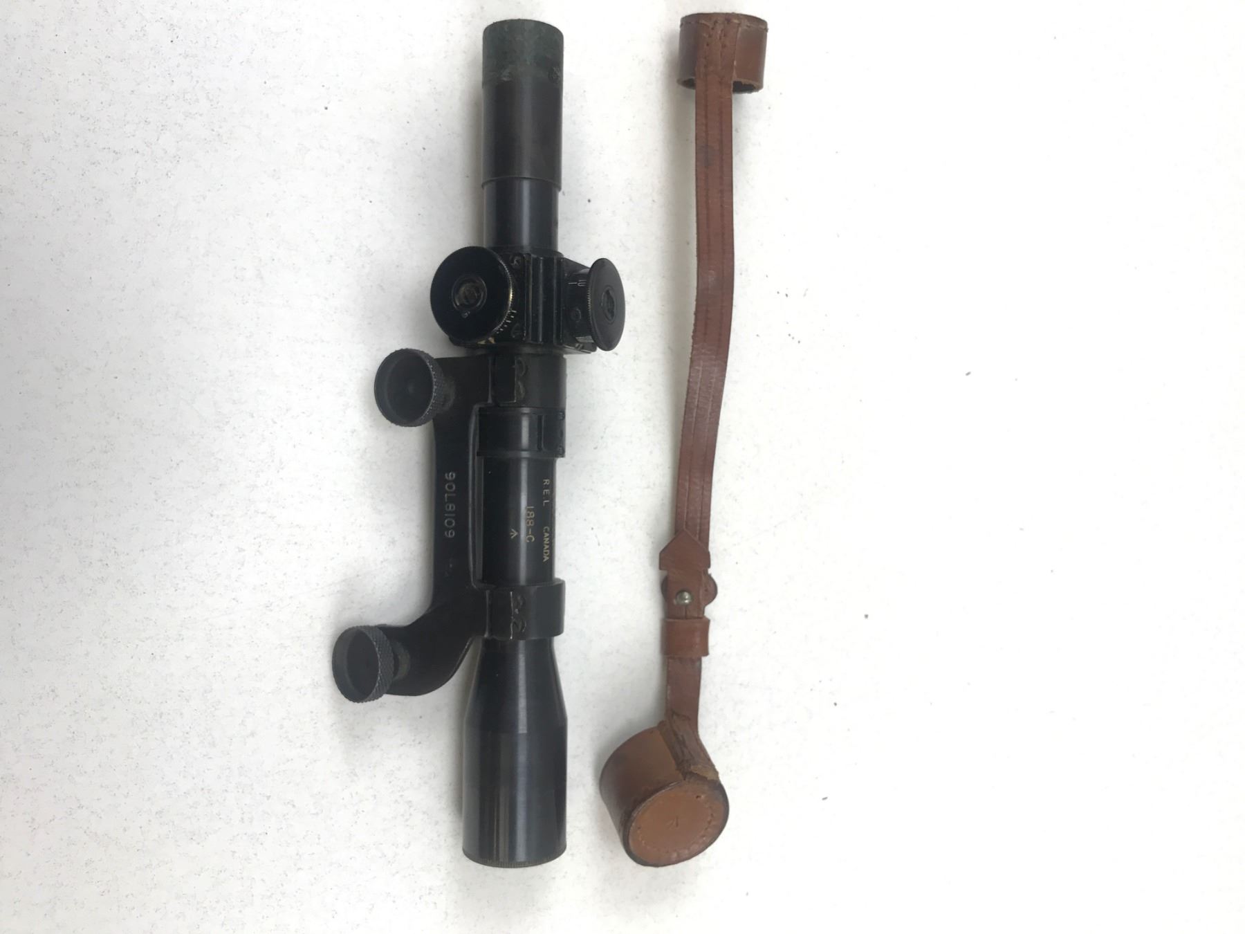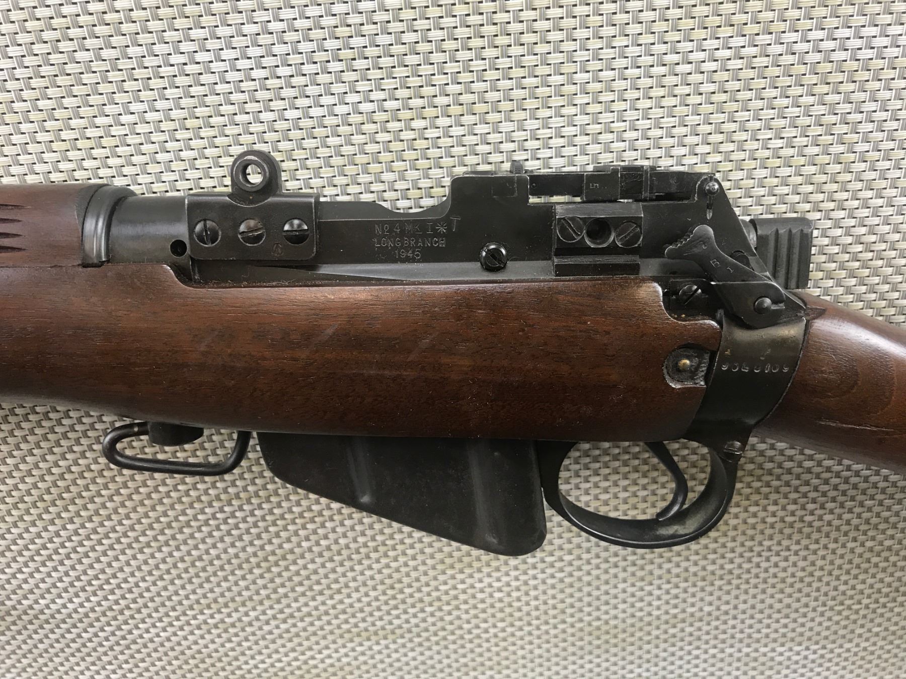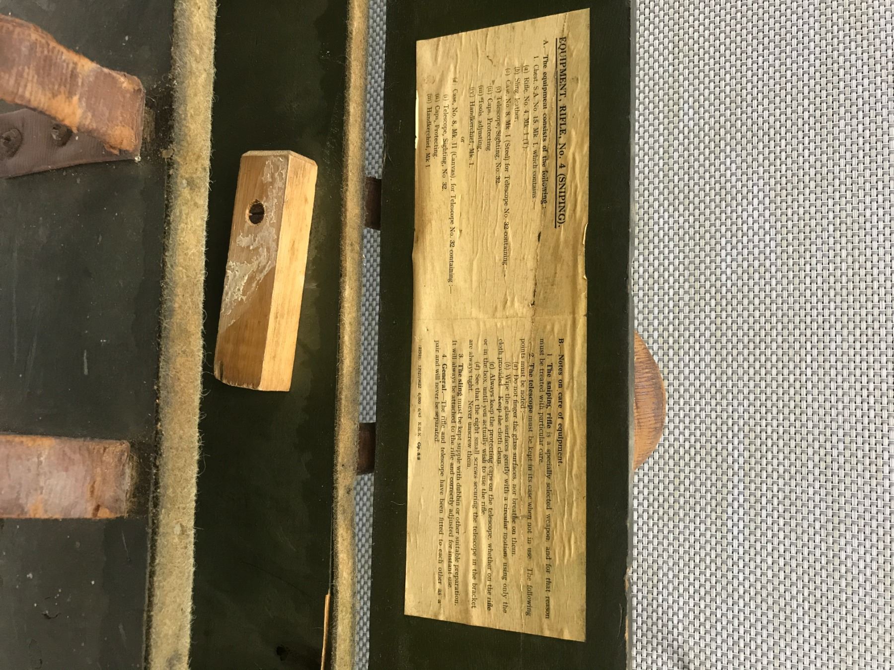 LEE ENFIELD , MODEL: NO 4 MKI*T , CALIBER: 303 BR , COMES WITH CORRECT WOOD TRANSIT CASE, MATCHING SERIALIZED SCOPE IN CANVAS COVER, AND A MAGAZINE, EXTREMELY RARE UNIQUE PIECE OF CANADIAN HISTORY, MADE IN TORONTO, BOLT SERIAL NUMBERS ARE NOT EASY TO DISCERN BUT APPEAR NOT TO MATCH BY SERIAL#, EXCELLENT BORE, HAS BRITISH BRD ARROW MARKS ON RIFLE, COMES COMPLETE WITH REL NO 32 MK III SCOPE IN A CANVAS CASE (CASE IS NOT MATCHING) WITH LEATHER SIGHT COVERS, RIFLE IS EQUIPPED WITH AN ARSENAL ADDED CHEEK PIECE, AND SCOPE MOUNTS, SHOWS VERY LITTLE HANDLING MARKS , BARREL LENGTH: 25 1/4" , SERIAL # 90L8109 , STOCK # 8073 , CONDITION: 9/10 , CLASS: CANADIAN NON RESTRICTED CLASS