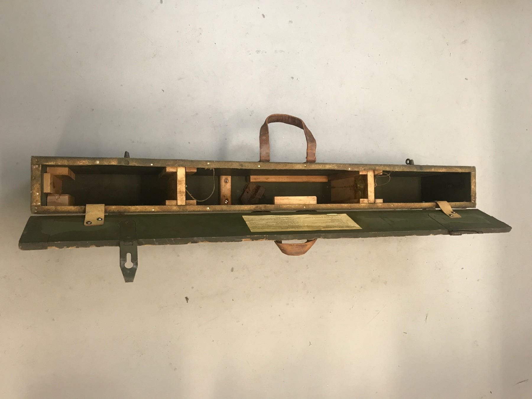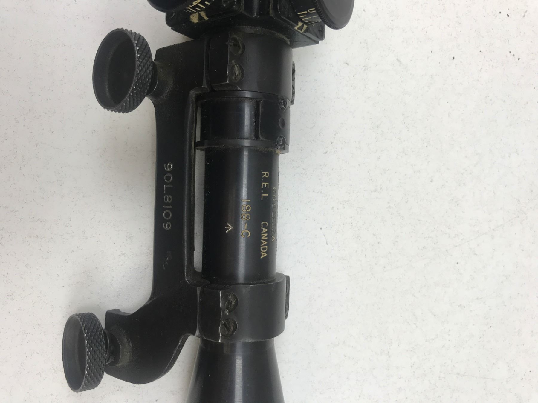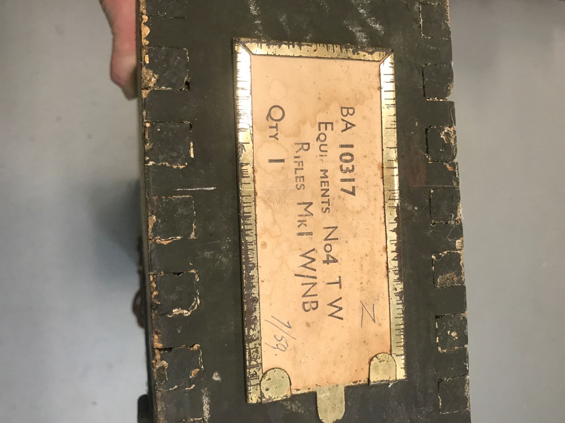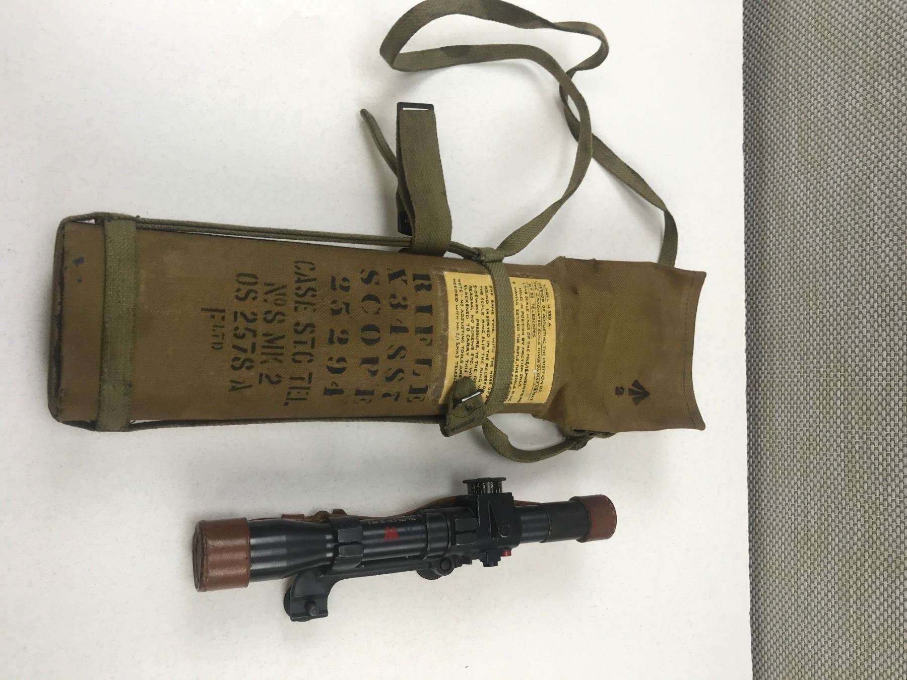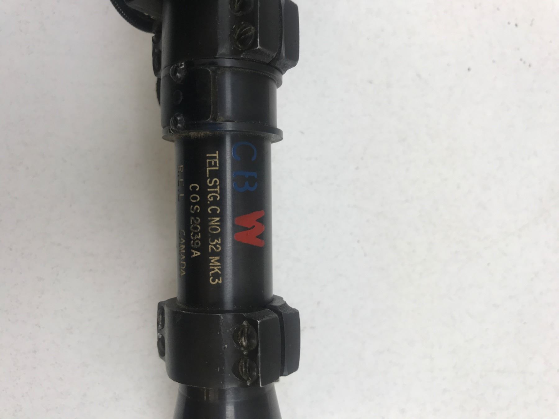 LEE ENFIELD , MODEL: NO 4 MKI*T , CALIBER: 303 BR , COMES WITH CORRECT WOOD TRANSIT CASE, MATCHING SERIALIZED SCOPE IN CANVAS COVER, AND A MAGAZINE, EXTREMELY RARE UNIQUE PIECE OF CANADIAN HISTORY, MADE IN TORONTO, BOLT SERIAL NUMBERS ARE NOT EASY TO DISCERN BUT APPEAR NOT TO MATCH BY SERIAL#, EXCELLENT BORE, HAS BRITISH BRD ARROW MARKS ON RIFLE, COMES COMPLETE WITH REL NO 32 MK III SCOPE IN A CANVAS CASE (CASE IS NOT MATCHING) WITH LEATHER SIGHT COVERS, RIFLE IS EQUIPPED WITH AN ARSENAL ADDED CHEEK PIECE, AND SCOPE MOUNTS, SHOWS VERY LITTLE HANDLING MARKS , BARREL LENGTH: 25 1/4" , SERIAL # 90L8109 , STOCK # 8073 , CONDITION: 9/10 , CLASS: CANADIAN NON RESTRICTED CLASS