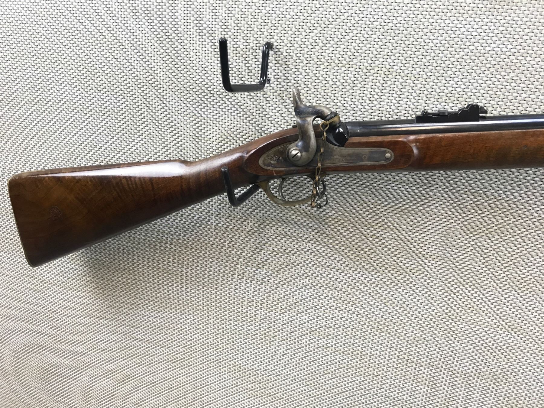 PARKER HALE , MODEL: 1853 ENFIELD REPLICA , CALIBER: 577 CAL , COMES WITH MANUAL, WOODEN MUZZLE PROTECTOR, GOOD BORE, BLADE FRONT AND ADJUSTABLE REAR SIGHTS, ORIGINAL RAM ROD, 3 BARREL BANDS, WITH FRONT SLING SWIVEL, TRIGGER GUARD MOUNTED REAR SLING SWIVEL, NIPPLE PROTECTER ON CHAIN, BRASS BUTT PLATE, SHOWS VERY LITTLE HANDLING MARKS, LOCK IS MARKED 1853/ENFIELD, A BEAUTIFUL REPRODUCTION OF A CLASSIC FIREARM , BARREL LENGTH: 39" , SERIAL # N/A , STOCK # 8084 , CONDITION: 9/10 , CLASS: CANADIAN NON RESTRICTED CLASS