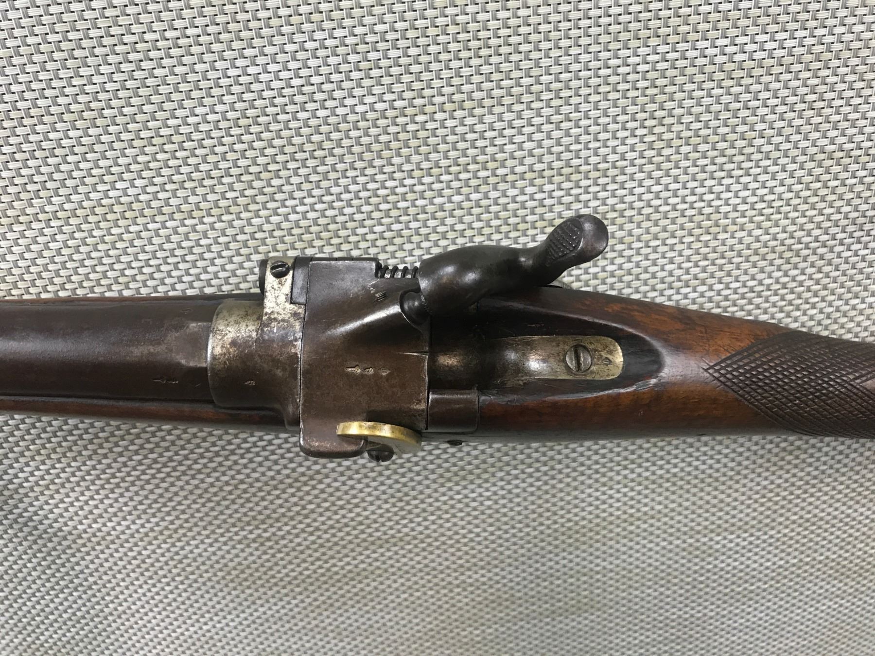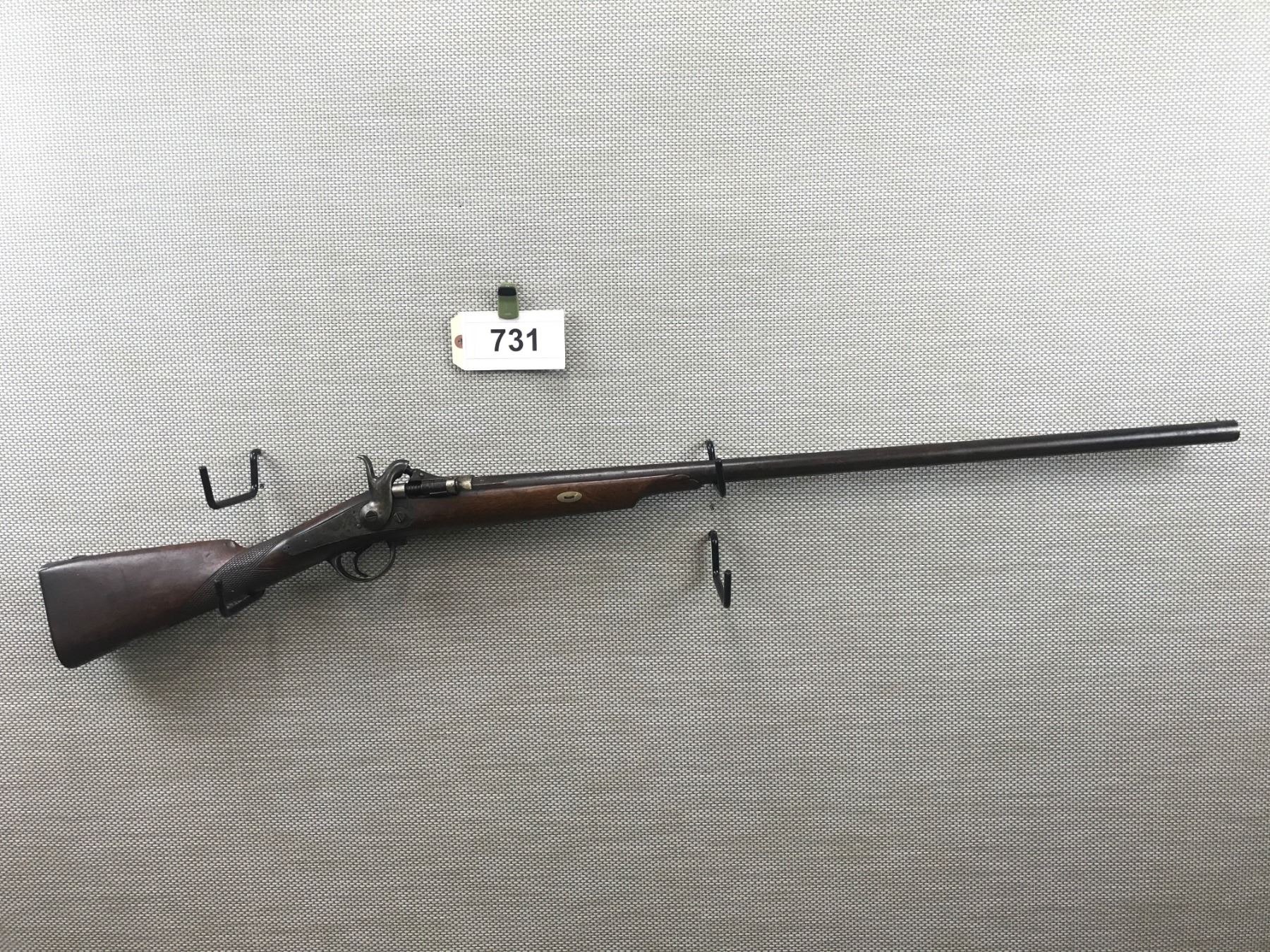 ZULU , MODEL: BREACH BLOCK , CALIBER: 12GA X 2 3/4" , BORE IS DARK, BEAD FRONT SIGHT, CHECKERED STRAIGHT GRIP STOCK WITH STEEL BUTT PLATE, BELGIAN PROOF MARKS, UNIQUE BRASS LOCKING LEVER FOR THE ACTION , BARREL LENGTH: 32" , SERIAL # 4003 , STOCK # 8100 , CONDITION: 5/10 , CLASS: CANADIAN NON RESTRICTED CLASS
