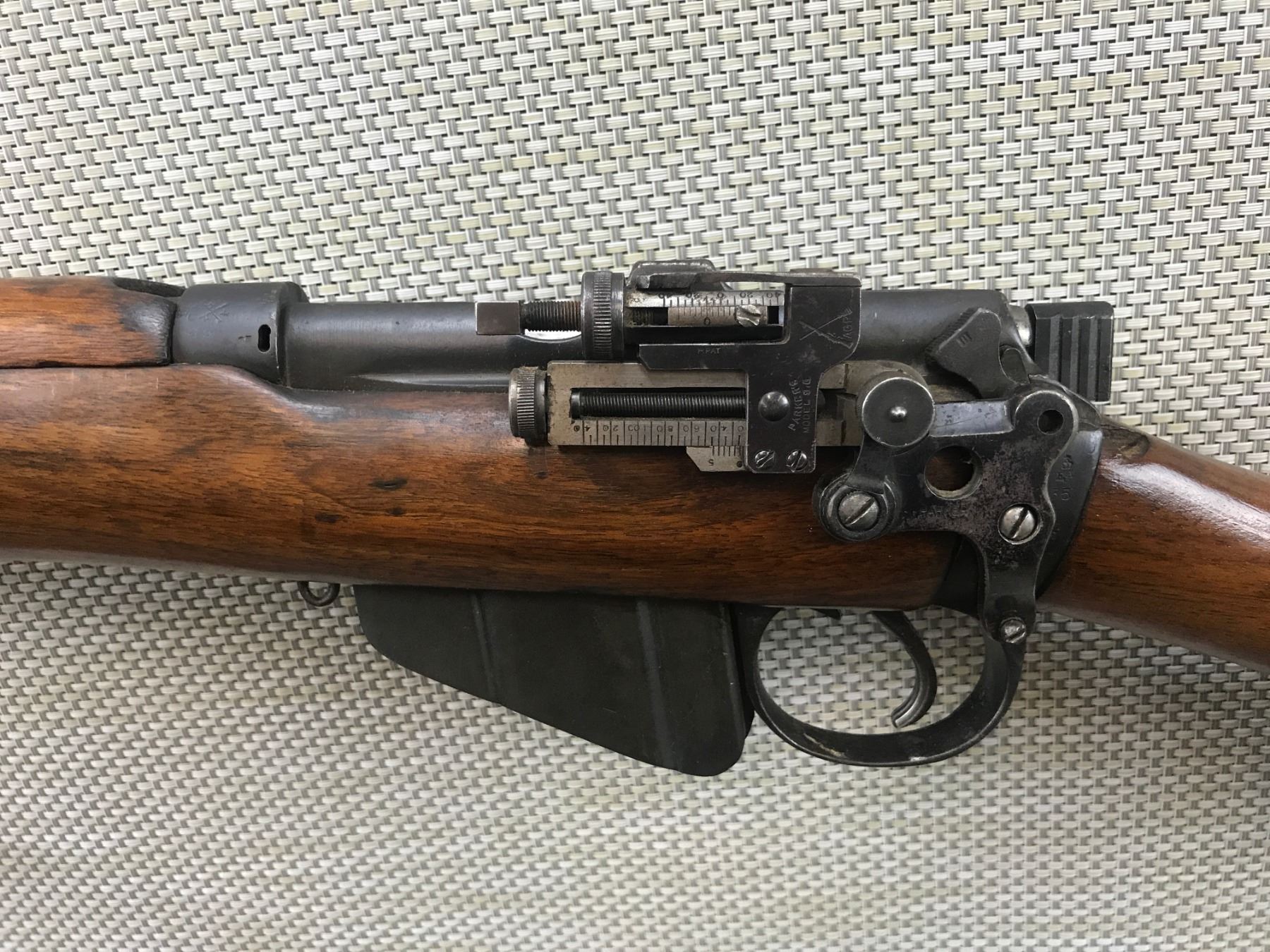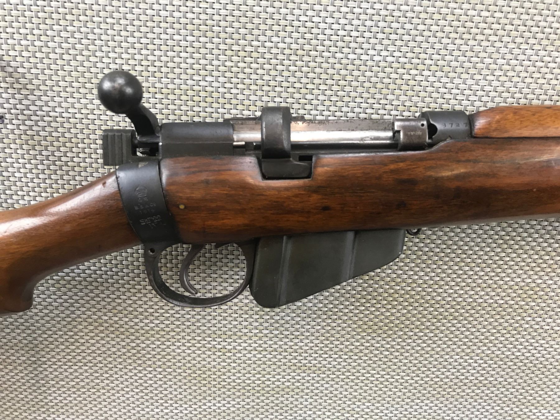 LEE ENFIELD , MODEL: 22 MK 4* , CALIBER: 22 LR , COMES WITH A STANDARD NO 1 MK III MAGAZINE, WWI ERA MADE BY BSA IN 1914, DARK BORE, PARKER MODEL 9G SIDE MOUNTED PEEP SIGHT, SLING LOOPS, RETAINS FULL MILITARY CONFIGURATION , BARREL LENGTH: 25 1/2" , SERIAL # Y3727 , STOCK # 8105 , CONDITION: 6/10 , CLASS: CANADIAN NON RESTRICTED CLASS