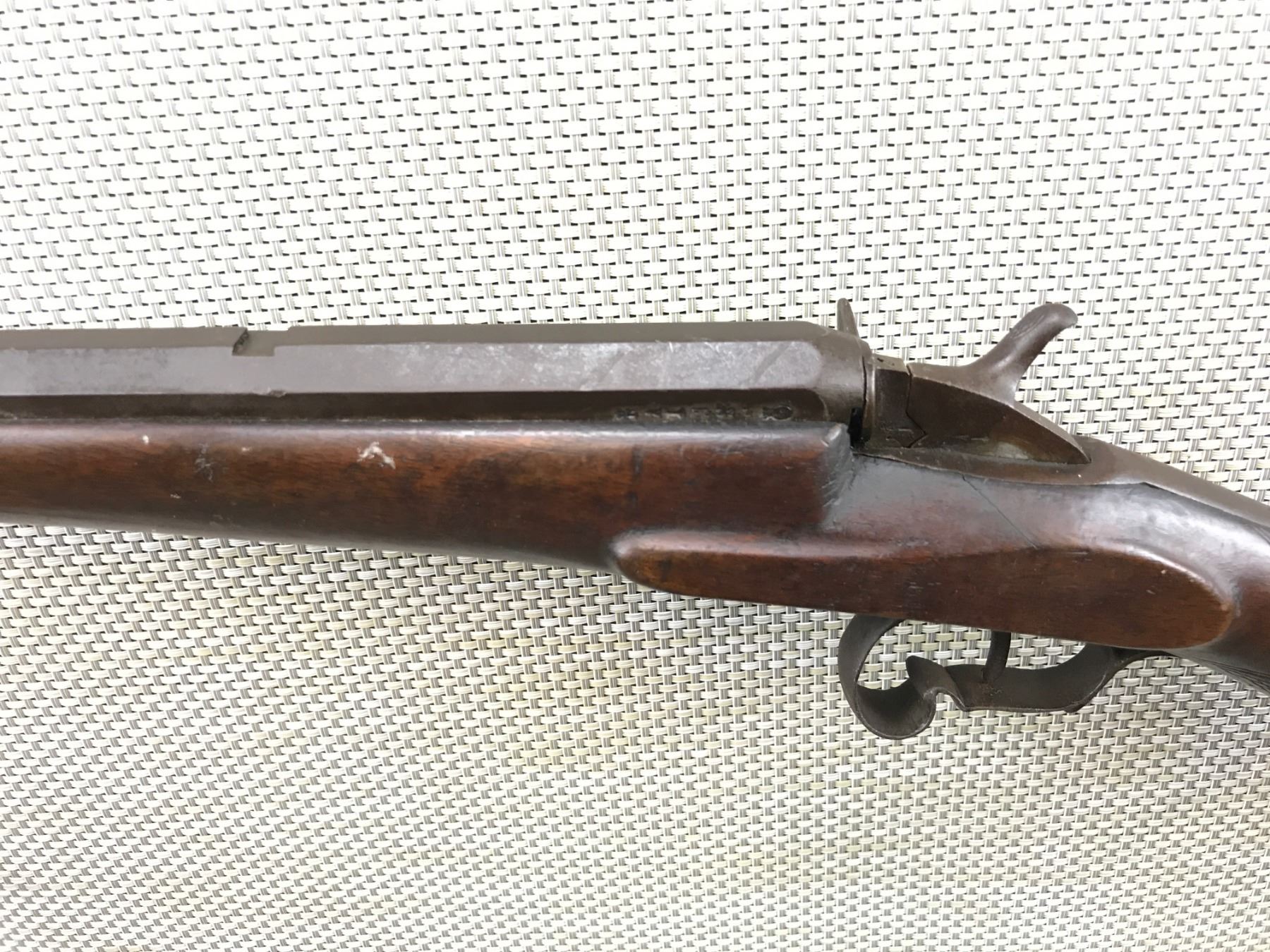 UNKNOWN BELGIAN , MODEL: FLOBERT , CALIBER: 22 LONG , OCTAGONAL BARREL, BORE IS GOOD, DOVETAIL FRONT AND MISSING THE REAR SIGHT, FANCY TRIGGER GUARD, MISSING THE FIRING PIN, HAMMER DOES NOT STAY IN COCKED POSITION, CHECKERED SEMI PISTOL GRIP BUTT STOCK WITH STEEL BUTT PLATE, EXTENSIVE BELGIAN PROOFS , BARREL LENGTH: 24 3/4" , SERIAL # N/A , STOCK # 8126 , CONDITION: 3/10 , CLASS: CANADIAN NON RESTRICTED CLASS