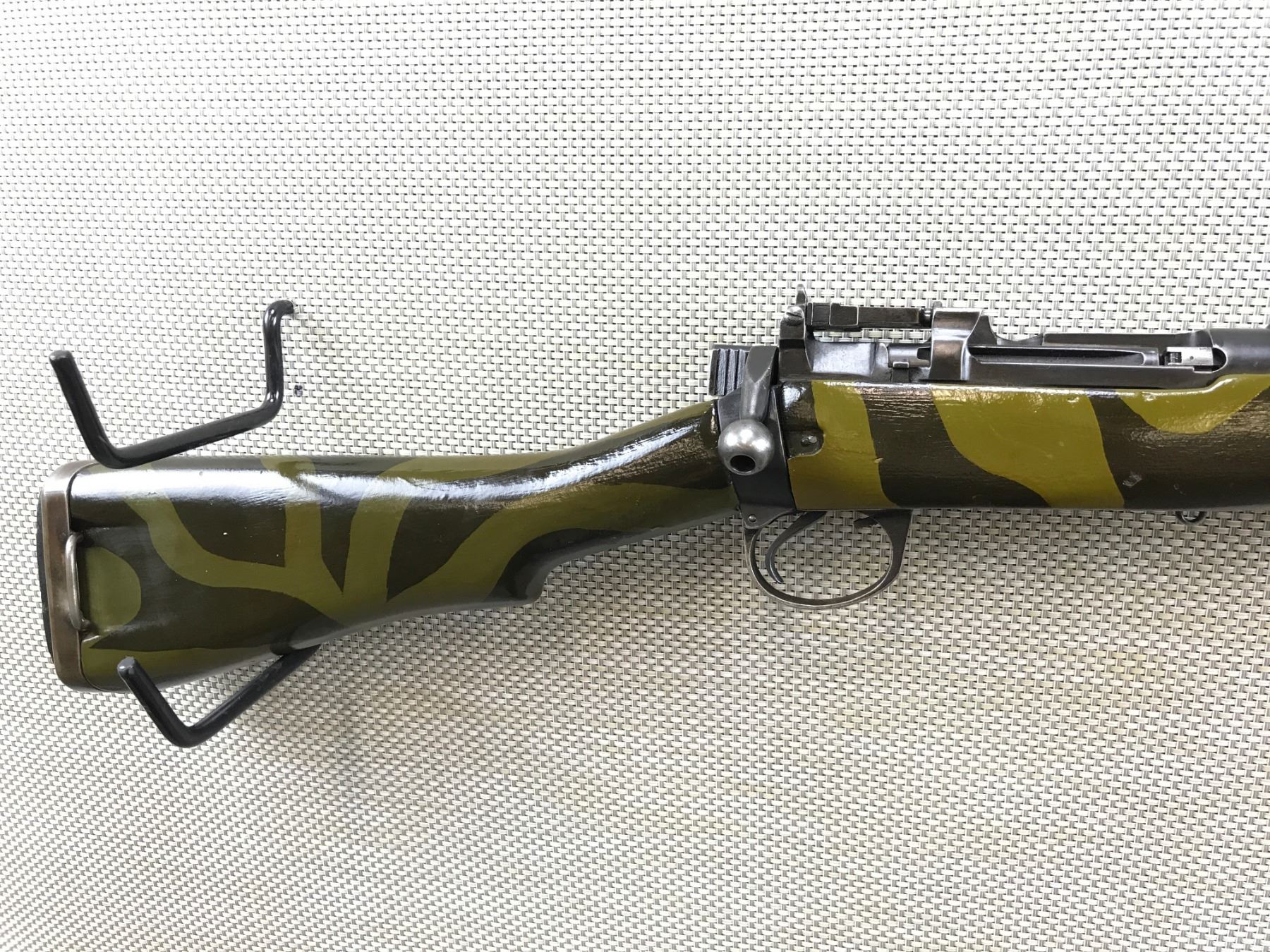 LEE ENFIELD , MODEL: NO 5 JUNGLE CARBINE , CALIBER: 303 BR , DOES NOT COME WITH MAGAZINE, BOLT AND RECEIVER DO NOT MATCH BY SERIAL #, ORIGINAL MILITARY MARKINGS HAVE BEEN REMOVED, BARLEY CORN FRONT AND PEEP APERTURE REAR SIGHT, SYNTHETIC PAINTED STOCK, SLING SWIVEL LOOPS, BORE IS VERY GOOD, SHOWS SOME HANDLING MARKS , BARREL LENGTH: 20" , SERIAL # A4375 , STOCK # 8133 , CONDITION: 5/10 , CLASS: CANADIAN NON RESTRICTED CLASS