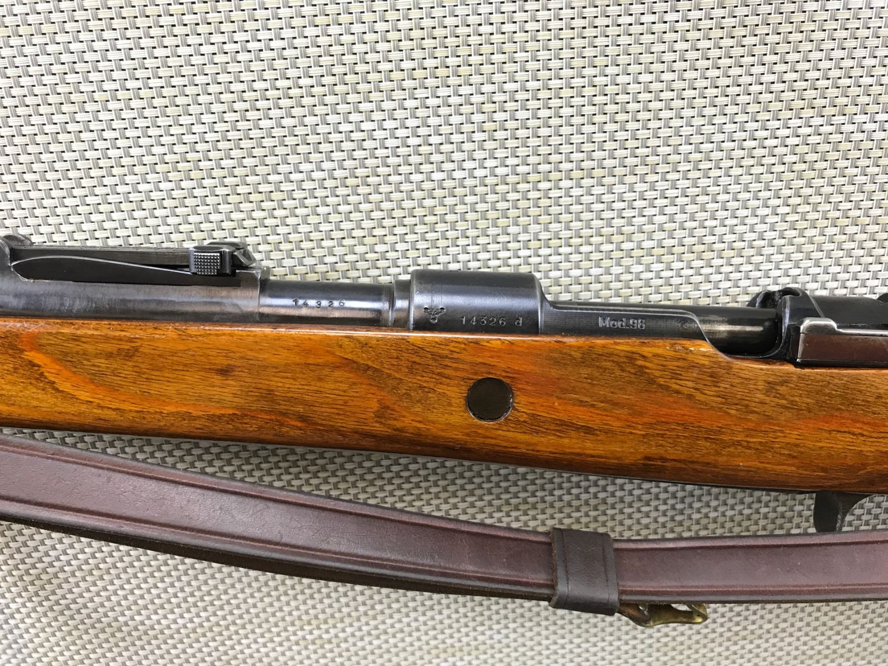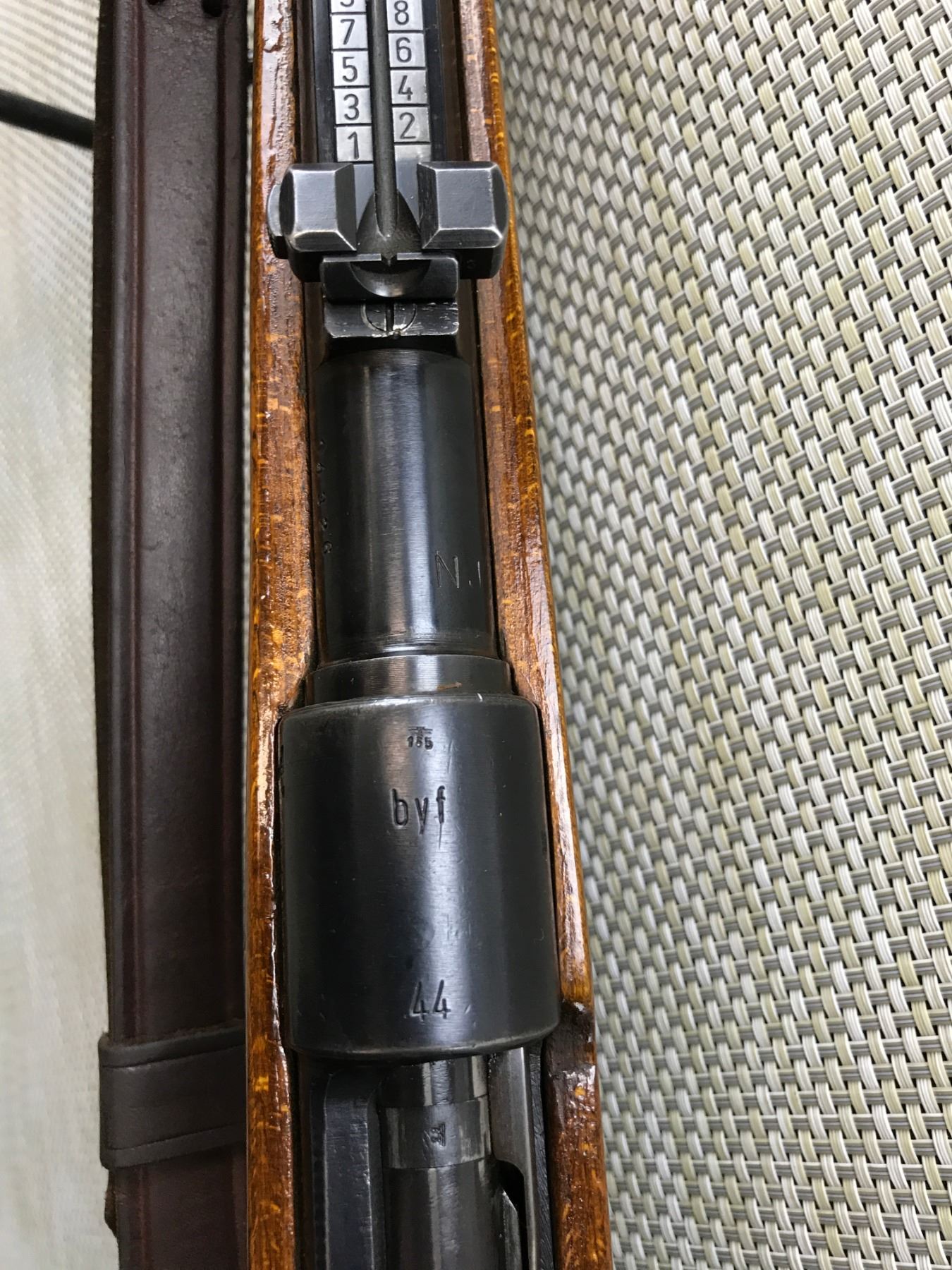 WWII ERA, MAUSER , MODEL: 98K , CALIBER: 8MM MAUSER , MARKED BYF DATED 1944, BORE IS VERY GOOD, BOLT AND RECEIVER MATCH BY SERIAL #, ORIGINAL WWII GERMAN MILITARY MARKS, LEATHER SLING, BLADE FRONT AND ADJUSTBALE REAR SIGHTS, RETAINS FULL MILITARY CONFIGURATION, SHOWS SOME HANDLING MARKS , BARREL LENGTH: 23" , SERIAL # 14326D , STOCK # 8136 , CONDITION: 8/10 , CLASS: CANADIAN NON RESTRICTED CLASS