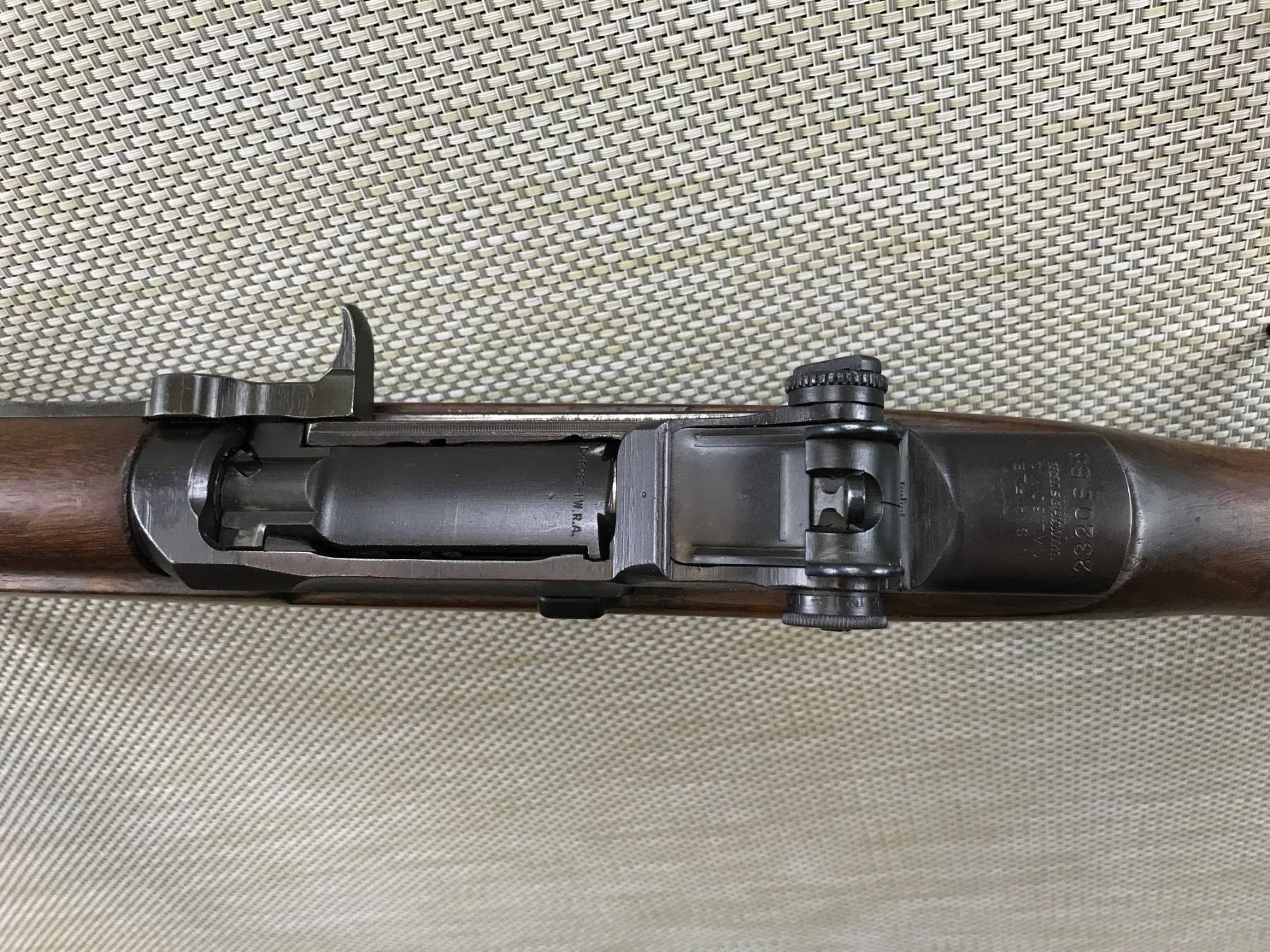US RIFLE , MODEL: M1 GARAND , CALIBER: 30 M1 , MADE BY WINCHESTER, WORN RIFLING WITH LIGHT PITTING, BARLEY CORN FRONT AND PEEP REAR SIGHT, RETAINS FULL MILITARY CONFIGURATION, SHOWS SOME HANDLING MARKS , BARREL LENGTH: 23 1/2" , SERIAL # 2320885 , STOCK # 8137 , CONDITION: 6/10 , CLASS: CANADIAN NON RESTRICTED CLASS