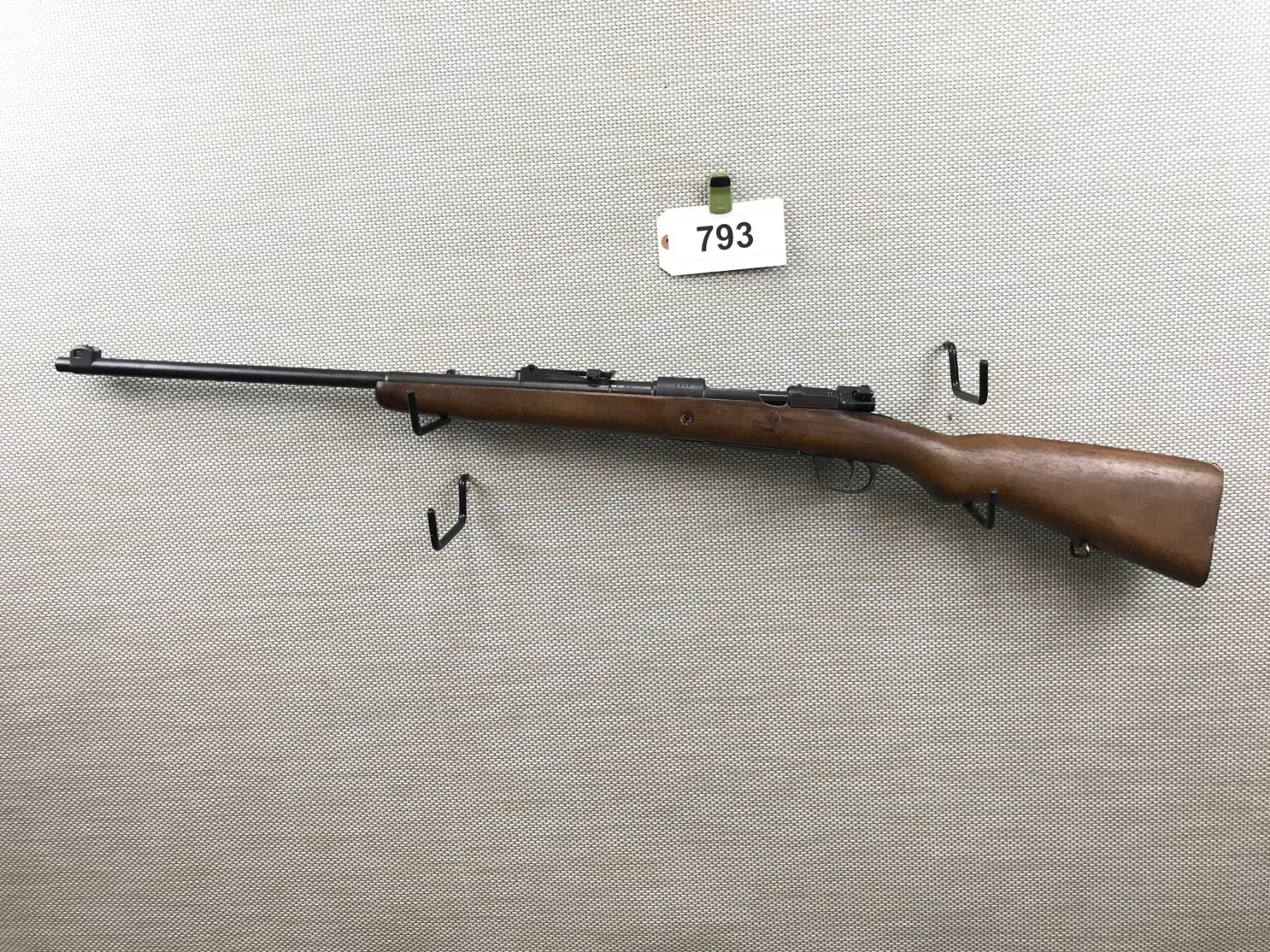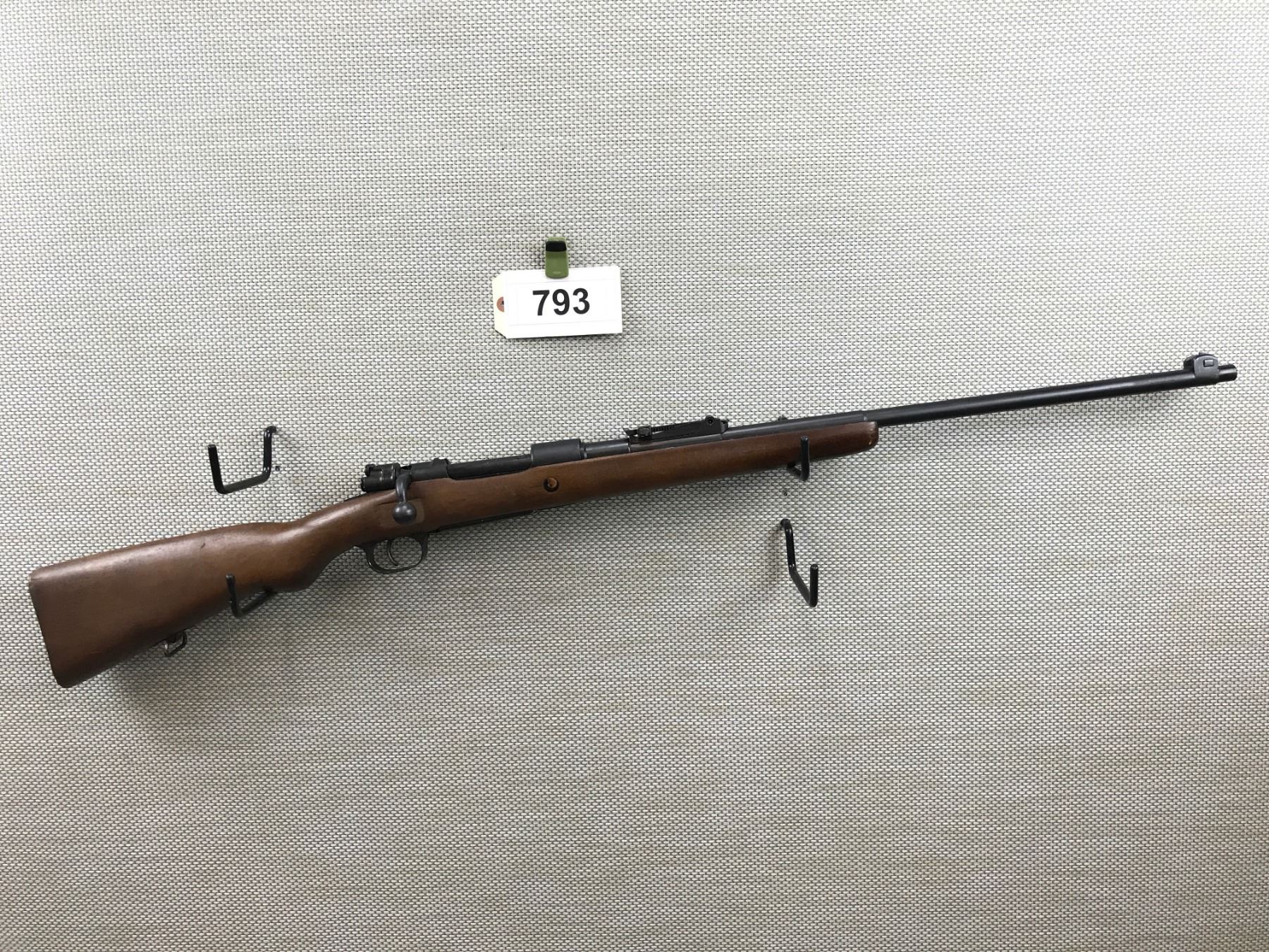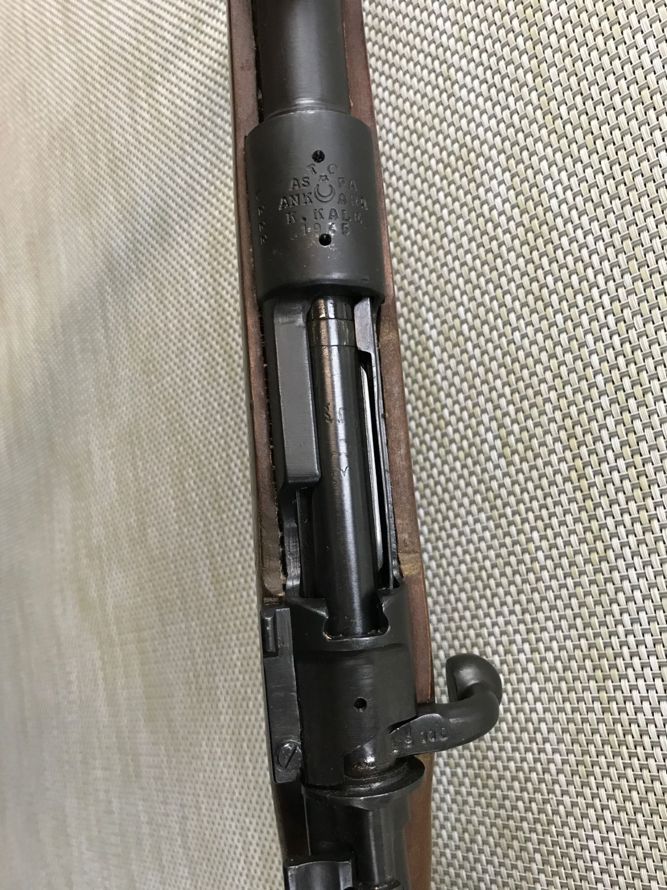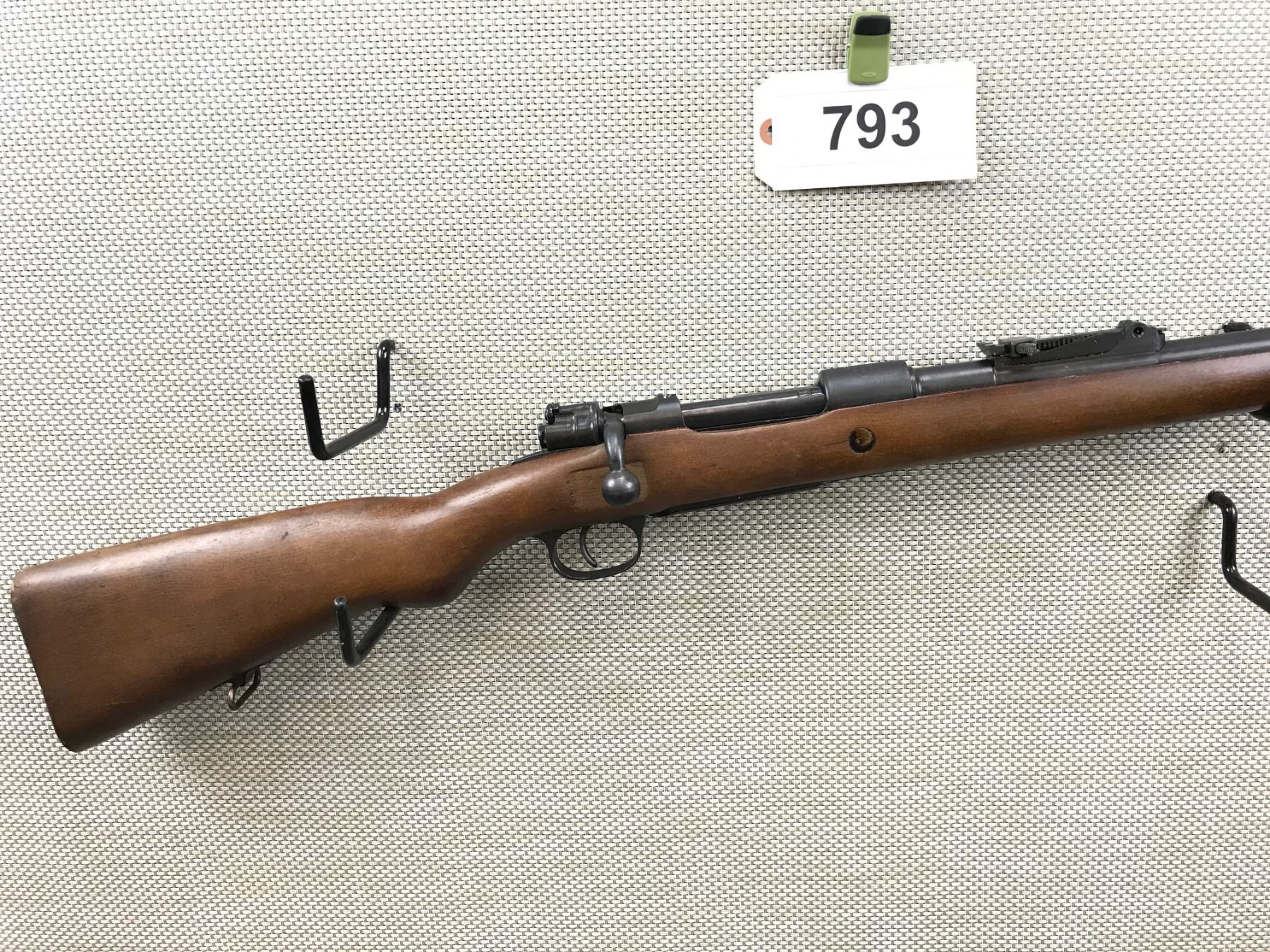 MAUSER , MODEL: SPORTER , CALIBER: 8MM MAUSER , TURKISH MAUSER, BORE IS VERY GOOD, BARLEY CORN FRONT AND ADJUSTABLE REAR SIGHTS, ACTION IS DRILLED FOR SCOPE MOUNTS AND APPEARS TO BE REBLUED, STOCK IS CRACKED AT THE WRIST AND CHIPPED AT THE HEAL, MISSING THE FRONT SLING SWIVEL, STEEL BUTT PLATE, SHOWS SOME HANDLING MARKS , BARREL LENGTH: 25" , SERIAL # 8222 , STOCK # 8162 , CONDITION: 4/10 , CLASS: CANADIAN NON RESTRICTED CLASS
