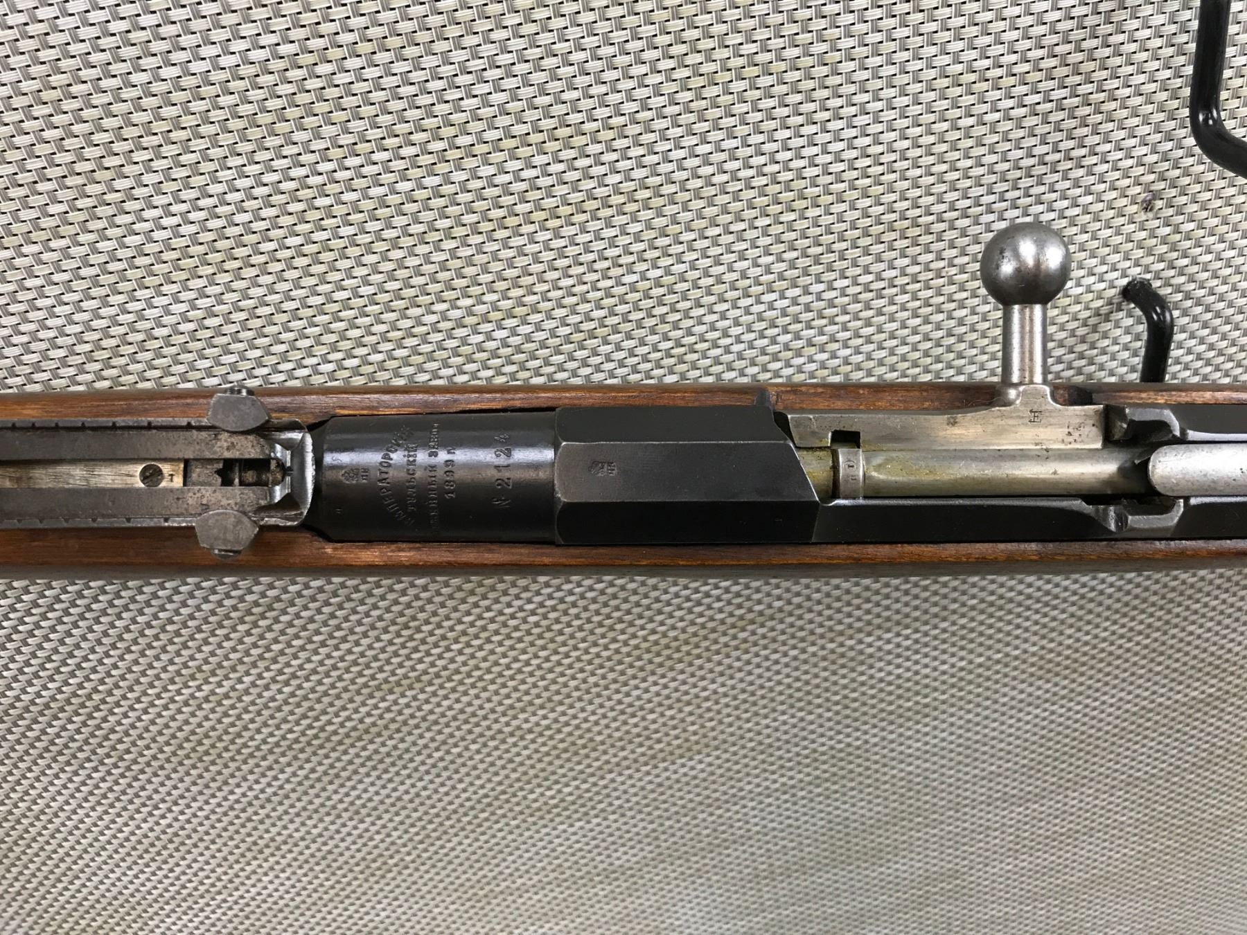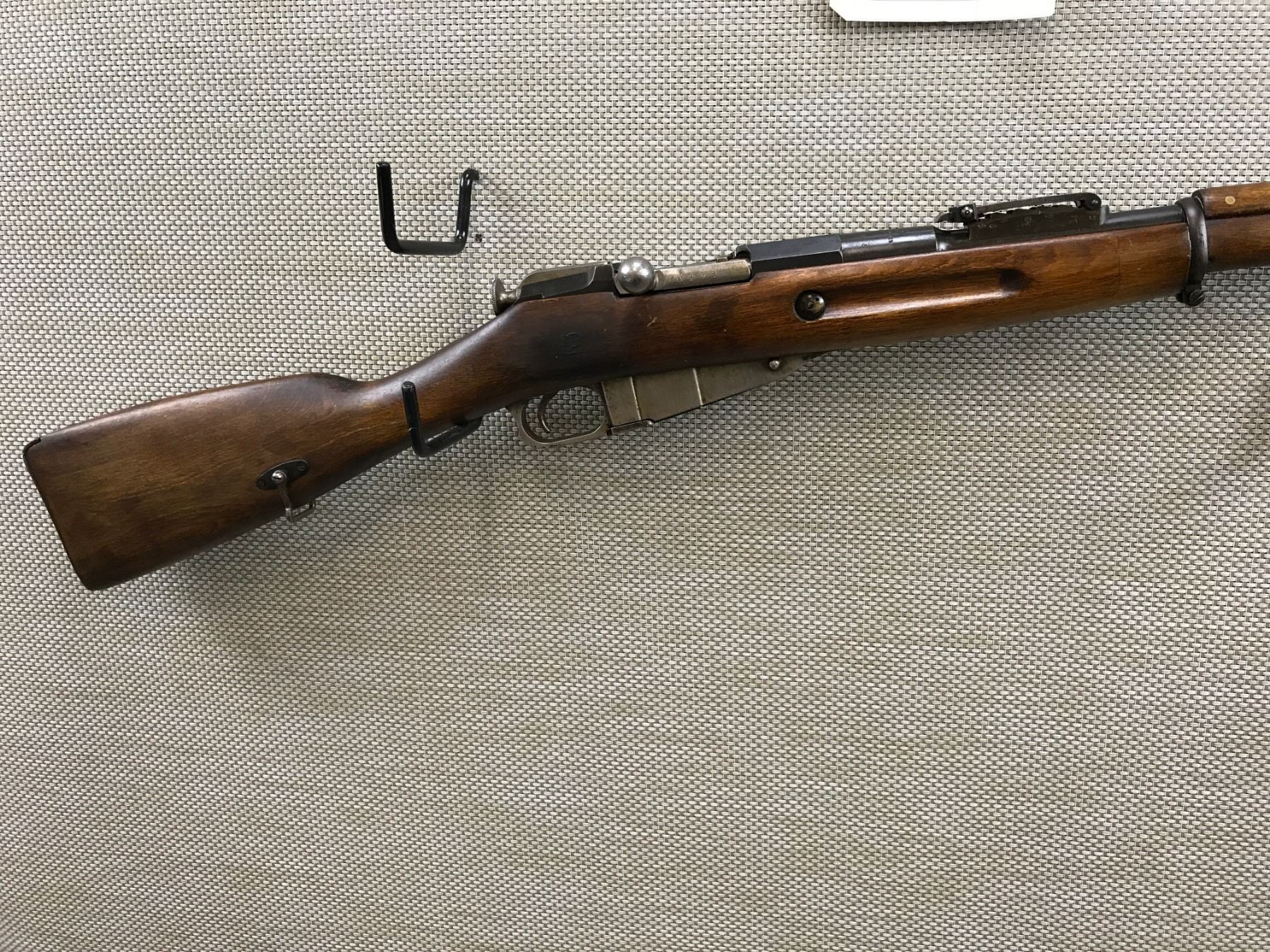 MOSIN NAGANT , MODEL: 1891 , CALIBER: 7.62 X 54R , MANUFACTURED BY THE TULA ARSENAL DATED 1899, AND REWORKED AT THE FINNISH SA ARSERNAL SA IN A ROUNDED CORNER SQUARE IS THE FINNISH ARMY PROPERTY MARK SUOMEN ARMEIJA -- AN ARSENAL WOULD BE AV1, AV2, AV3 ON THE RECEIVER HEXAGON FLAT, BORE IS DARK, BOLT AND RECEIVER ARE NOT MATCHING BY SERIAL #, SHOWS SOME HANDLING MARKS, RETAINS FULL MILITARY CONFIGURATION, BLADE FRONT AND ADJUSTABLE REAR SIGHTS , BARREL LENGTH: 31" , SERIAL # N2124 , STOCK # 8184 , CONDITION: 6/10 , CLASS: CANADIAN NON RESTRICTED CLASS