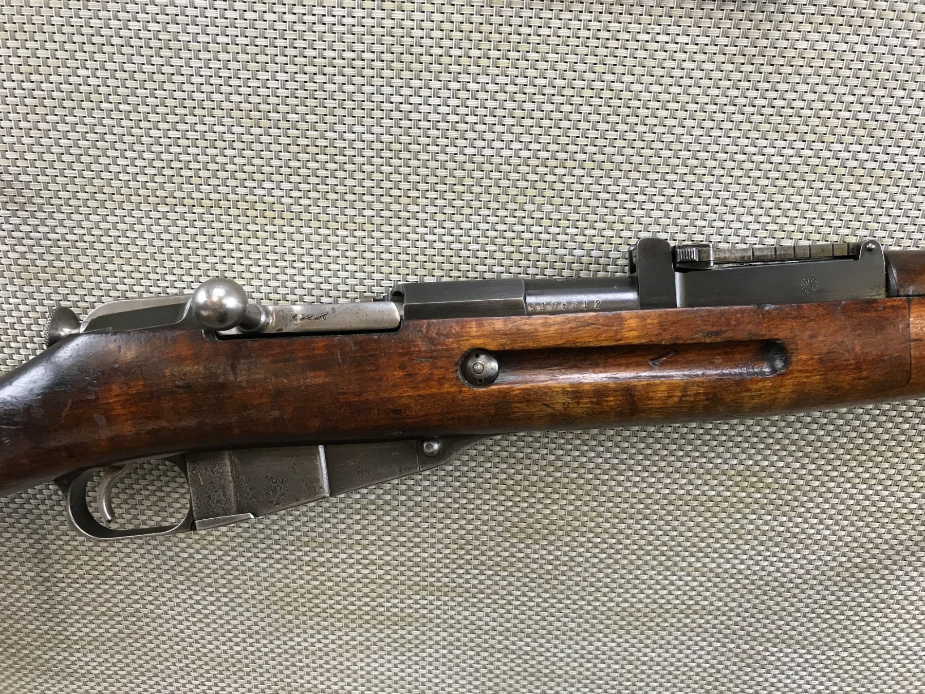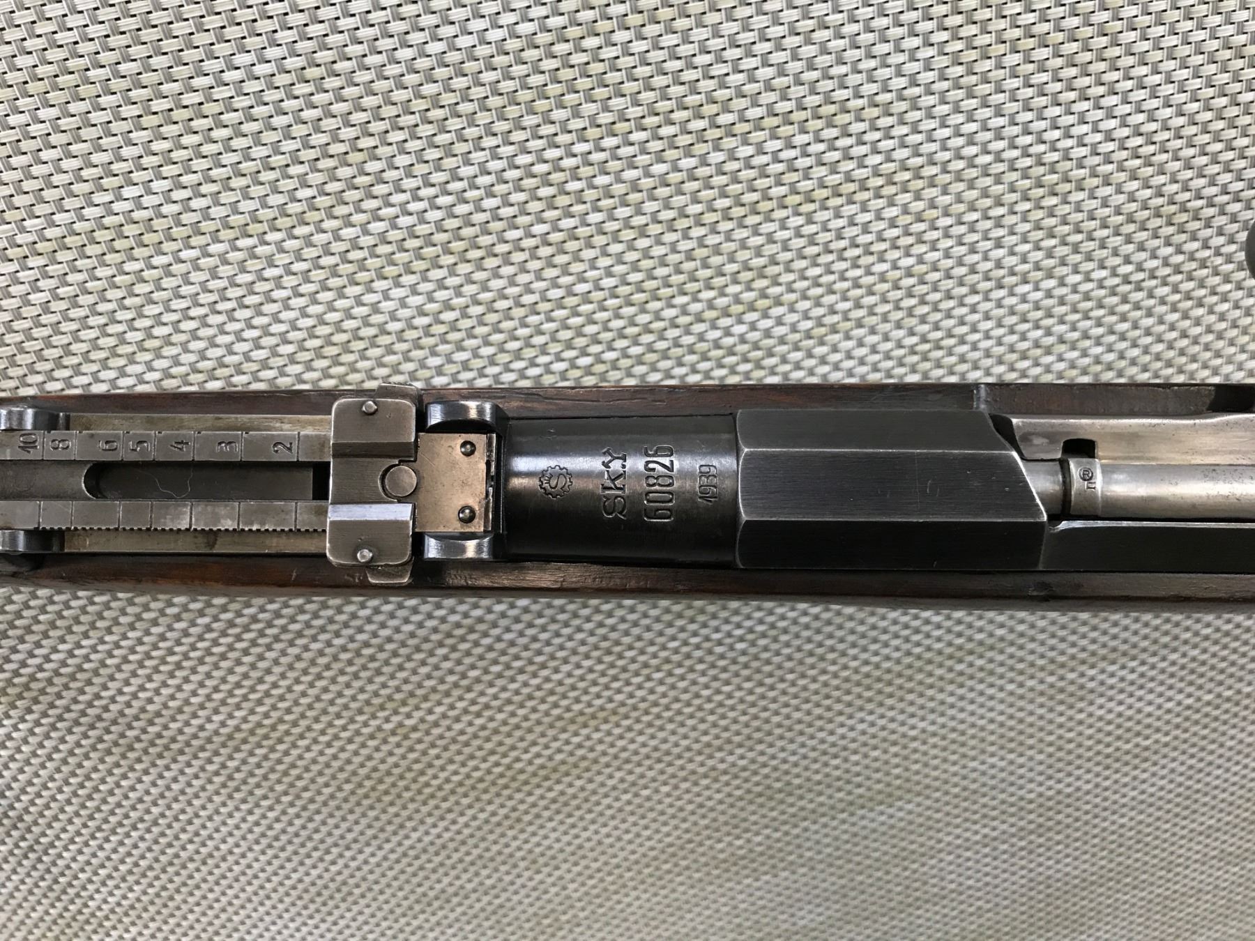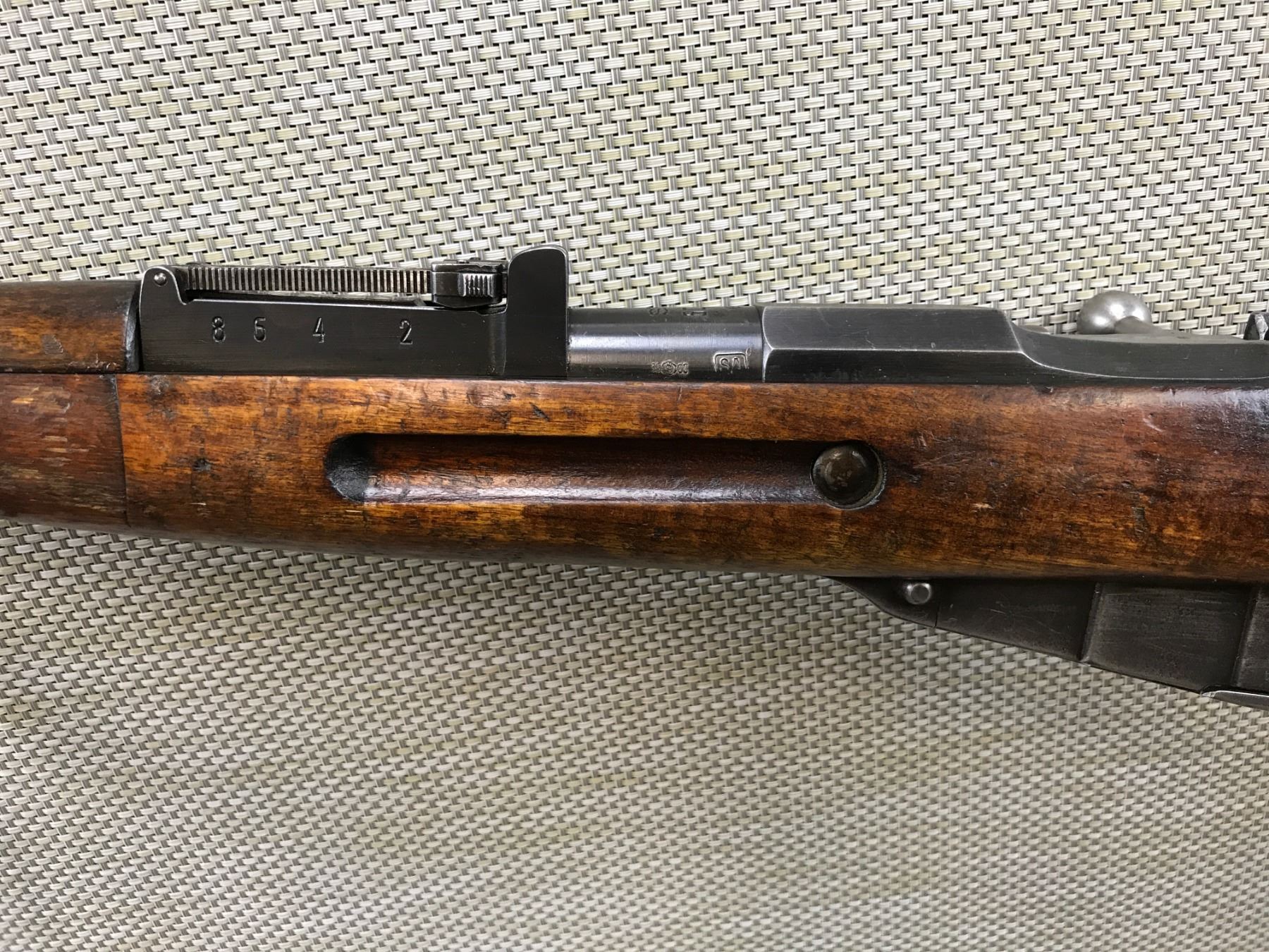 MOSIN NAGANT , MODEL:28/30, CALIBER: 7.62 X 54R ,RECEIVER AND BOLT MATCH BY SERIAL # WITH ADDITIONAL #'S CROSSED OUT ON THE BOLT, DATED 1939, , LEATHER SLING LOOPS, BARLEY CORN FRONT SIGHT AND ADJUSTABLE REAR SIGHT, SHOWS SOME HANDLING MARKS AND SOME LIGHT SURFACE PITTING, GOOD BORE WITH MINOR WEAR OF RIFLING, BARREL LENGTH: 27" , SERIAL # 60826 , STOCK # 8193 , CONDITION: 6/10 , CLASS: CANADIAN NON RESTRICTED CLASS