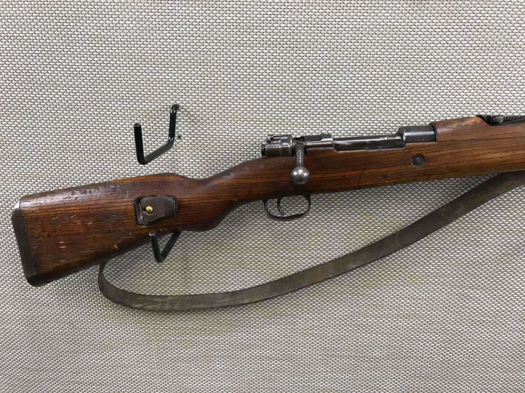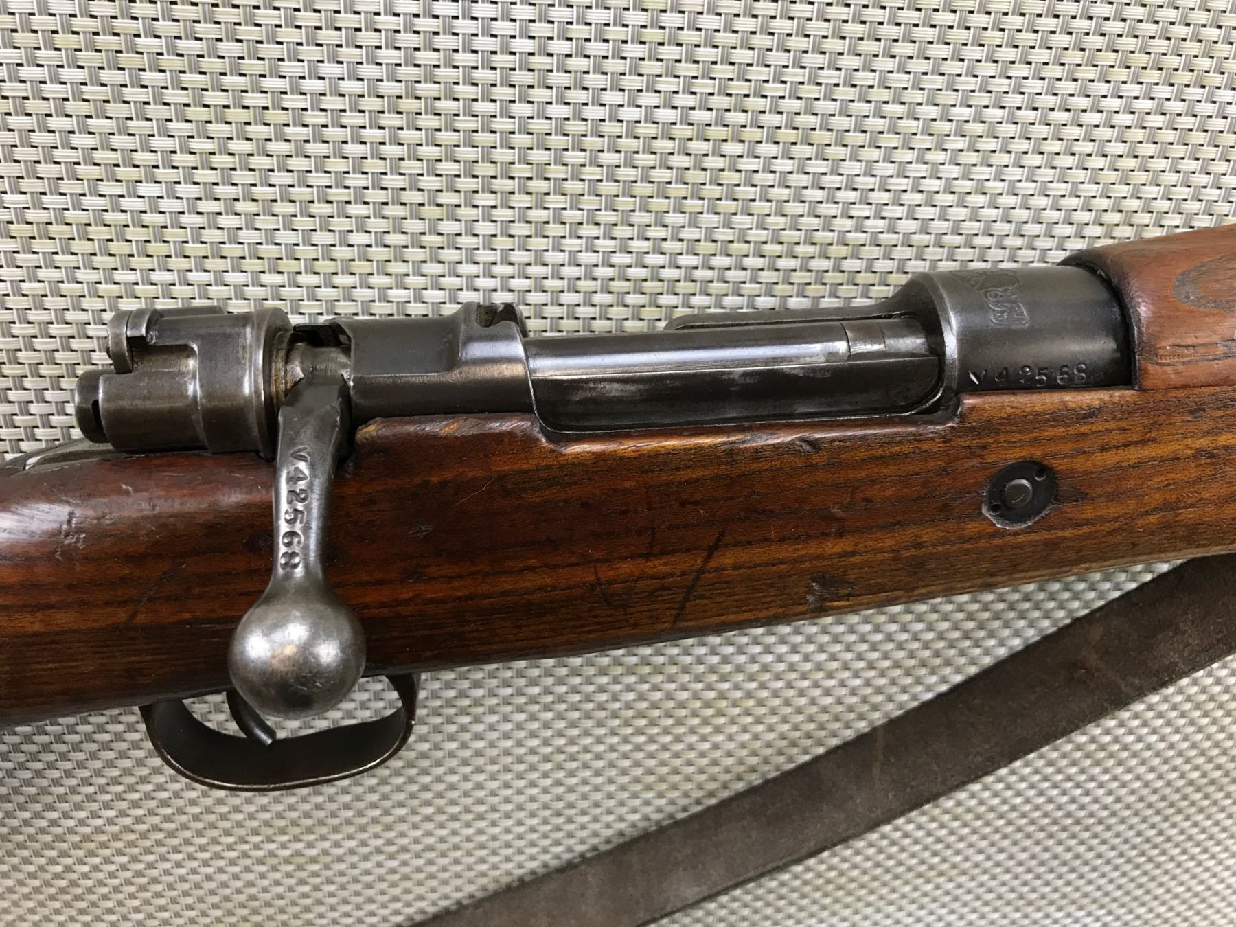 MAUSER , MODEL: 1948 SYRIAN SHORT RIFLE , CALIBER: 8MM MAUSER , BOLT AND RECEIVER ARE MATCHING BY SERIAL # , SYRIAN CREST, EXCELLENT BORE, RETAINS FULL MILITARY CONFIGURATION, LEATHER SLING, RAMP FRONT AND ADJUSTABLE REAR SIGHTS, SHOWS SOME HANDLING MARKS , BARREL LENGTH: 24" , SERIAL # V42568 , STOCK # 8194 , CONDITION: 6/10 , CLASS: CANADIAN NON RESTRICTED CLASS