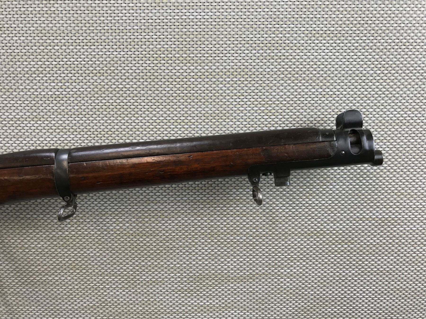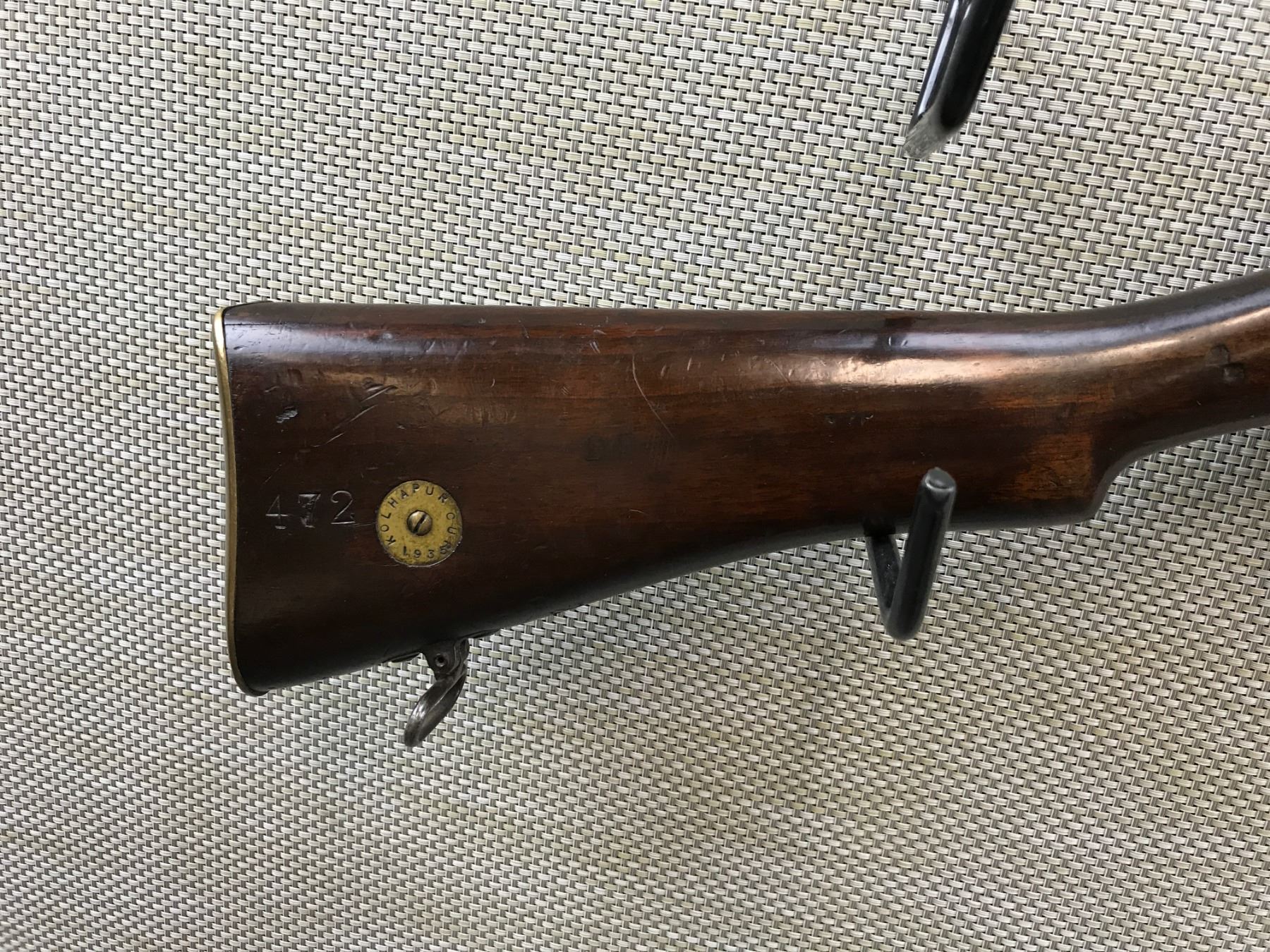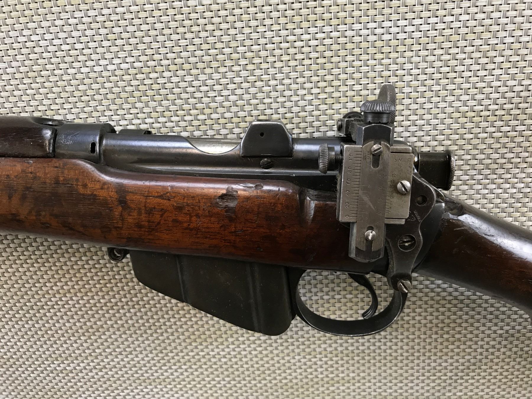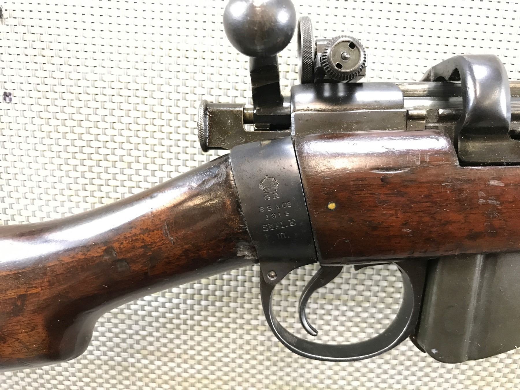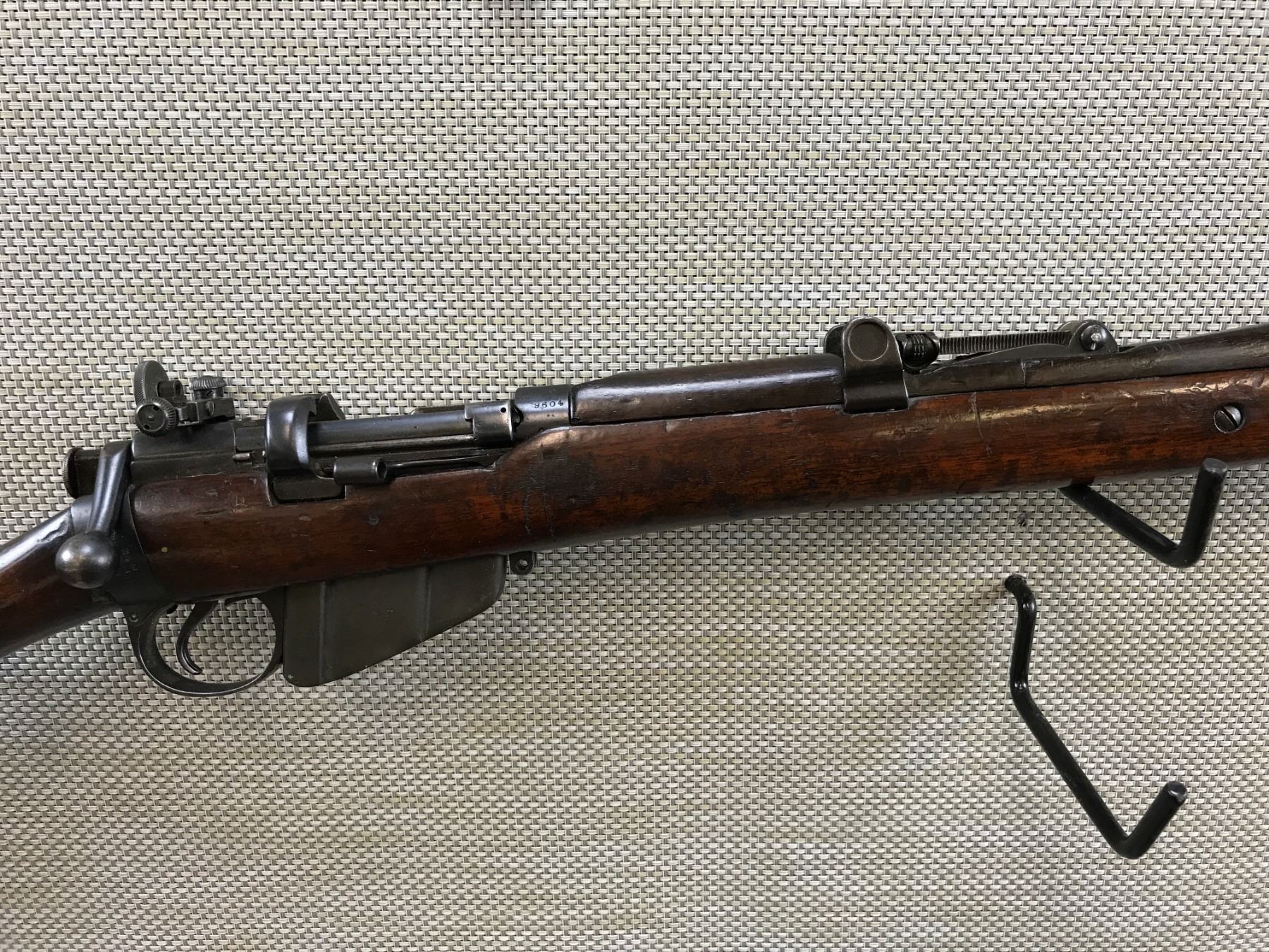 WWI ERA LEE ENFIELD , MODEL: NO 1 MKII SMLE III , CALIBER: 303 BR , COMES WITH MAGAZINE, BOLT AND RECEIVER MATCH BY SERIAL #, WWI ERA, BSA 1914 REGULATED BY FULTON, REGULATED/ACCURIZED BY G.E. FULTON & SONS OF BISLEY CAMP --- KOLAPORE MATCH HAS BEEN SHOT SINCE 1872, FEATURES A PARKER HALE REAR SIGHT, BUTT DISK IS MARKED ,KOLHAPUR CUP 1935, BARLEY CORN FRONT AND ADJUSTABLE REAR SIGHT, FEATURES THE ORGINAL MAGAZINE CUTOFF, VERY GOOD BORE , BARREL LENGTH: 25" , SERIAL # W9604 , STOCK # 8213 , CONDITION: 7/10 , CLASS: CANADIAN NON RESTRICTED CLASS