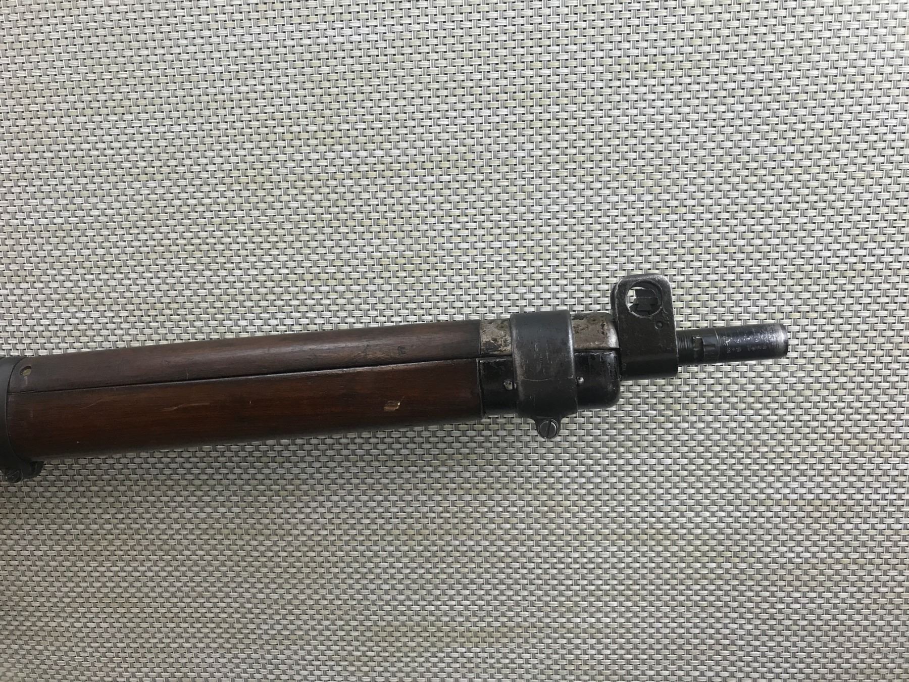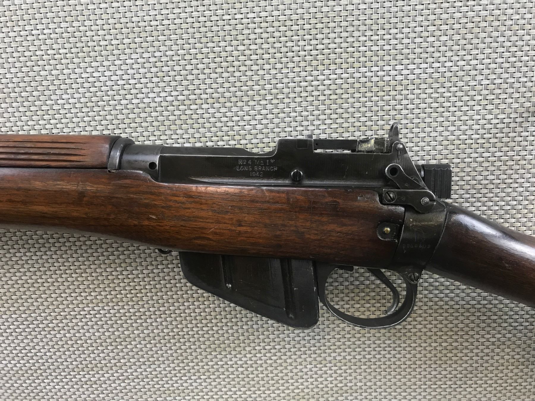 WWII ERA LEE ENFIELD , MODEL: NO 4 MKI* LONG BRANCH 1942 , CALIBER: 303 BR , COMES WITH MATCHING MAGAZINE BY SERIAL #, BOLT AND RECEIVER DO NOT MATCH BY SERIAL #, VERY GOOD BORE, THE BUTT PLATE HAS A BRITISH BRD ARROW MARK ON IT, BUTTSTOCK MAY NOT BE ORIGINAL, SHOWS SOME HANDLING MARKS, BARLEY CORN FRONT AND FLIP PEEP REAR SIGHTS, RETAINS FULL MILITARY CONFIGURATION , BARREL LENGTH: 25" , SERIAL # 11L4583 , STOCK # 8220 , CONDITION: 6/10 , CLASS: CANADIAN NON RESTRICTED CLASS