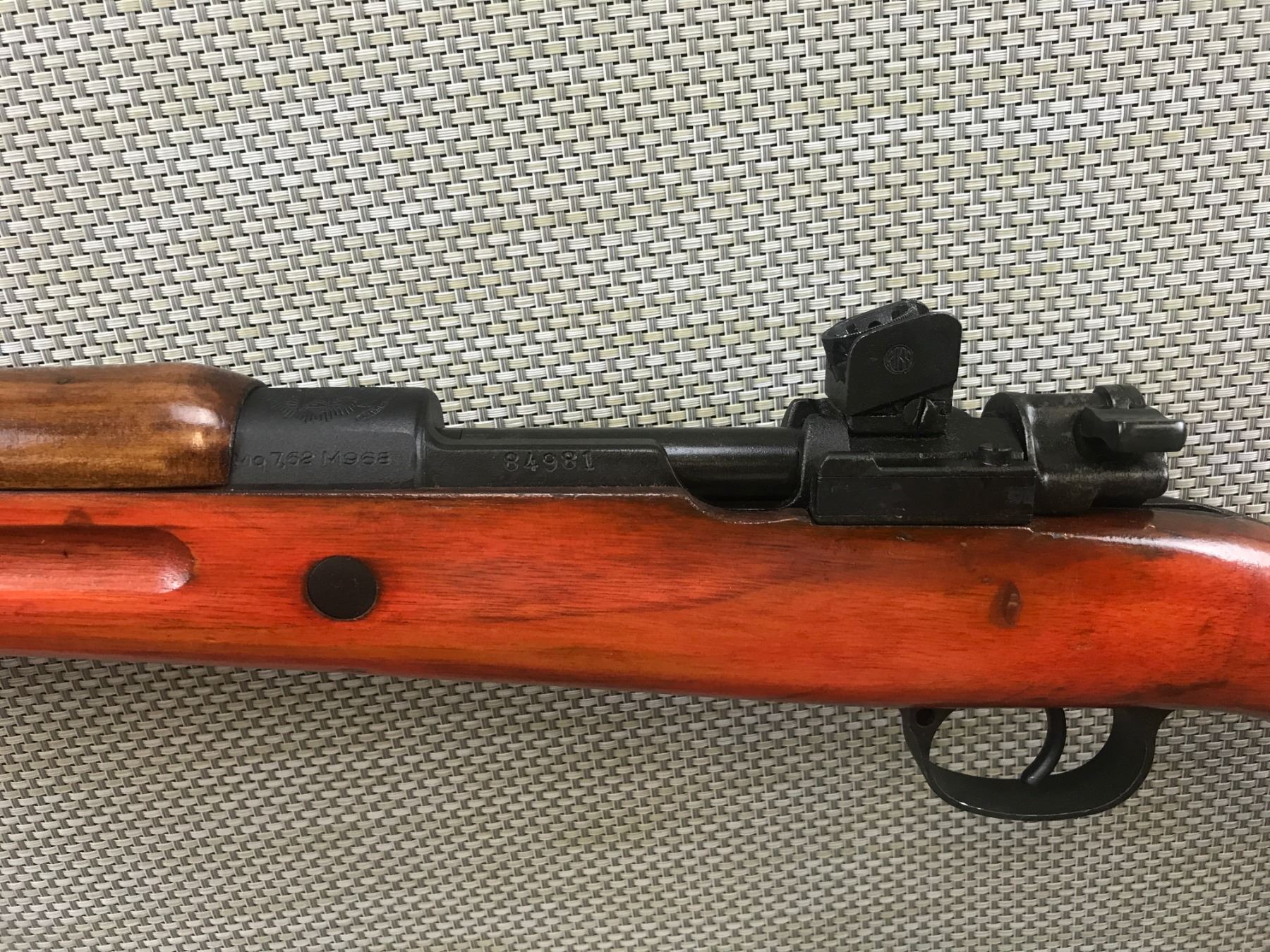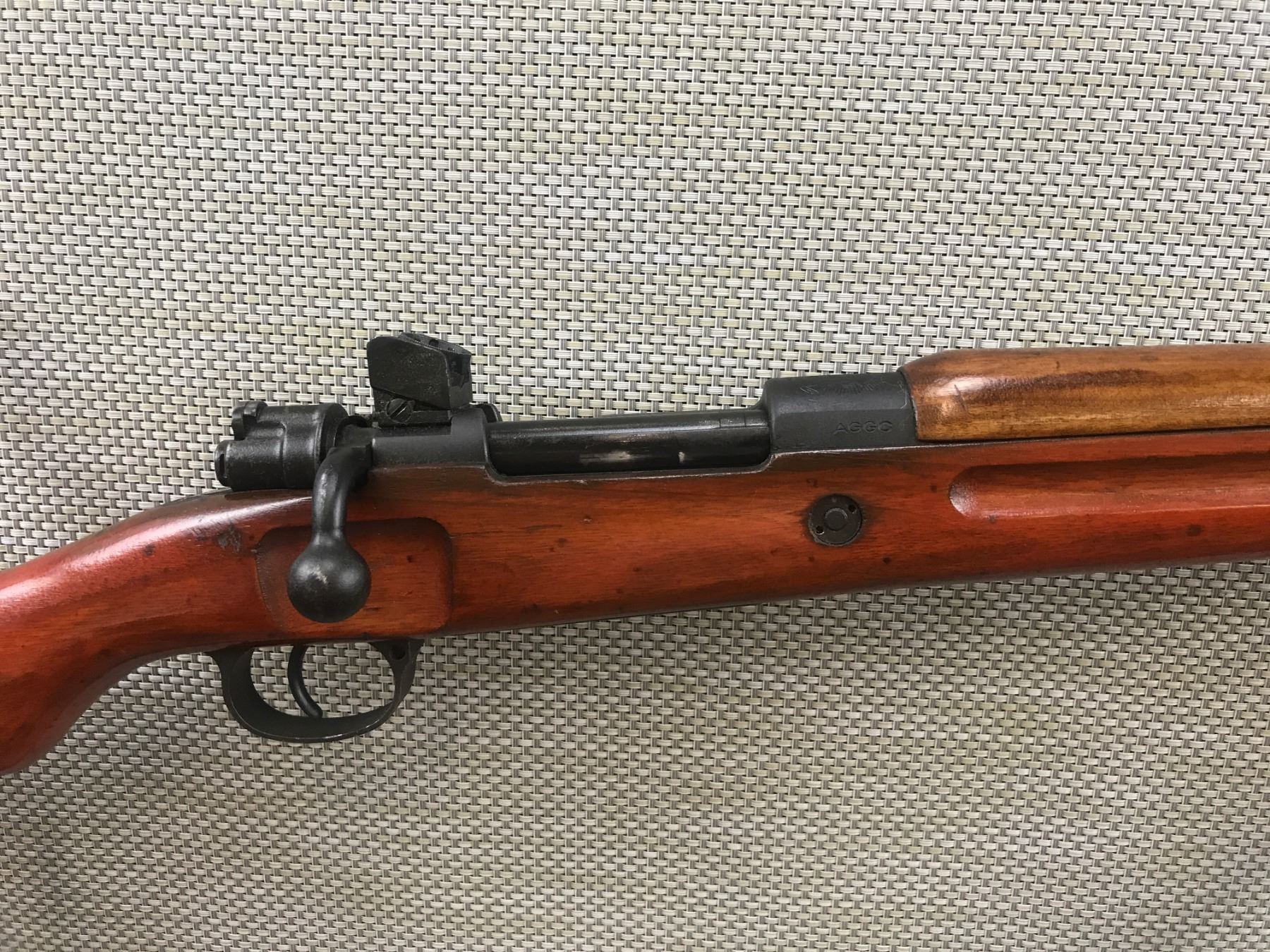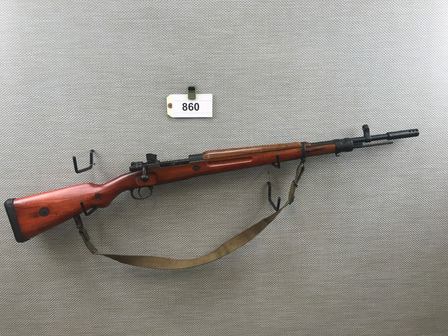 BRAZILIAN MAUSER , MODEL: M968 , CALIBER: 7.62 X 51 NATO , REAR DIOPTER SIGHT, GRENADE LAUNCHER ATTACHEMENT ON THE MUZZLE BREAK, HOODED FRONT SIGHT, BRAZILIAN CREST, SHOWS SOME HANDLING MARKS, POST WWII BRAZILIAN RIFLES IN 30-06 AND 308 WERE ASSEMBLED USING M1909 AND M1935 BARREL BANDS, CUT DOWN STOCKS AND REWORKED/REBARRELED RECEIVERS -- HANDGUARDS WERE NEW STYLE TO FIT THIS RIFLE, BORE IS VERY GOOD, ORGINAL CANVAS AND LEATHER SLING , BARREL LENGTH: 22" , SERIAL # 84981 , STOCK # 8229 , CONDITION: 6/10 , CLASS: CANADIAN NON RESTRICTED CLASS