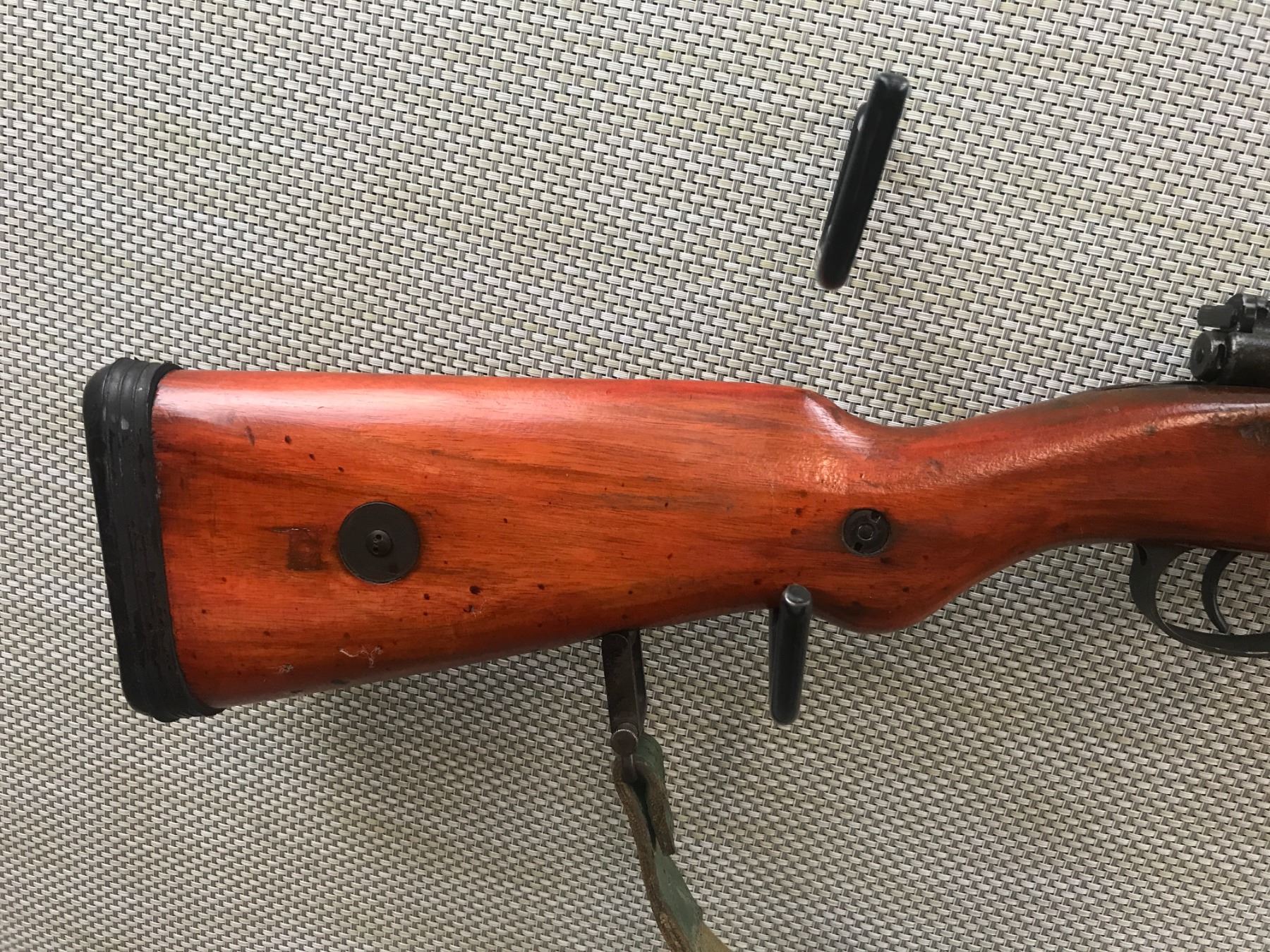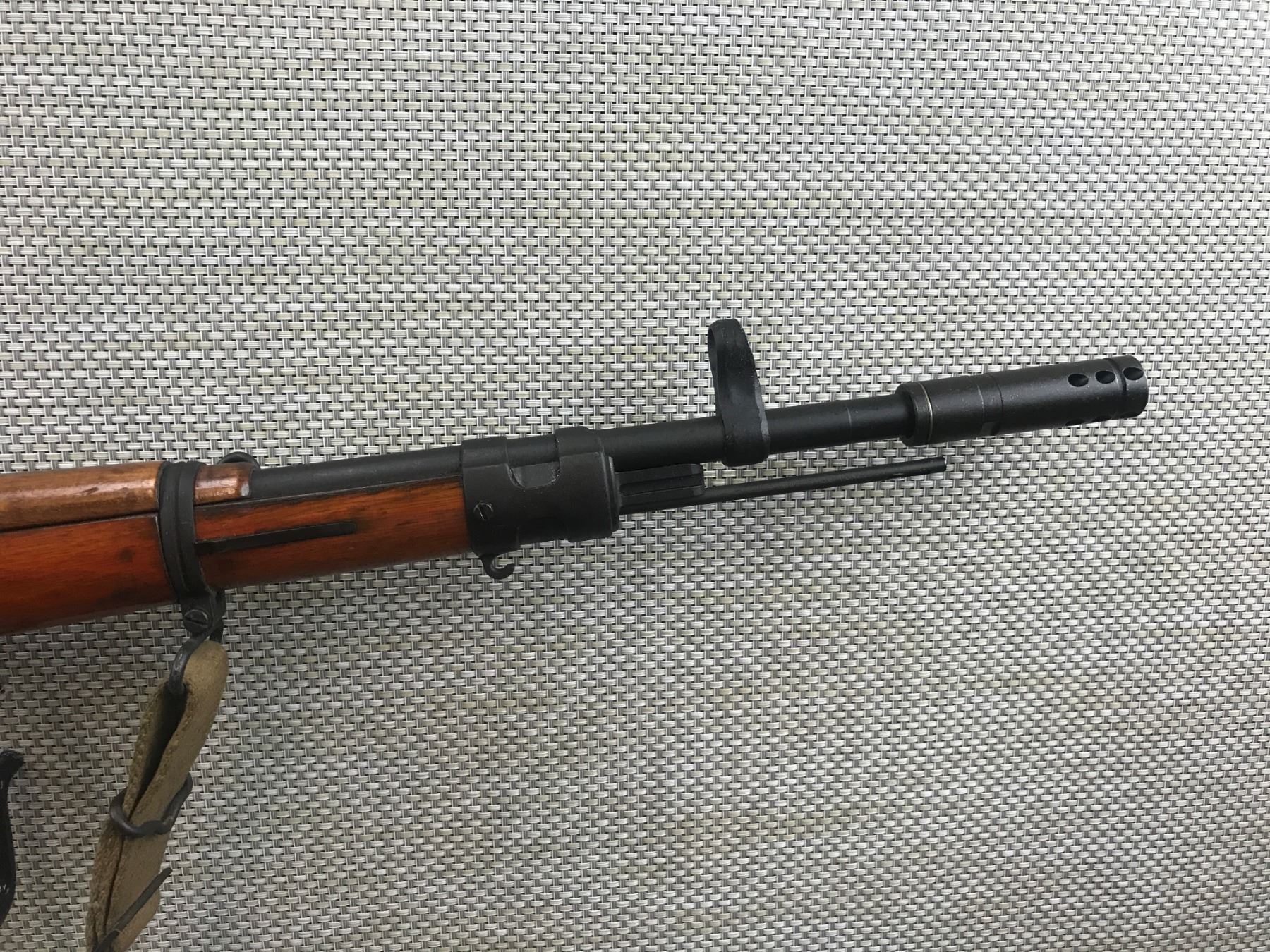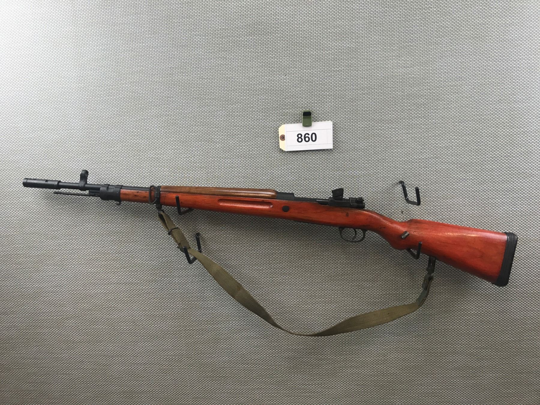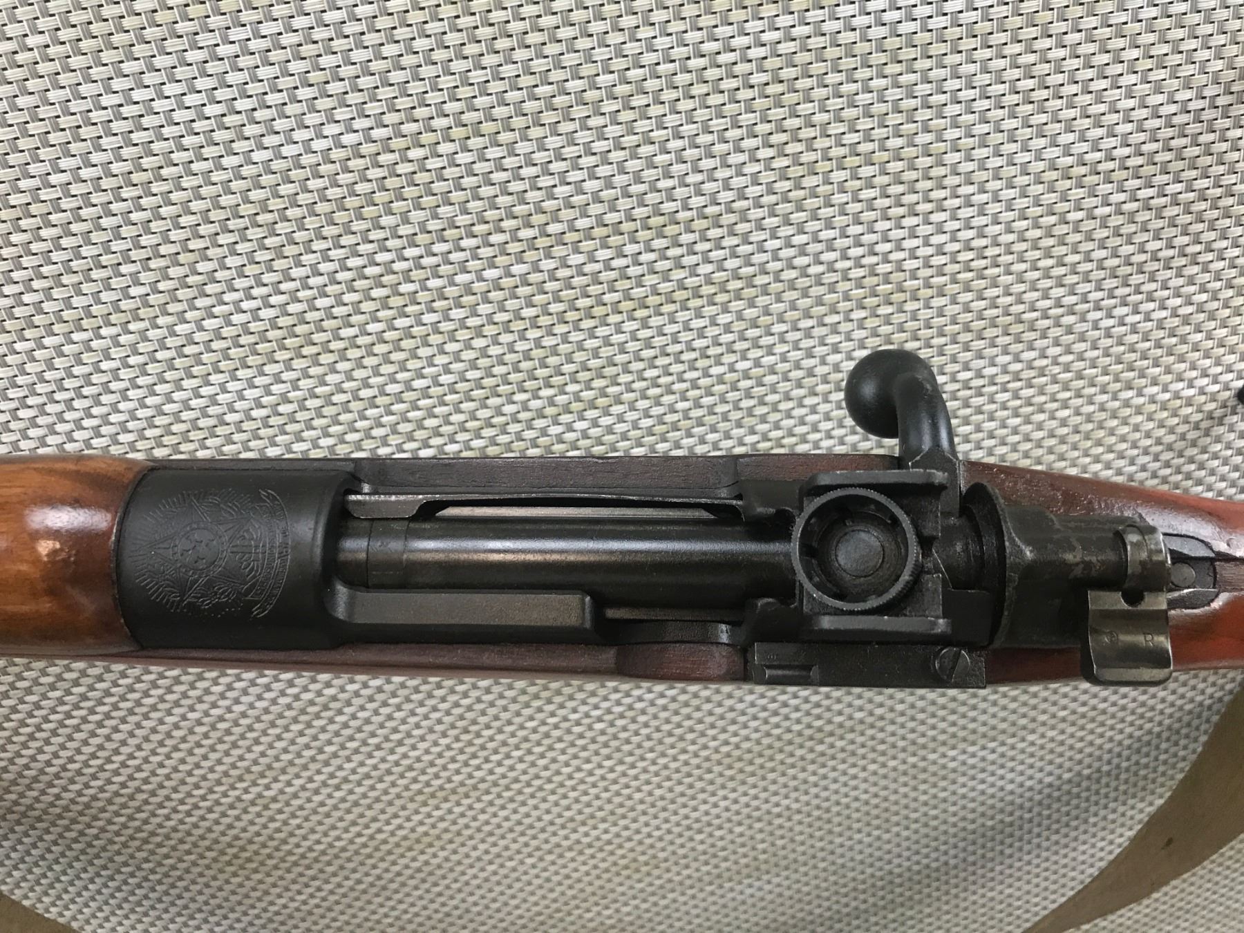 BRAZILIAN MAUSER , MODEL: M968 , CALIBER: 7.62 X 51 NATO , REAR DIOPTER SIGHT, GRENADE LAUNCHER ATTACHEMENT ON THE MUZZLE BREAK, HOODED FRONT SIGHT, BRAZILIAN CREST, SHOWS SOME HANDLING MARKS, POST WWII BRAZILIAN RIFLES IN 30-06 AND 308 WERE ASSEMBLED USING M1909 AND M1935 BARREL BANDS, CUT DOWN STOCKS AND REWORKED/REBARRELED RECEIVERS -- HANDGUARDS WERE NEW STYLE TO FIT THIS RIFLE, BORE IS VERY GOOD, ORGINAL CANVAS AND LEATHER SLING , BARREL LENGTH: 22" , SERIAL # 84981 , STOCK # 8229 , CONDITION: 6/10 , CLASS: CANADIAN NON RESTRICTED CLASS