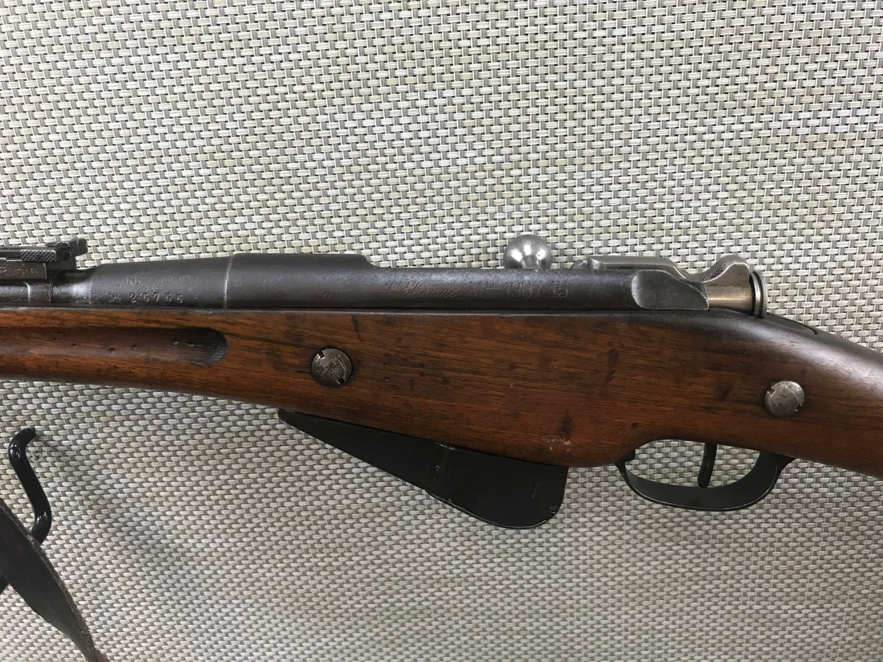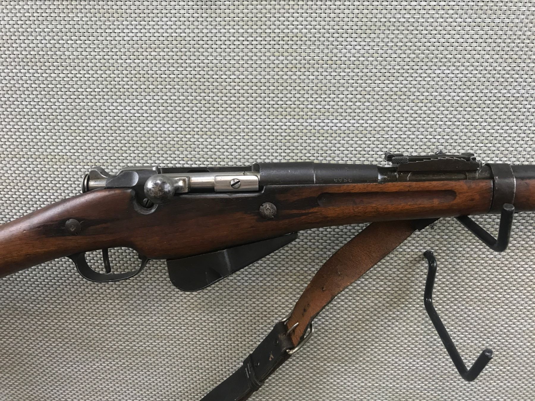 MANNLICHER BERTHIER , MODEL: 1907/15 CARBINE , CALIBER: 8MM LEBEL , BOLT AND RECEIVER DO NOT MATCH BY SERIAL #, DARK BORE, LEATHER SLING, RETAINS ORGINAL MILITARY CONFIGURATION, BLADE FRONT AND ADJUSTABLE REAR SIGHT, STEEL BUTT PLATE, SHOWS SOME HANDLING MARKS , BARREL LENGTH: 18" , SERIAL # 25755 , STOCK # 8238 , CONDITION: 5/10 , CLASS: CANADIAN NON RESTRICTED CLASS