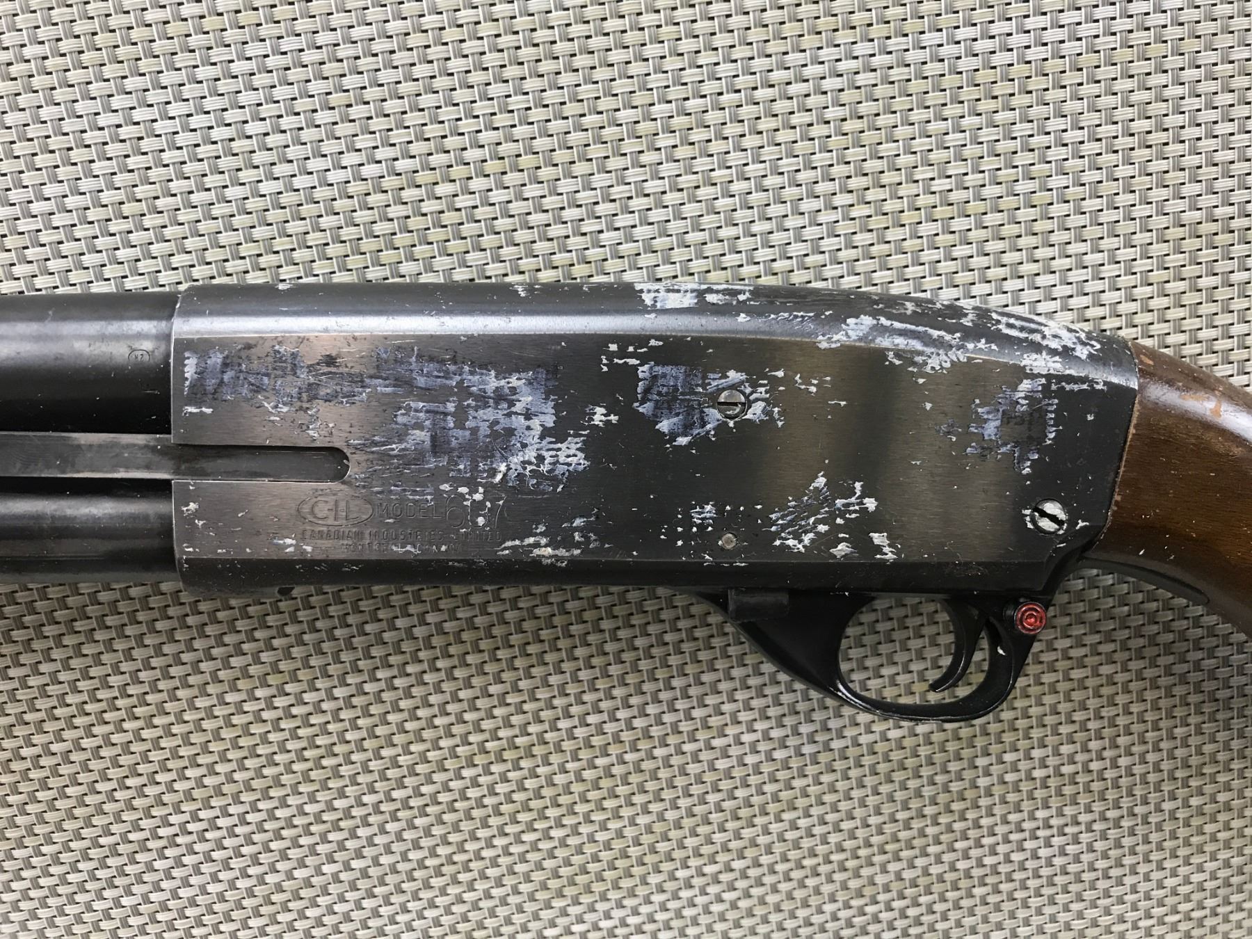 CIL , MODEL: PUMP ACTION SHOTGUN , CALIBER: 12GA X 3" , FIXED FULL CHOKE, CAMO TAPE OVER ORIGINAL WOOD BUTT STOCK, BORE IS GOOD, BEAD FRONT SIGHT , BARREL LENGTH: 28" , SERIAL # N/A , STOCK # 8258 , CONDITION: 4/10 , CLASS: CANADIAN NON RESTRICTED CLASS