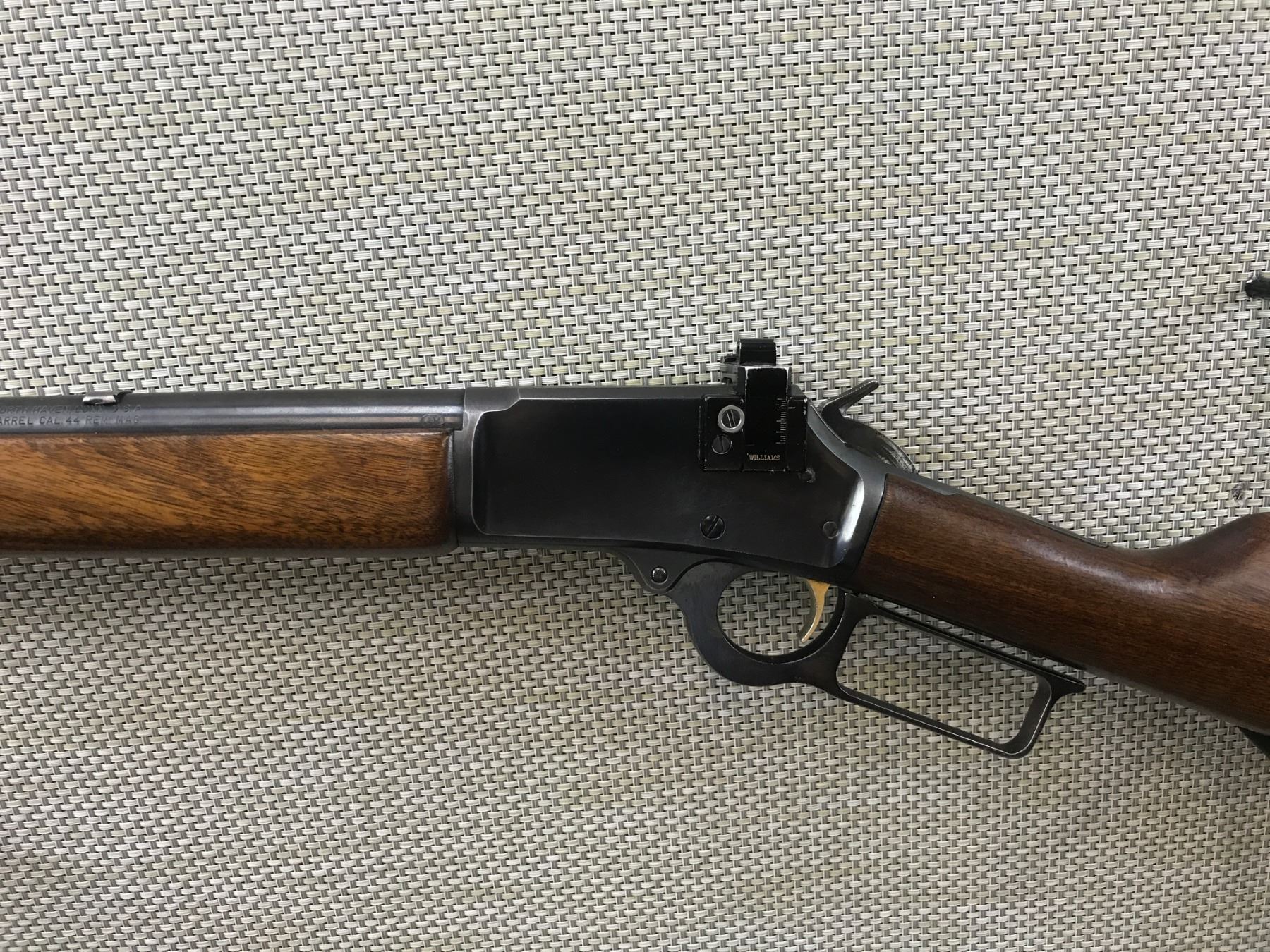 MARLIN , MODEL: 1894 , CALIBER: 44 REM MAG , VERY GOOD BORE, BLADE FRONT AND WILLIAMS PEEP REAR SIGHT, RECEIVER IS DRILLED AND TAPPED FOR A SCOPE, SLING SWIVEL LOOPS AND LEATHER SLING, SHOWS SOME HANDLING MARKS , BARREL LENGTH: 20" , SERIAL # 22003179 , STOCK # 8259 , CONDITION: 6/10 , CLASS: CANADIAN NON RESTRICTED CLASS