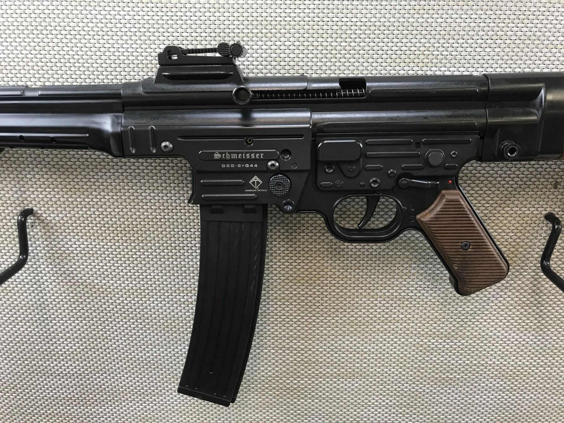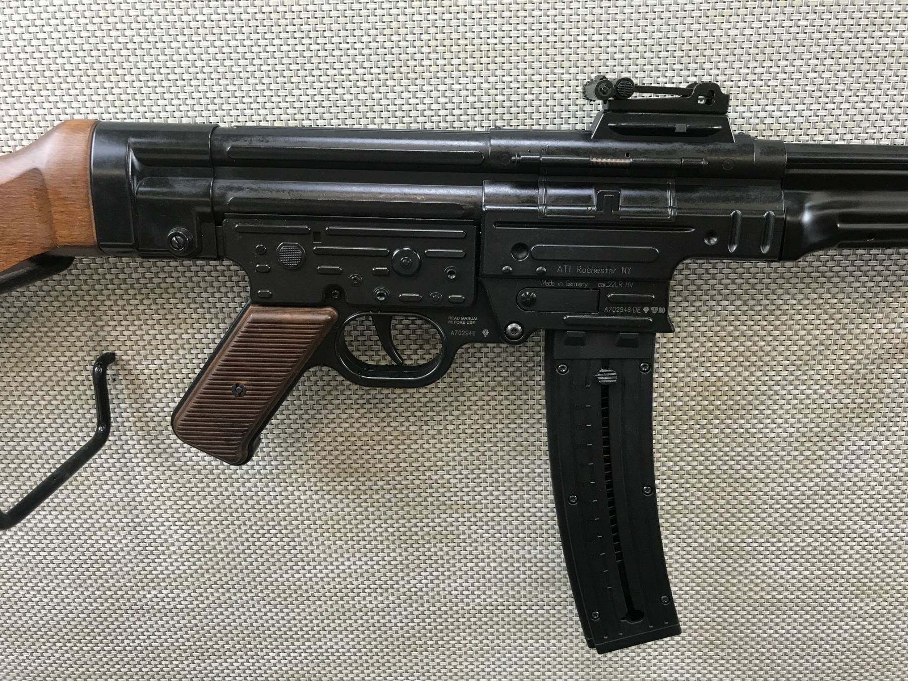 GSG , MODEL: STG 44 (SCHMEISSER) , CALIBER: 22 LR , COMES WITH BOX AND A MAGAZINE, FULL PISTOL GRIP WOOD STOCK, BORE IS EXCELLENT, SHOWS VERY LITTLE HANDLING MARKS, HOODED FRONT SIGHT AND FULLY ADJUSTABLE REAR SIGHTS, SLING SWIVEL STUDS, SHROUDED BARREL, TRAP DOOR IN BUTT STOCK FOR NON PRESENT CLEANING KIT , BARREL LENGTH: 18 1/2" , SERIAL # A702946 , STOCK # 8282 , CONDITION: 8/10 , CLASS: CANADIAN NON RESTRICTED CLASS