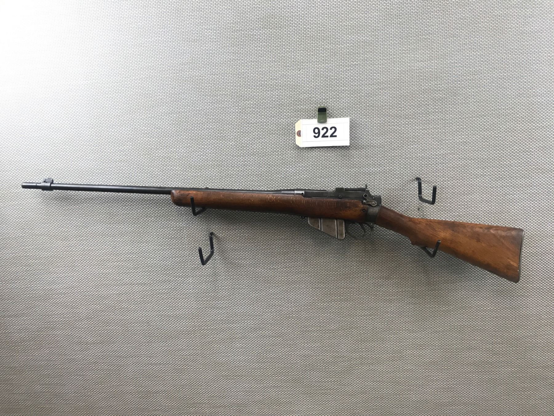 WWII ERA LEE ENFIELD , MODEL: SPORTER , CALIBER: 303 BR , COMES WITH MAGAZINE, MADE BY LONG BRANCH IN 1943, BRITISH BRD ARROW AND OTHER MILITARY MARKS, VERY GOOD BORE, MISMATCHED BOLT BY SERIAL #, SHOWS SOME HANDLING MARKS, REPLACED FRONT SIGHT AND ORIGINAL MILITARY PEEP SIGHT, DRILLED FOR SLING LOOPS NOT PRESENT , BARREL LENGTH: 25 1/2" , SERIAL # 33L7824 , STOCK # 8291 , CONDITION: 5/10 , CLASS: CANADIAN NON RESTRICTED CLASS