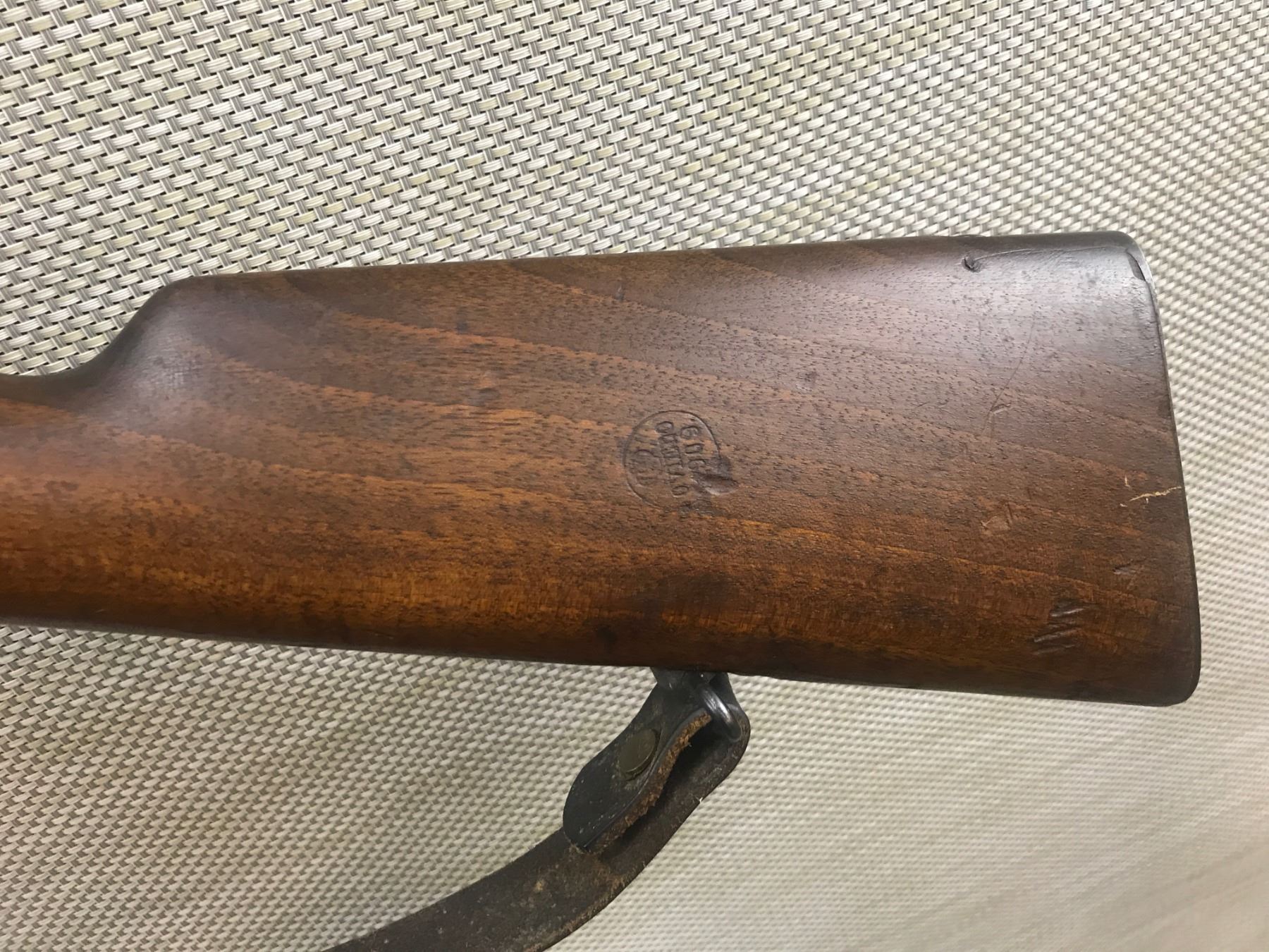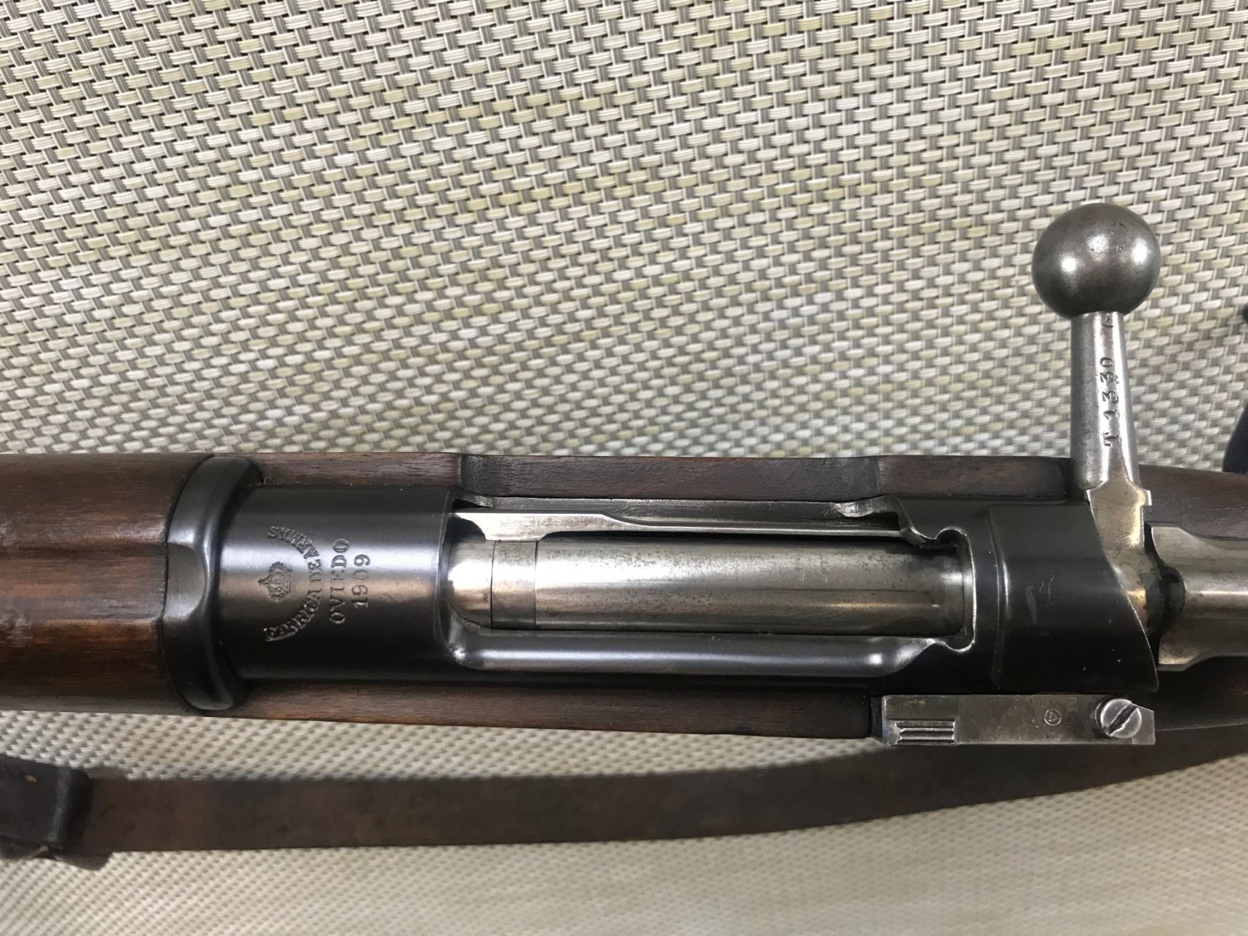 MAUSER , MODEL: 1898 SPANISH RIFLE , CALIBER: 7MM MAUSER , VERY GOOD BORE, DATED 1909, SLING SWIVELS WITH ORIGINAL LEATHER SLING, BLADE FRONT AND FULLY ADJUSTABLE REAR SIGHT, RETAINS FULL MILITARY CONFIGURATION, SHOWS SOME HANDLING MARKS, MISSING THE CLEANING ROD , BARREL LENGTH: 29" , SERIAL # T1330 , STOCK # 8295 , CONDITION: 7/10 , CLASS: CANADIAN NON RESTRICTED CLASS