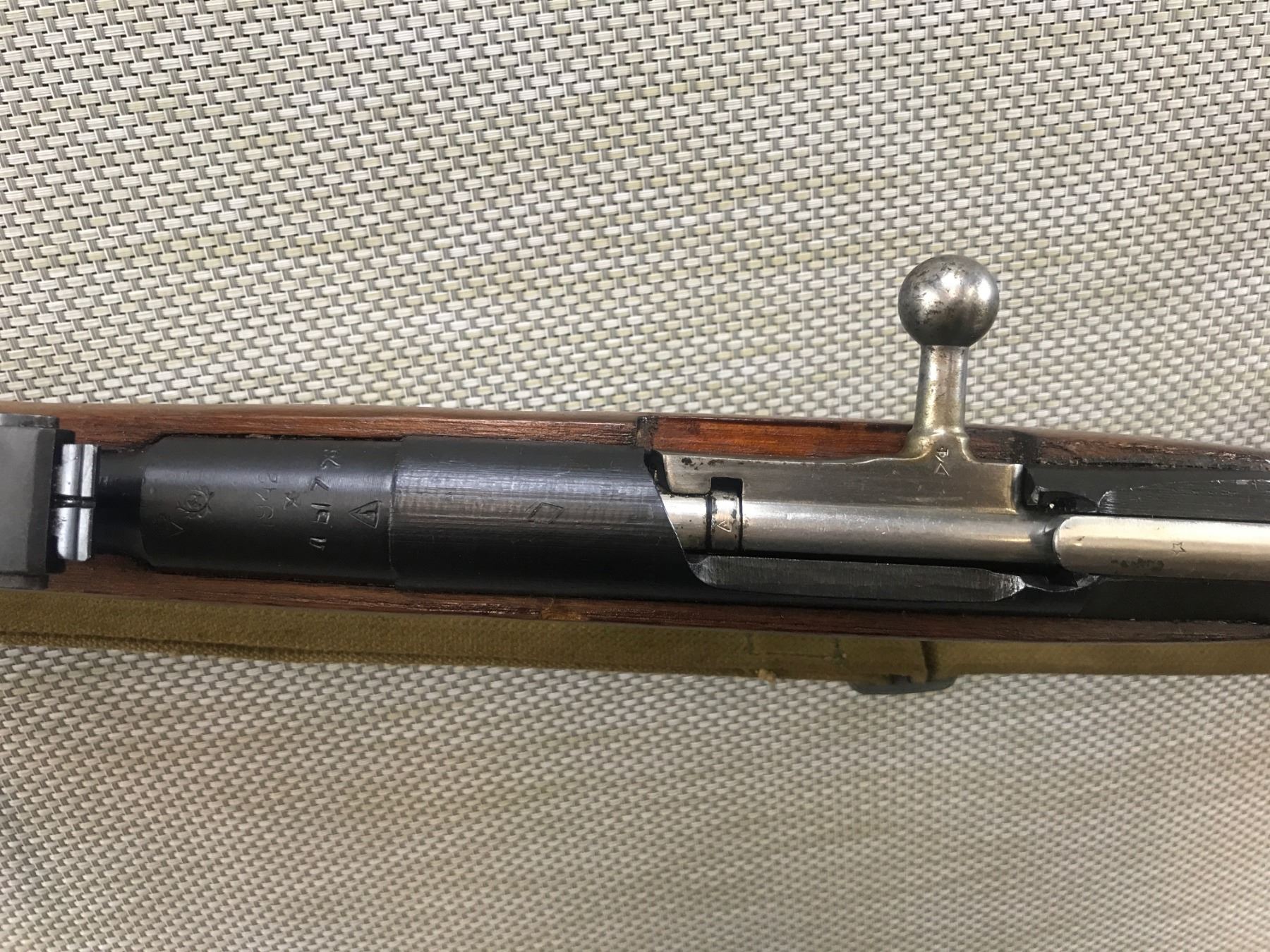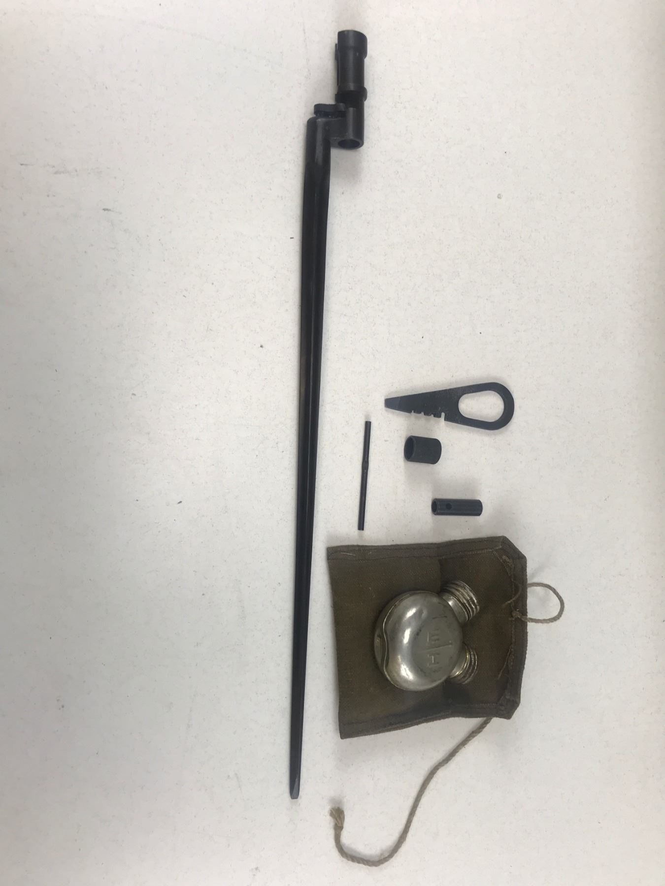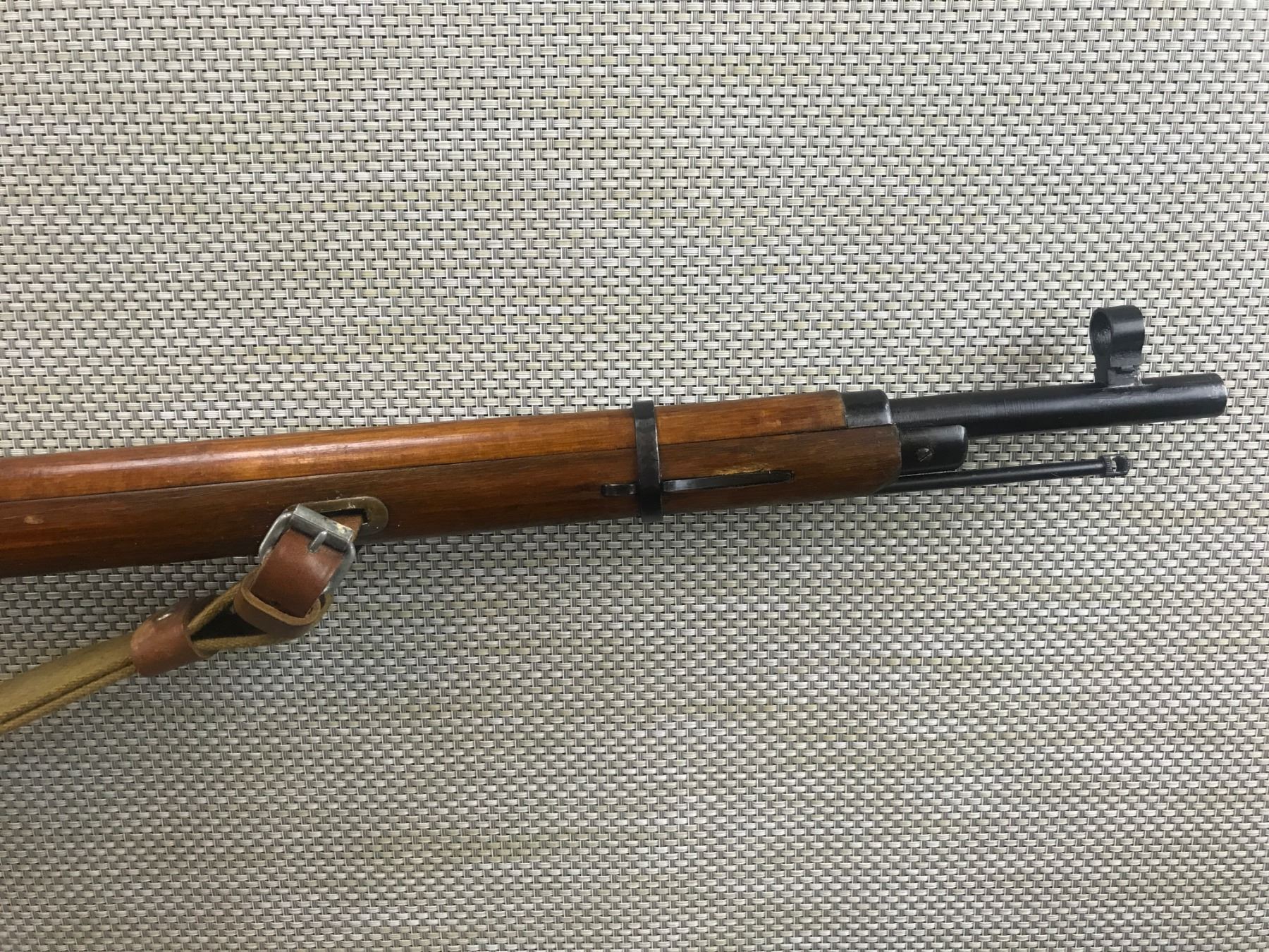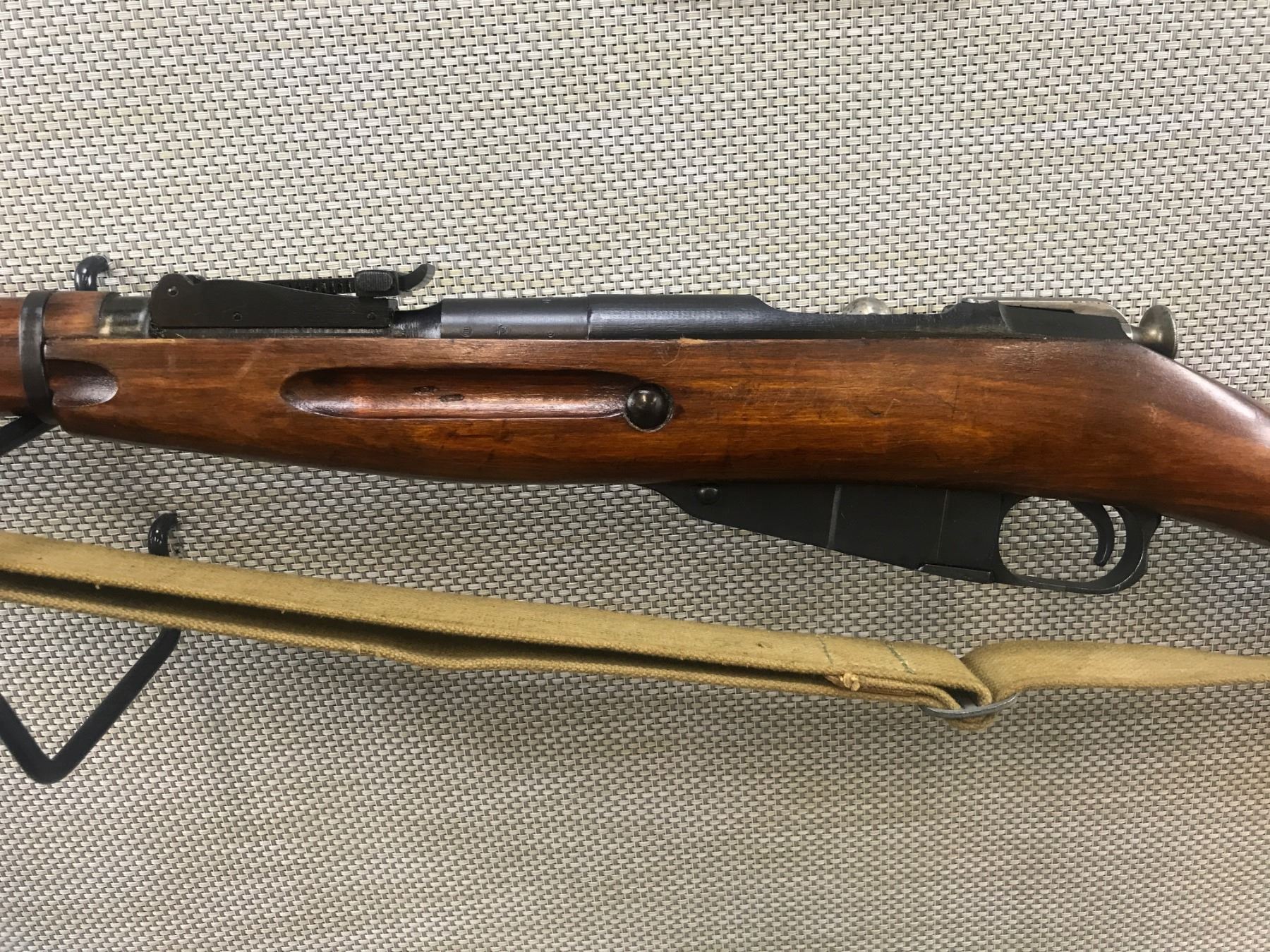 WWII ERA, MOSIN NAGANT , MODEL: 91/30 , CALIBER: 7.62 X 54R ,COMES WITH BAYONET AND CLEANING ACCESSORIES, BOLT AND RECEIVER DON'T MATCH BY SERIAL, DATED 1942, INCLUDES ORIGINAL LEATHER AND CANVAS SLING, MULTIPLE MILITARY MARKINGS, RETAINS FULL MIILTARY CONFIGURATION, HOODED FRONT AND ADJUSTABLE REAR SIGHT, SHOWS VERY LITTLE HANDLING MARKS, GOOD BORE , BARREL LENGTH: 29" , SERIAL # 7787 , STOCK # 8329 , CONDITION: 8/10 , CLASS: CANADIAN NON RESTRICTED CLASS