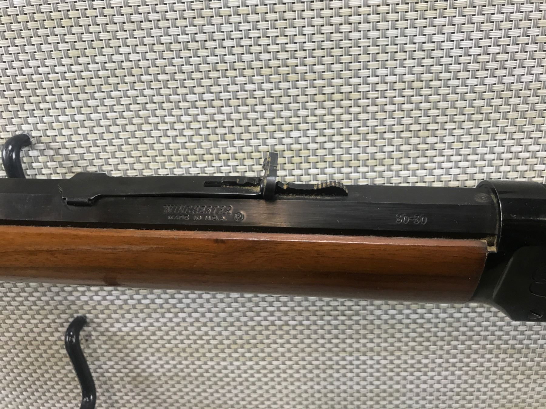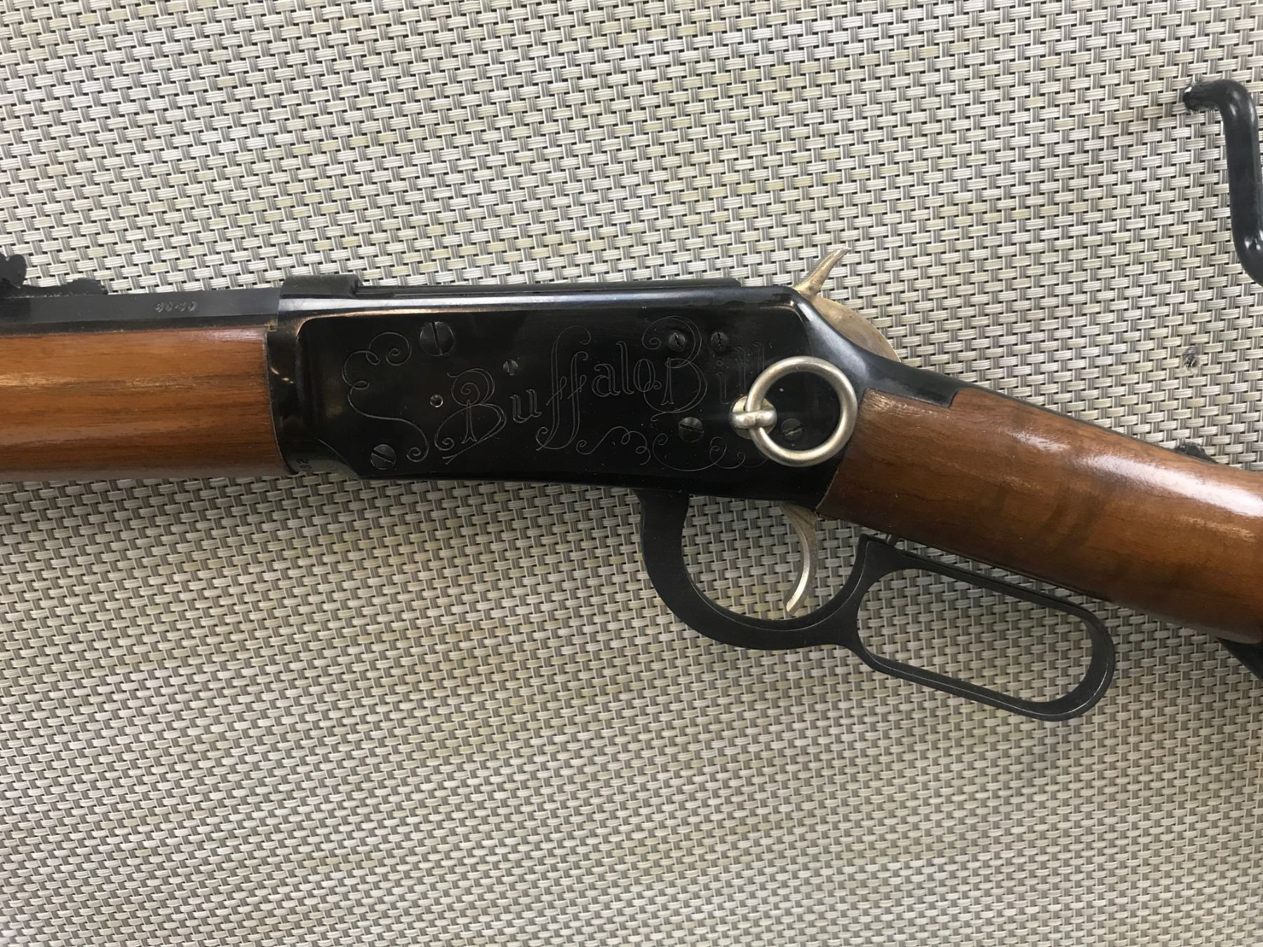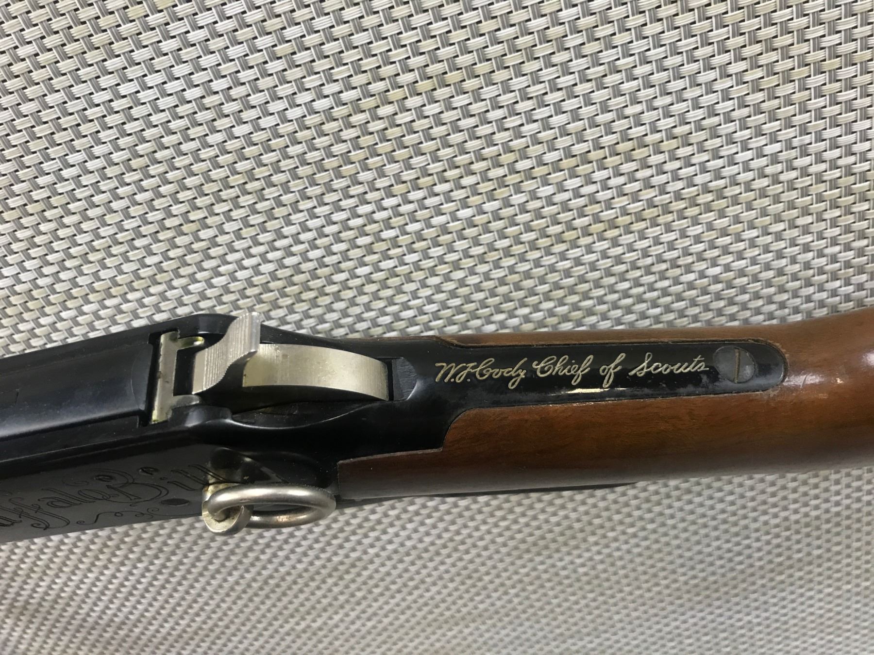WINCHESTER , MODEL: 94 BUFFALO BILL COMMEMORATIVE , CALIBER: 30-30 WIN , COMES WITH BOX, EXCELLENT BORE, BLADE FRONT AND FULLY ADJUSTABLE REAR SIGHT, OCTAGONAL BARREL, FEATURES A UNIQUE SADDLE RING, SHOWS VERY LITTLE HANDLING MARKS, MARKED WJ CODY CHIEF OF SCOUTS , BARREL LENGTH: 26" , SERIAL # WC14982 , STOCK # 8345 , CONDITION: 9/10 , CLASS: CANADIAN NON RESTRICTED CLASS