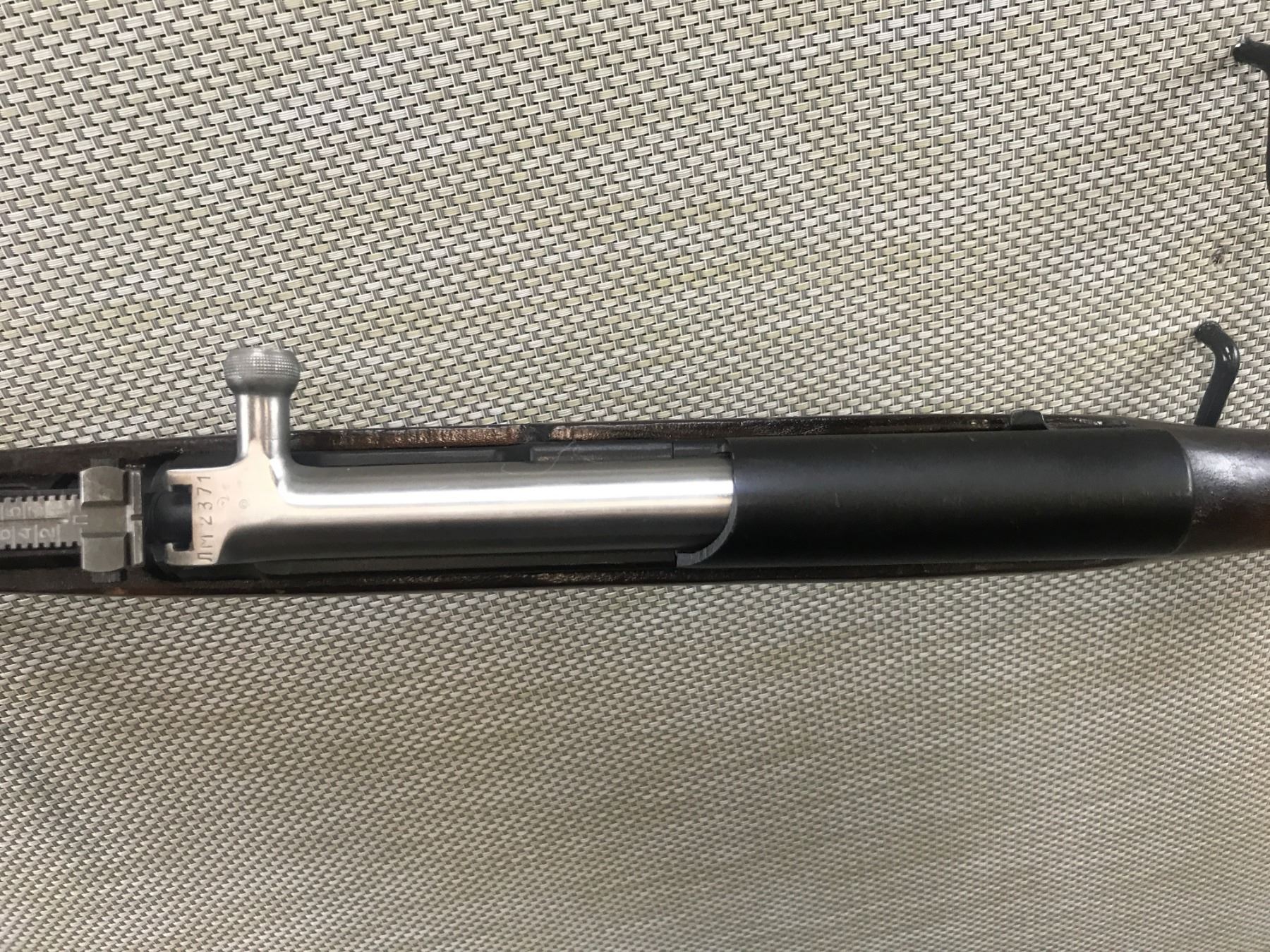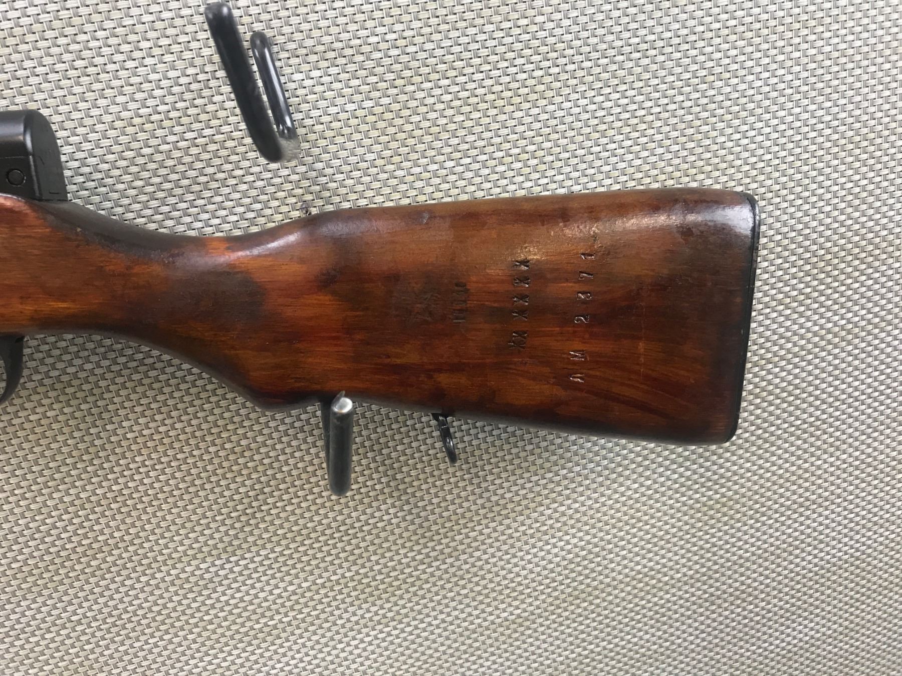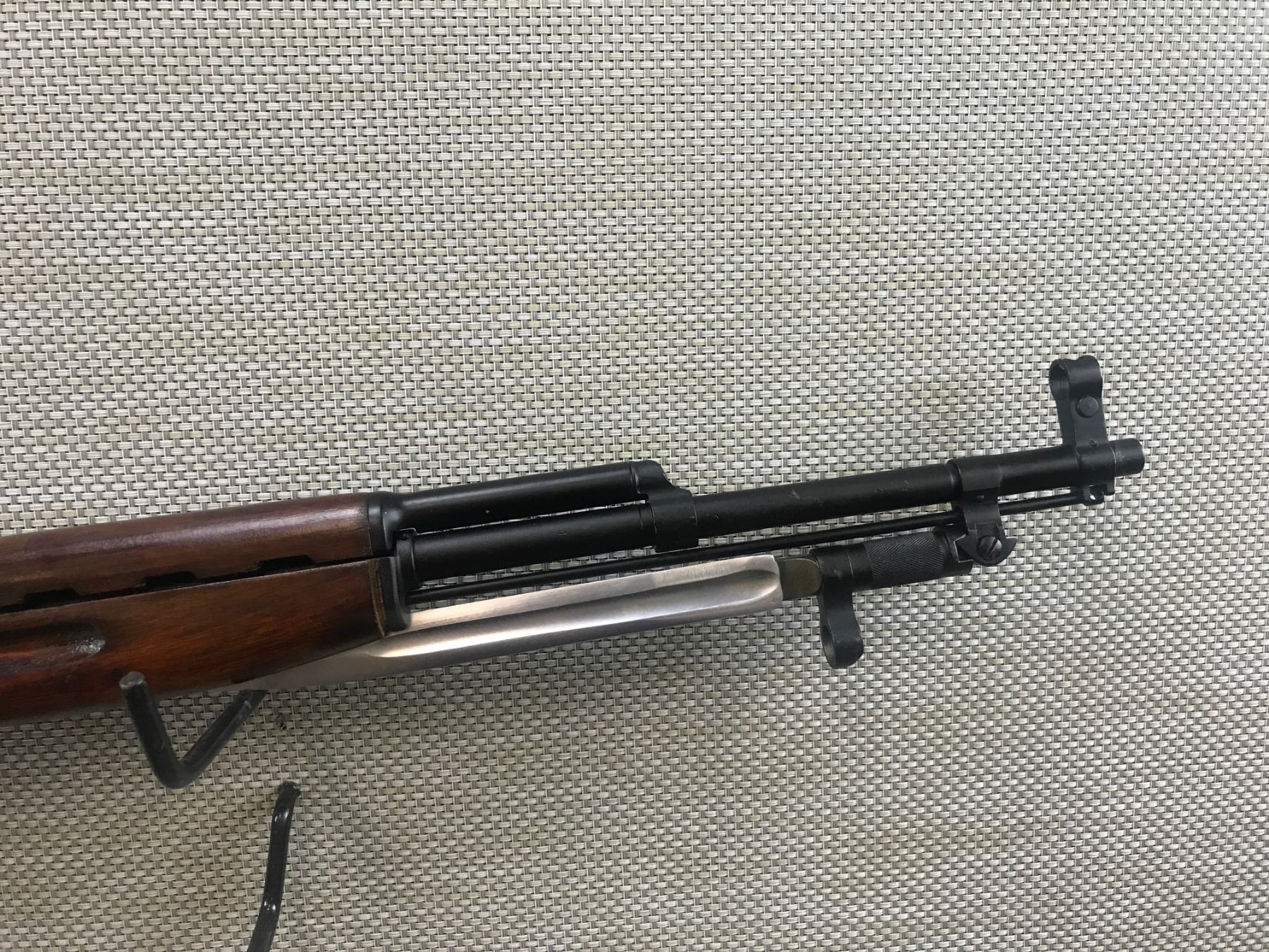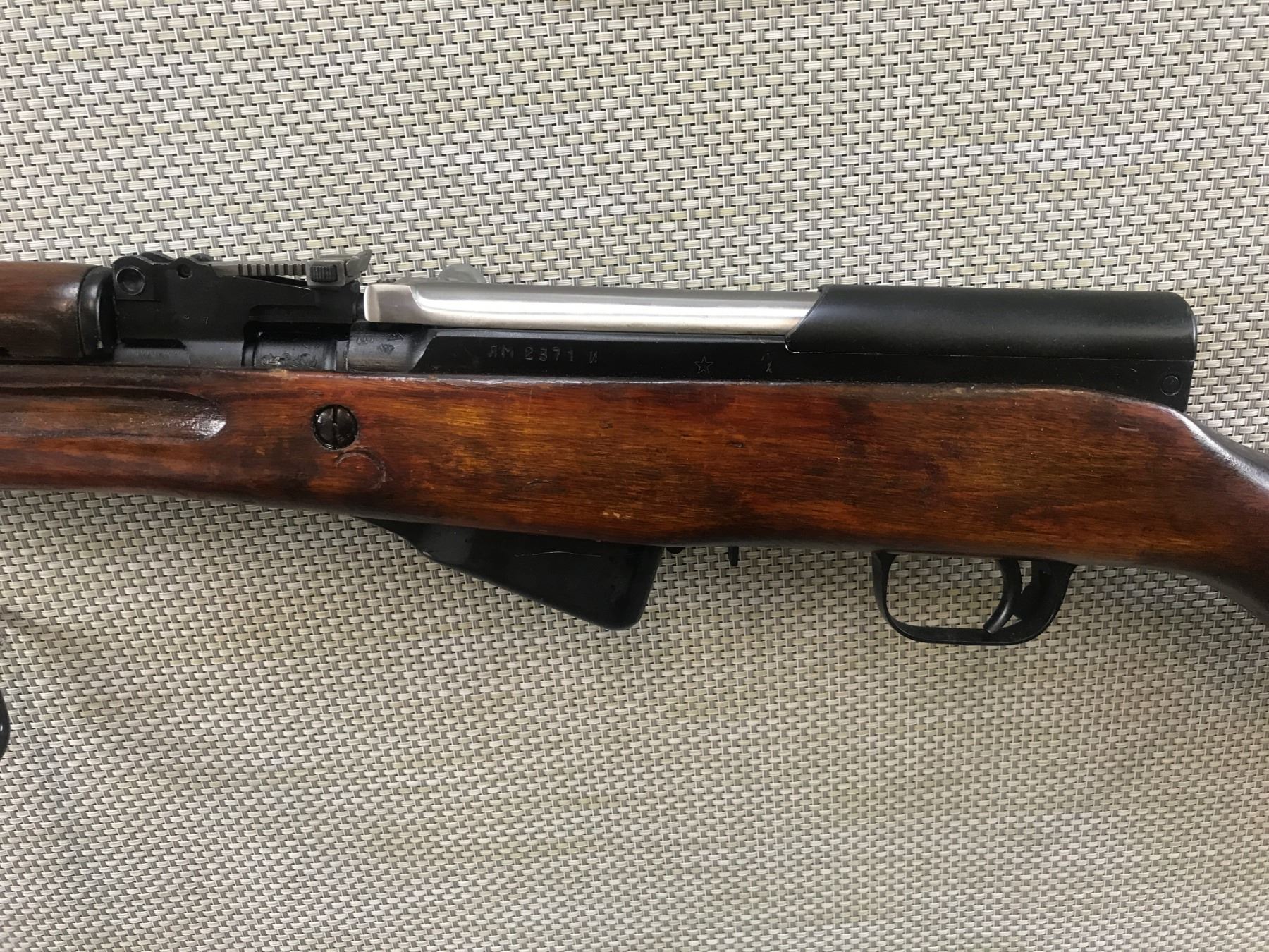 SIMINOV , MODEL: SKS , CALIBER: 7.62 X 39 , TULA ARSENAL MARKING ON STOCK, MATCHING BOLT AND RECEIVER, FOLDING BLADE BAYONET, HARDWOOD STOCK, HOODED FRONT AND FULLY ADJUSTABLE REAR SIGHT, RETAINS FULL MILITARY CONFIGURATION, SHOWS SOME HANDLING MARKS, VERY GOOD BORE , BARREL LENGTH: 20" , SERIAL # M2371 , STOCK # 8358 , CONDITION: 7/10 , CLASS: CANADIAN NON RESTRICTED CLASS