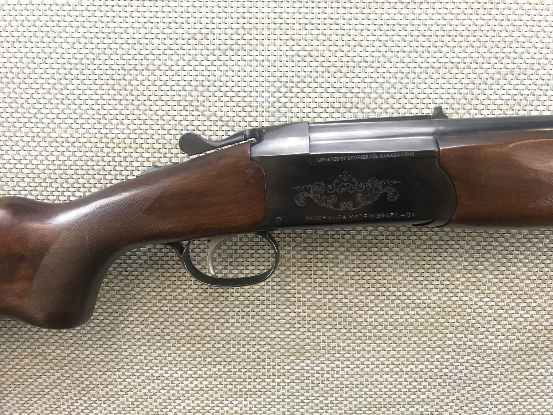 GAUCHA IGA MADE IN BRAZIL, MODEL: CONDOR , CALIBER: 20GA X 3" , IMPORTED BY STOEGER IND. CANADA /2013, VERY GOOD BORES, FIXED FULL AND MODIFIED CHOKES, ENGRAVED RECEIVER, HAS EXTRACTORS, RAISED FRONT AND NOTCH REAR SIGHTS, SLING SWIVEL LOOPS, CHECKERED FOREND AND SEMI PISTOL GRIP BUTT STOCK WITH RUBBER RECOIL PAD, SINGLE TRIGGER, SHOWS SOME HANDLING MARKS , BARREL LENGTH: 20" , SERIAL # J30953413 , STOCK # 8362 , CONDITION: 7/10 , CLASS: CANADIAN NON RESTRICTED CLASS