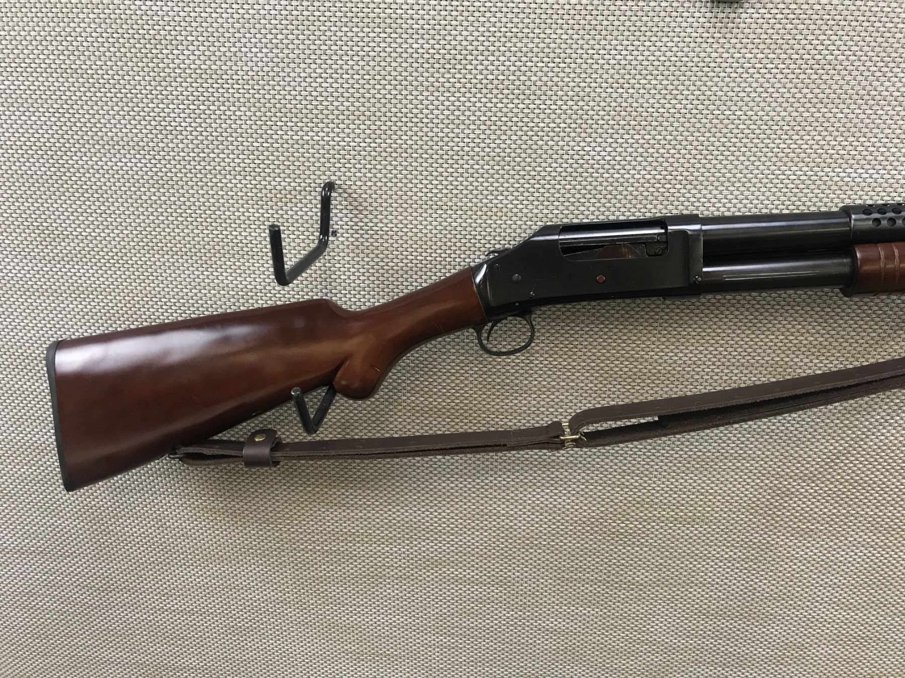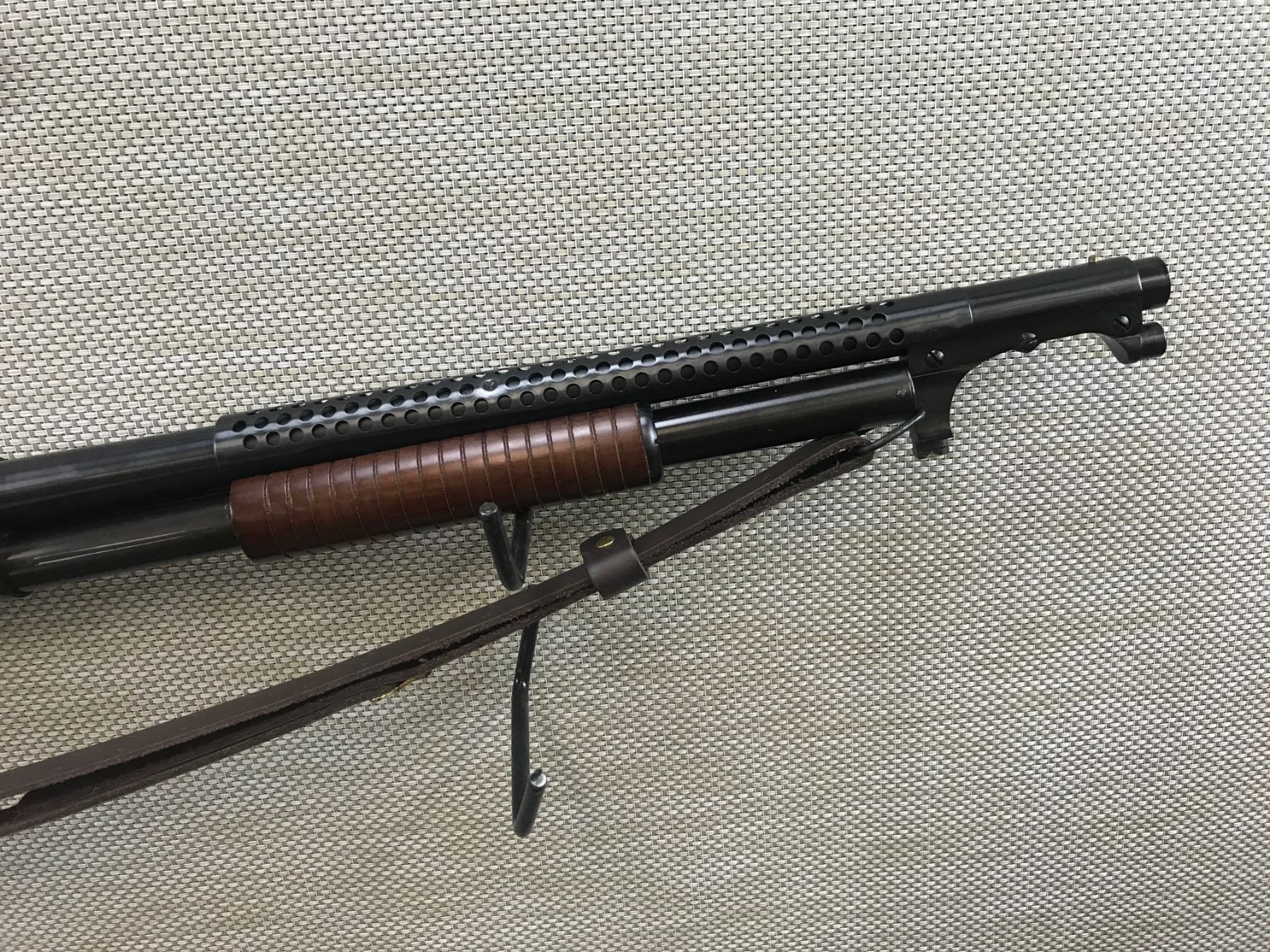 NORINCO , MODEL: WINCHESTER 97 COPY , CALIBER: 12GA X 2 3/4" , COPY OF USA WWI TRENCH GUN, VERY GOOD BORE, SHROUDED BARREL WITH BAYONET LUG, SLING SWIVELS WITH LEATHER SLING, PLASTIC BUTT PLATE, SHOWS VERY LITTLE HANDLING MARKS, BEAD FRONT SIGHT , BARREL LENGTH: 20" , SERIAL # 0303285 , STOCK # 8368 , CONDITION: 8/10 , CLASS: CANADIAN NON RESTRICTED CLASS
