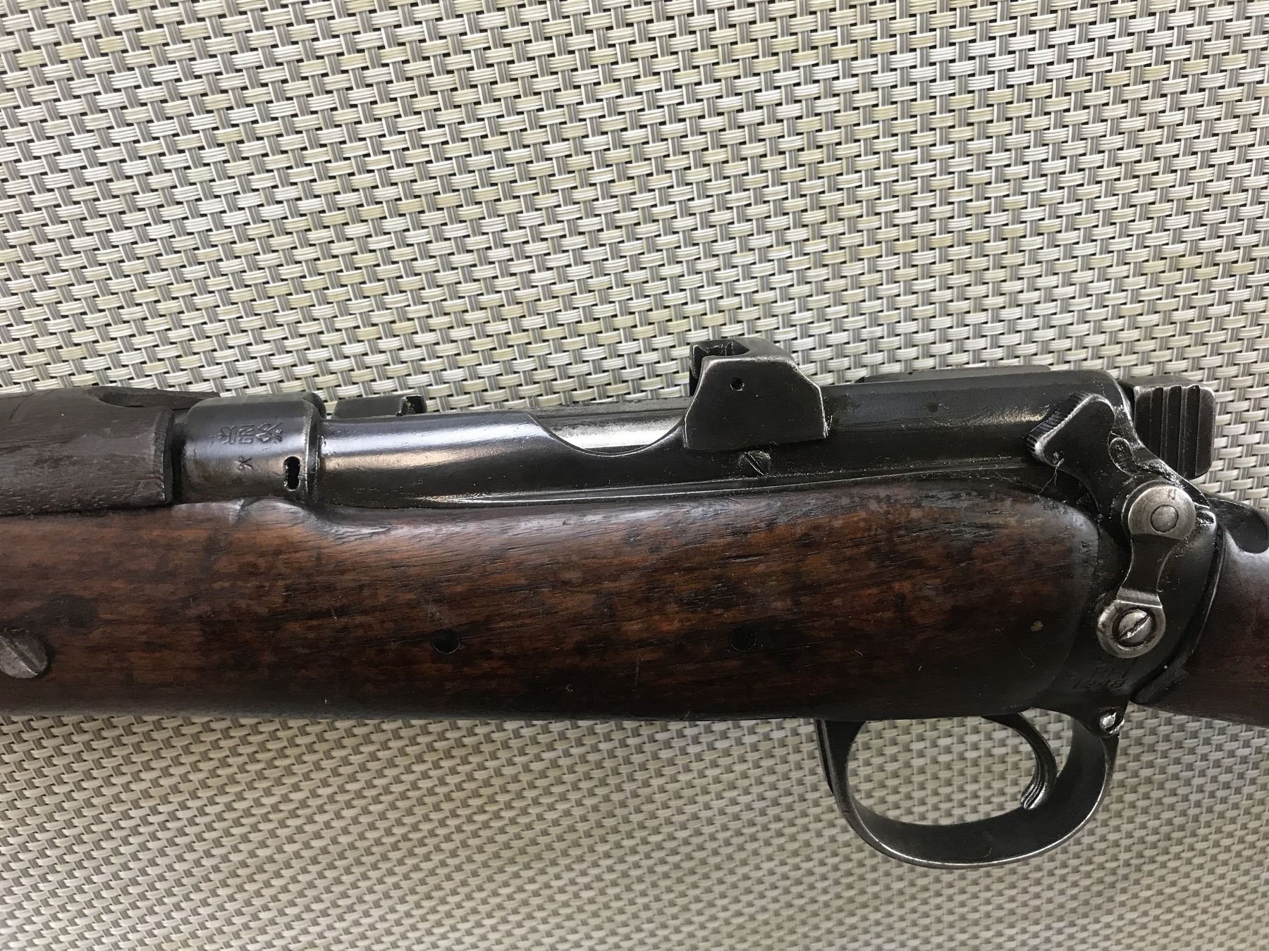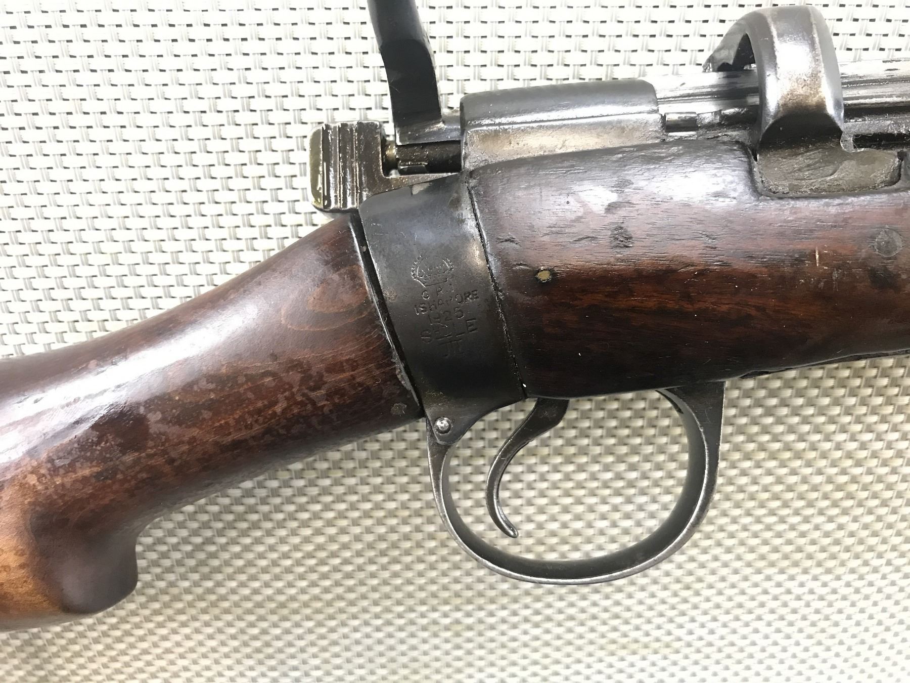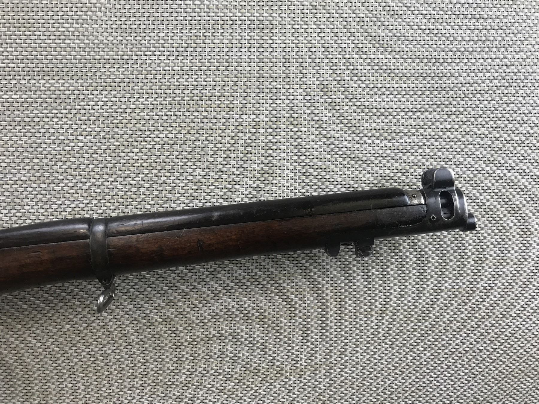 LEE ENFIELD , MODEL: NO I MK III , CALIBER: 410 GA X 2 1/2" , PRISON CONVERSION CONVERTED TO SINGLE SHOT, DATED 1925, ISHAPORE ARSENAL, RETAINS FULL MILITARY CONFIGURATION, BARLEY CORN FRONT AND ADJUSTABLE REAR SIGHTS, SHOWS EXTENSIVE HANDLING MARKS, SLING SWIVEL LOOPS, BRASS BUTT PLATE, GOOD BORE , BARREL LENGTH: 25" , SERIAL # 20262C , STOCK # 8370 , CONDITION: 5/10 , CLASS: CANADIAN NON RESTRICTED CLASS