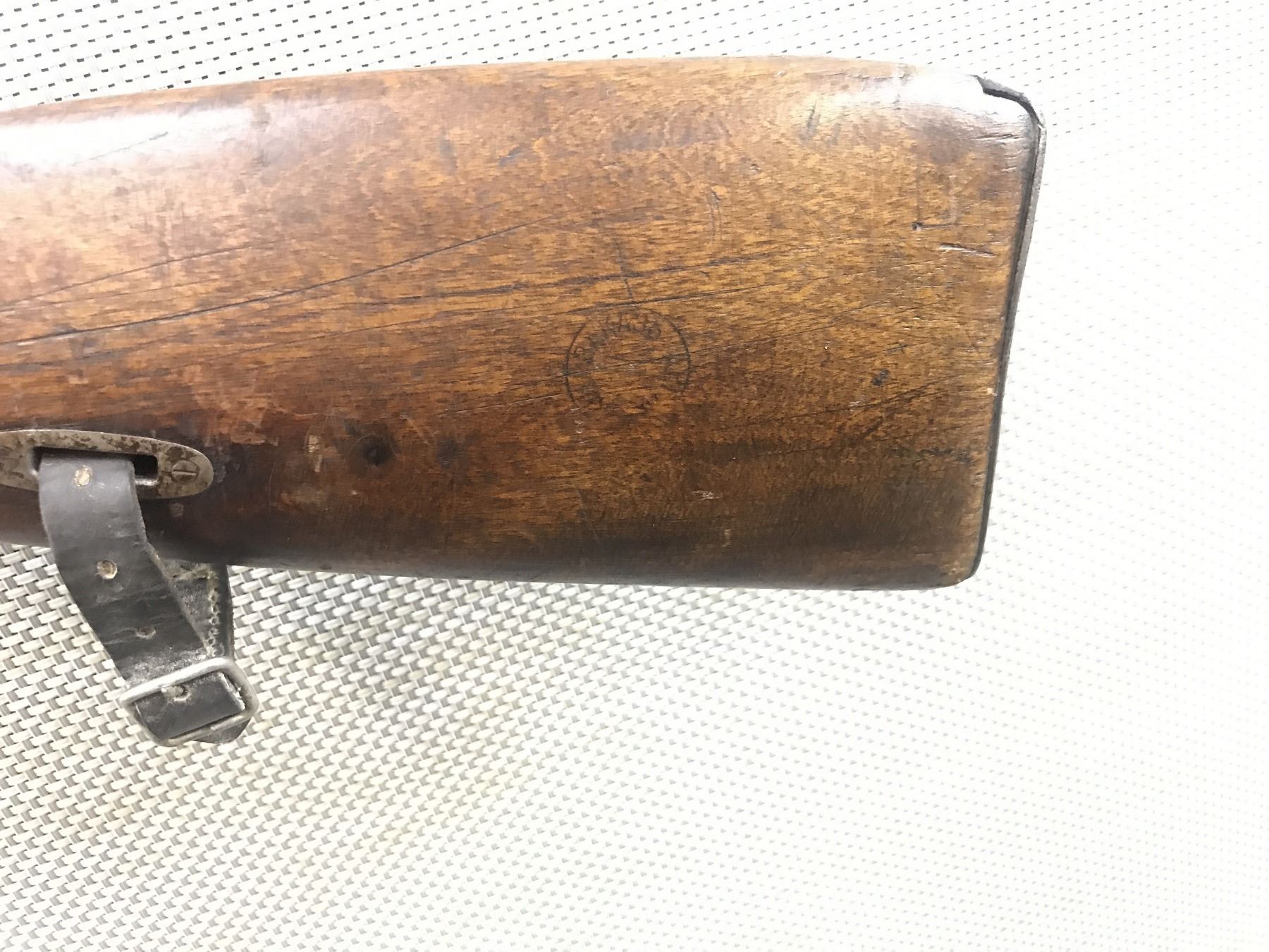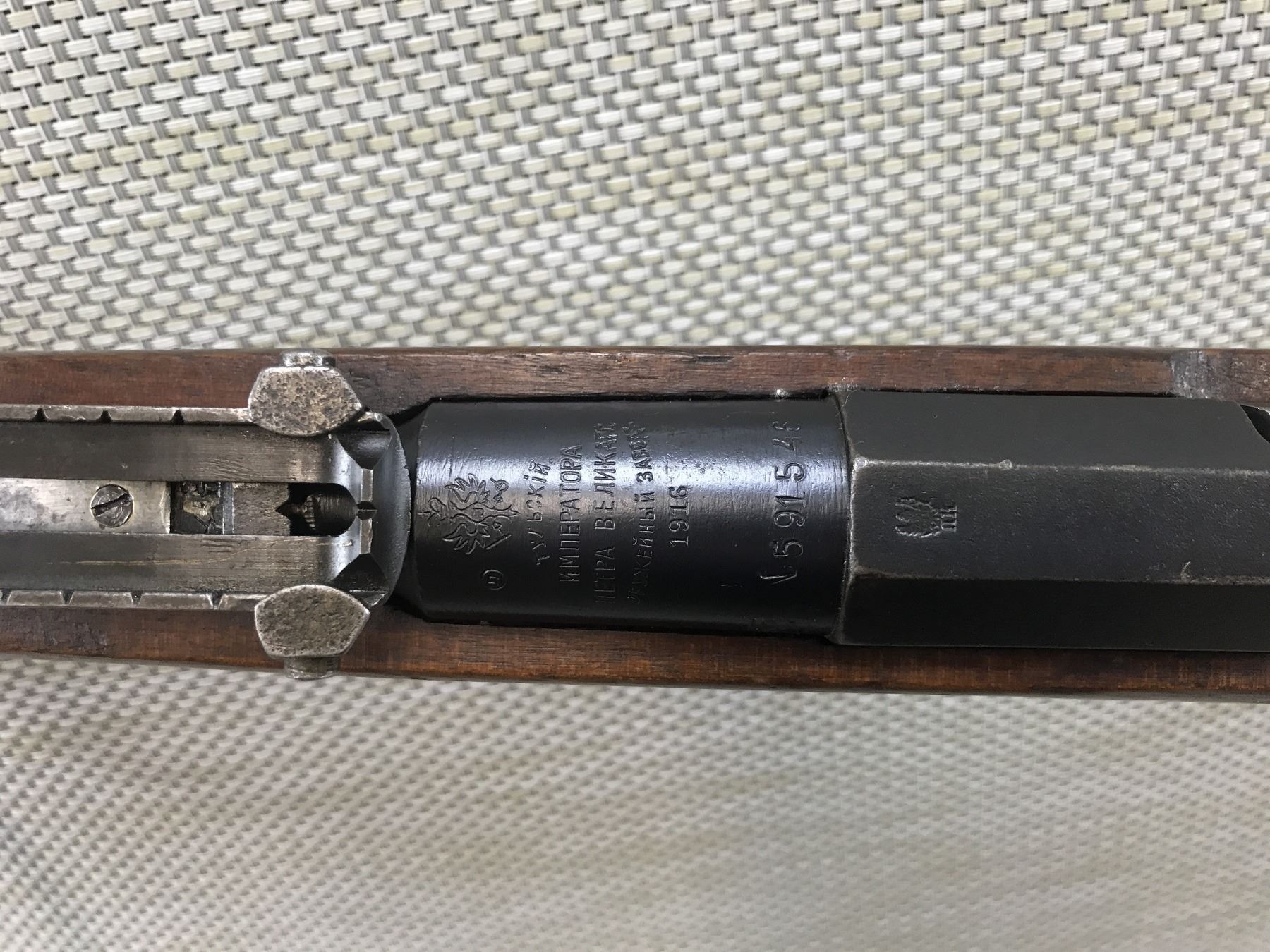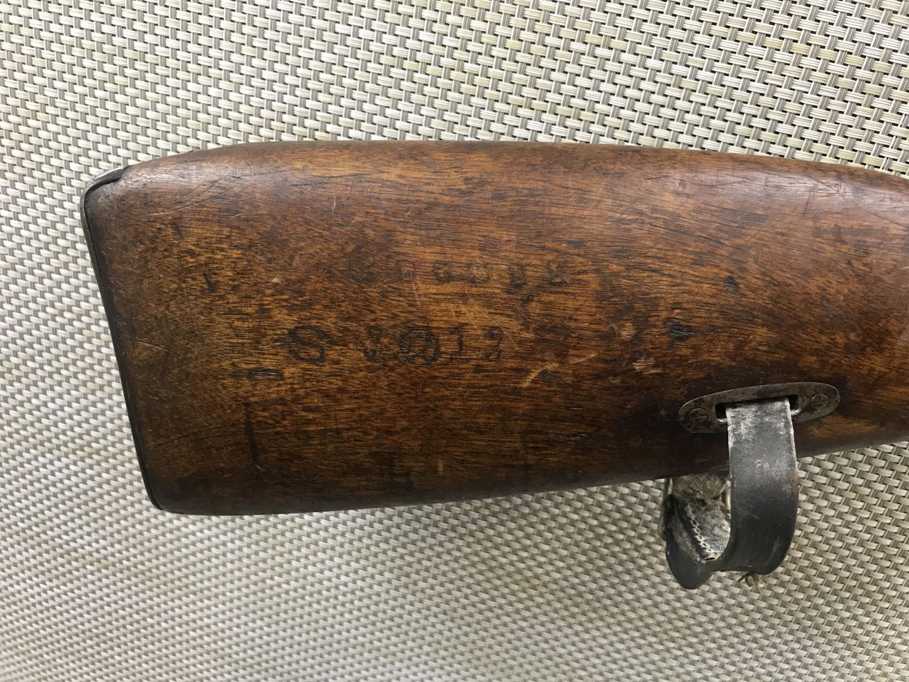 WWI ERA, MOSIN NAGANT , MODEL: 1891/30 , CALIBER: 7.62 X 54R , DATED 1916, VERY GOOD BORE, BLADE FRONT AND ADJUSTABLE REAR SIGHT, BOLT HAS BEEN RENUMBERED TO MATCH THE RECEIVER, SHOWS EXTENSIVE HANDLING MARKS, RETAINS ORIGINAL LEATHER SLING LOOPS, HAS CLEANING ROD , BARREL LENGTH: 32" , SERIAL # 591546 , STOCK # 8392 , CONDITION: 6/10 , CLASS: CANADIAN NON RESTRICTED CLASS