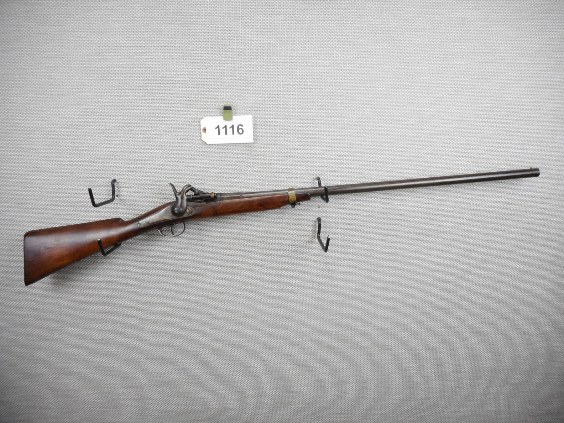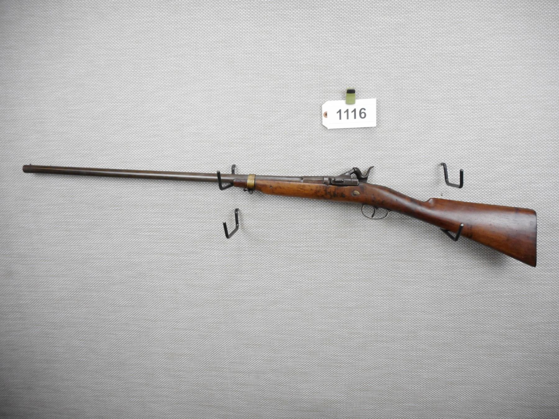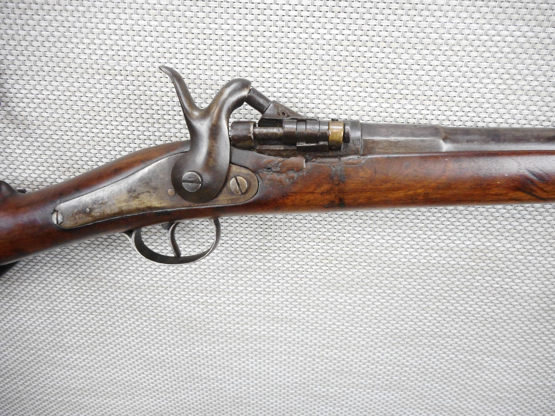 UNKNOWN BELGIAN , MODEL: BREACH BLOCK , CALIBER: 12 BORE , BEAD FRONT SIGHT, WOODEN STOCK, CRACKED AND REPAIRED AT THE FRONT OF THE LOCK AND TOP TANG, METAL BUTT PLATE, DARK PITTED BORE , BARREL LENGTH: 30" , SERIAL # N/A , STOCK # 8485 , CONDITION: 3/10 , CLASS: CANADIAN NON RESTRICTED CLASS