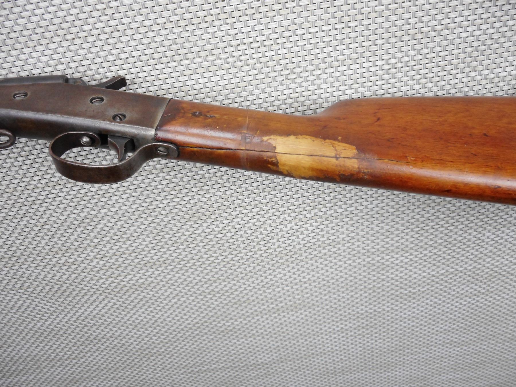 STEVENS , MODEL: LITTLE SCOUT 22 , CALIBER: 22 LR , PITTED BORE, POOR RIFLING, STOCK IS CRACKED AND REPAIRED AT THE WRIST, BLADE FRONT AND FIXED REAR SIGHTS, SHOWS EXTENSIVE HANDLING MARKS, STEEL BUTT PLATE , BARREL LENGTH: 18" , SERIAL # N/A , STOCK # 8518 , CONDITION: 3/10 , CLASS: CANADIAN NON RESTRICTED CLASS