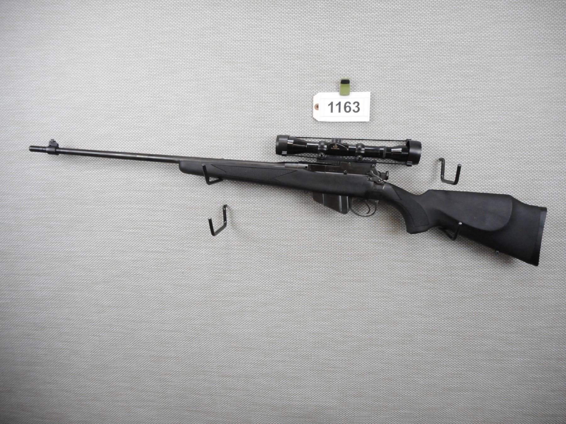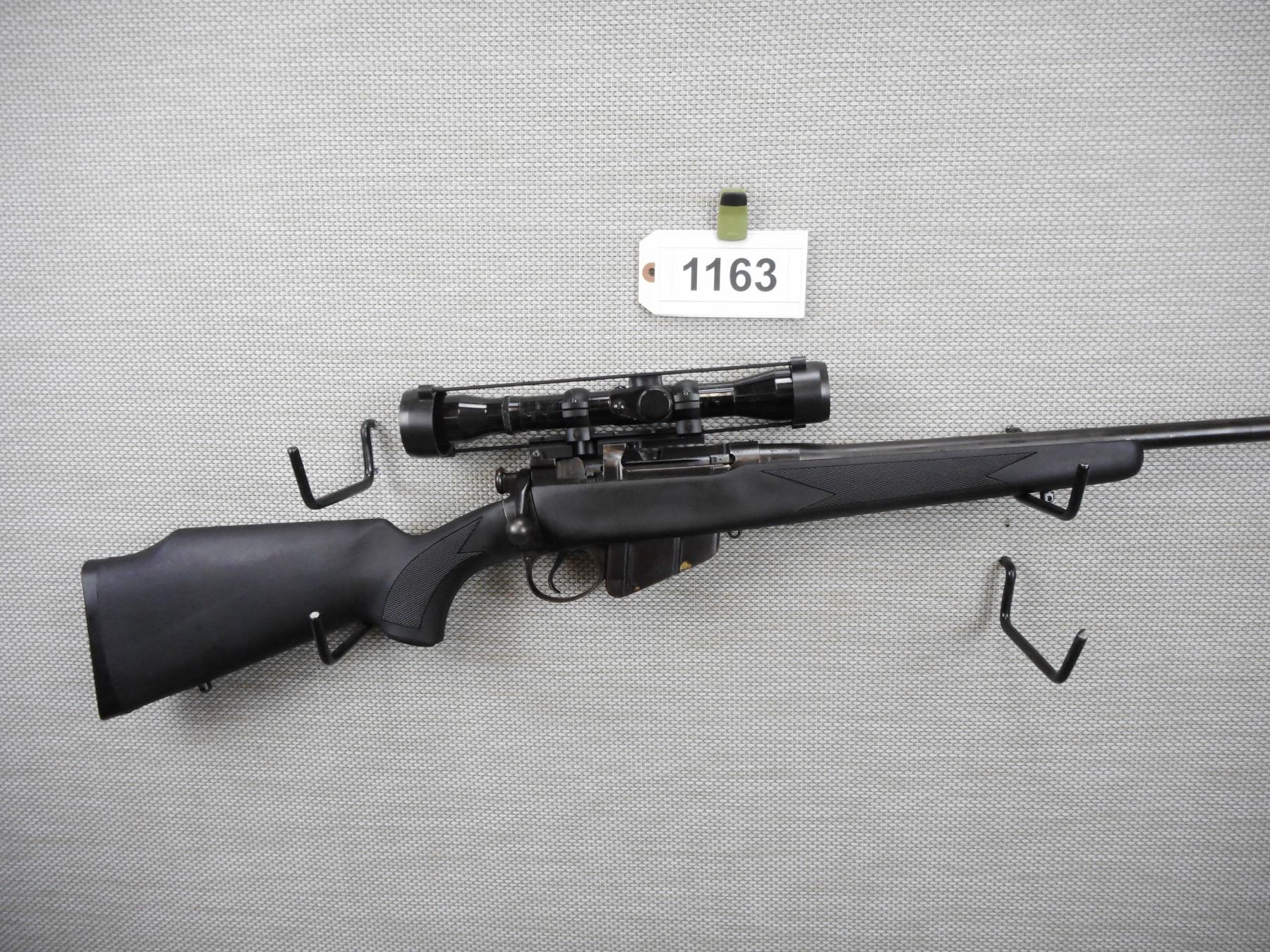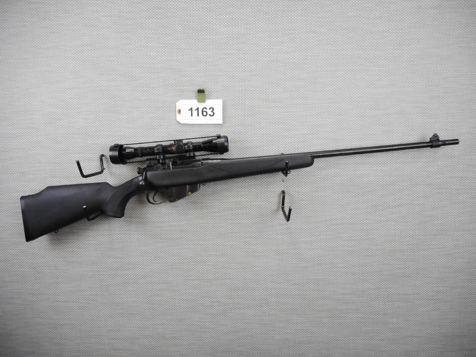 WWII ERA, LEE ENFIELD , MODEL: NO 4 MKI , CALIBER: 303 BR , COMES WITH MAGAZINE, DATED 1942 WITH A BRD ARROW, BOLT AND RECEIVER MATCH BY SERIAL #, VERY GOOD BORE, CONVERTED TO SINGLE STAGE TRIGGER, RAMP FRONT AND NO REAR SIGHTS, EQUIPPED WITH A PIC 4 X RIFLE SCOPE, REPLACED SYNTHETIC STOCK WITH RUBBER BUTT PLATE, AND CAPPED PISTOL GRIP BUTT STOCK , BARREL LENGTH: 25" , SERIAL # Z15089 , STOCK # 8532 , CONDITION: 7/10 , CLASS: CANADIAN NON RESTRICTED CLASS