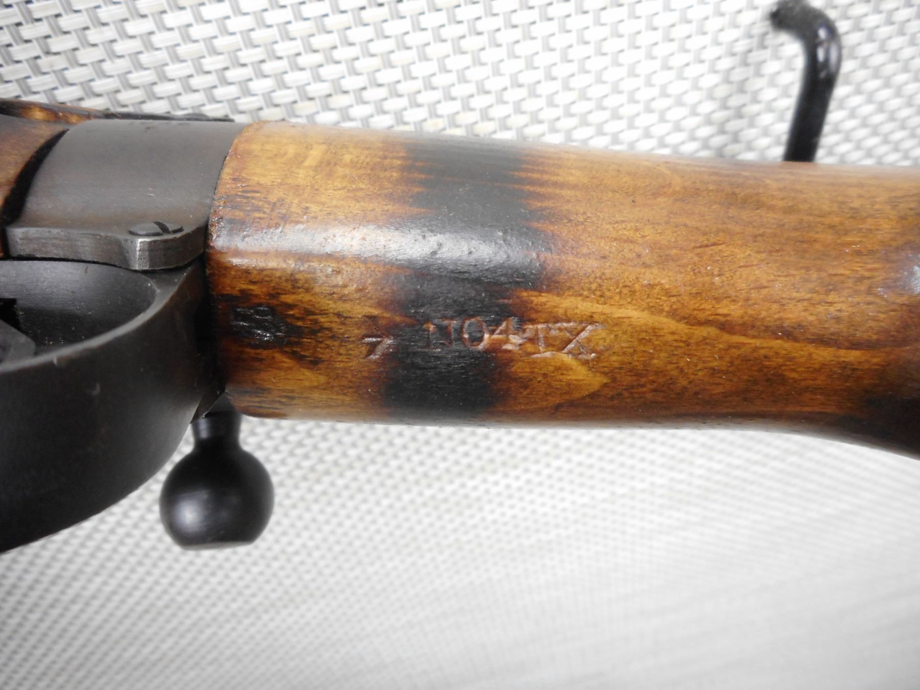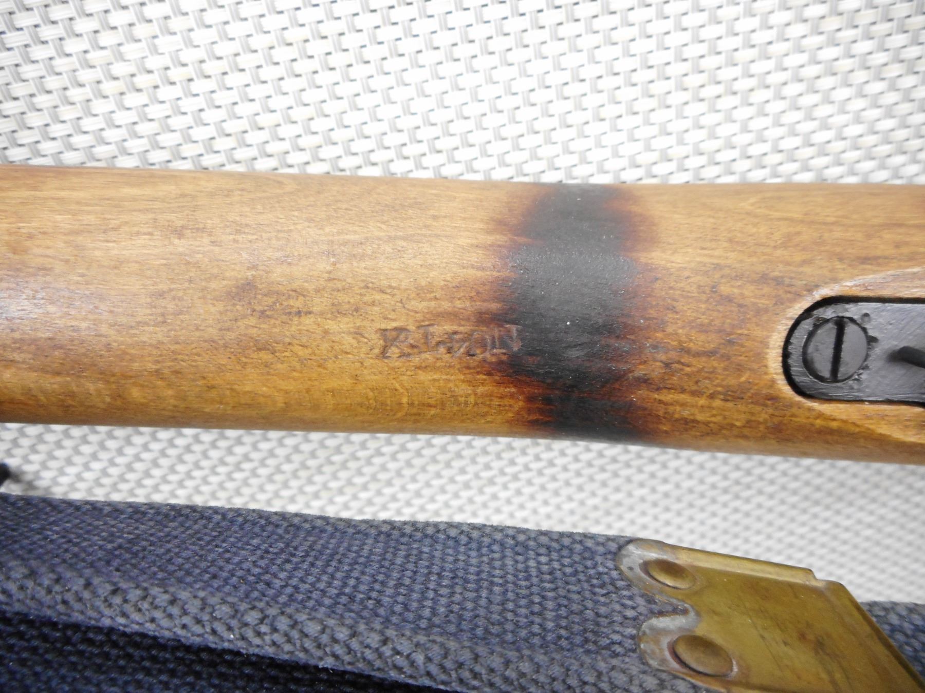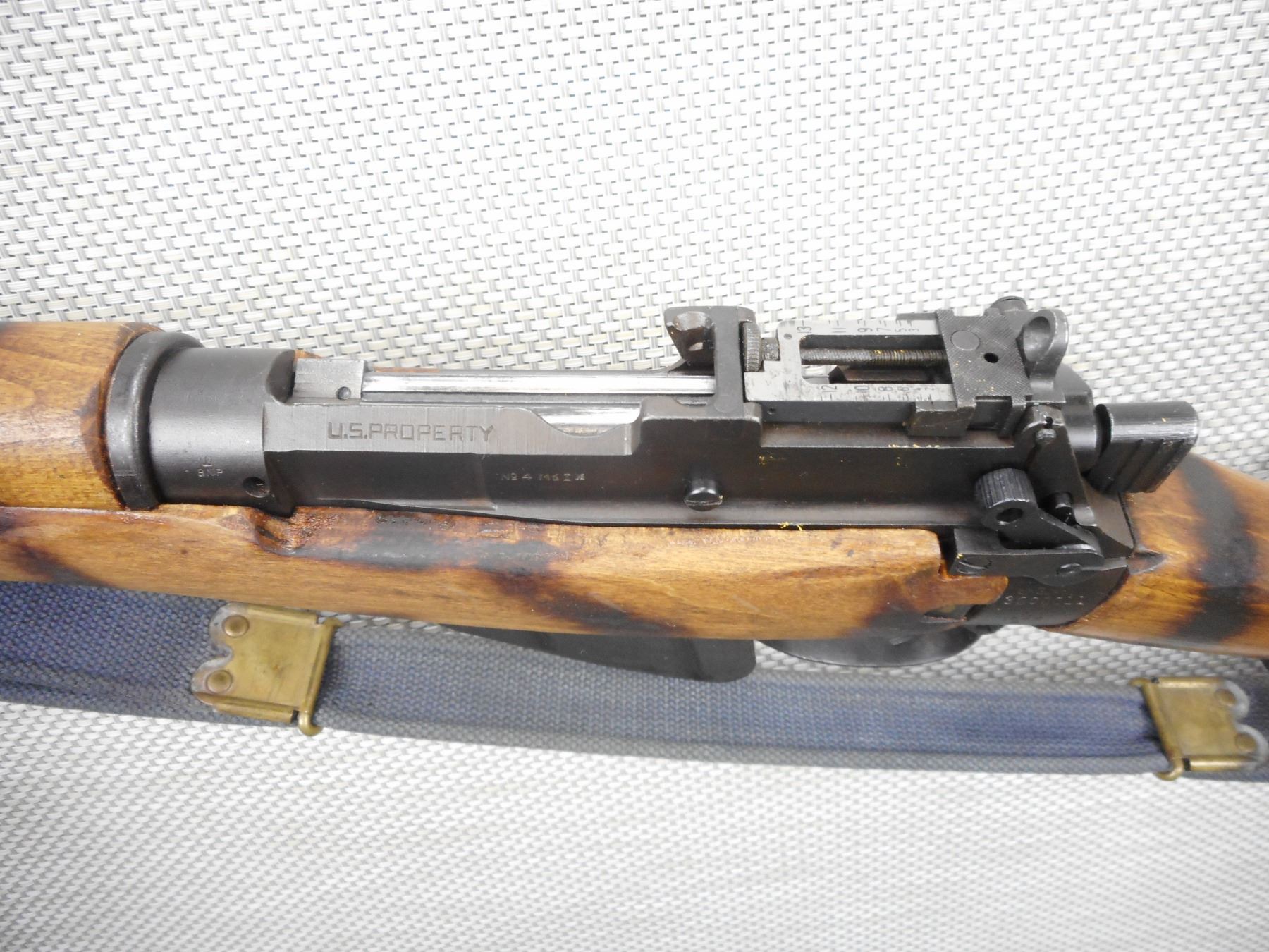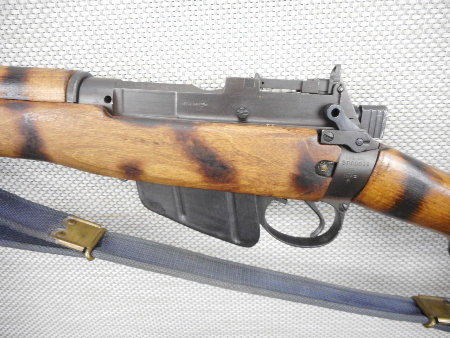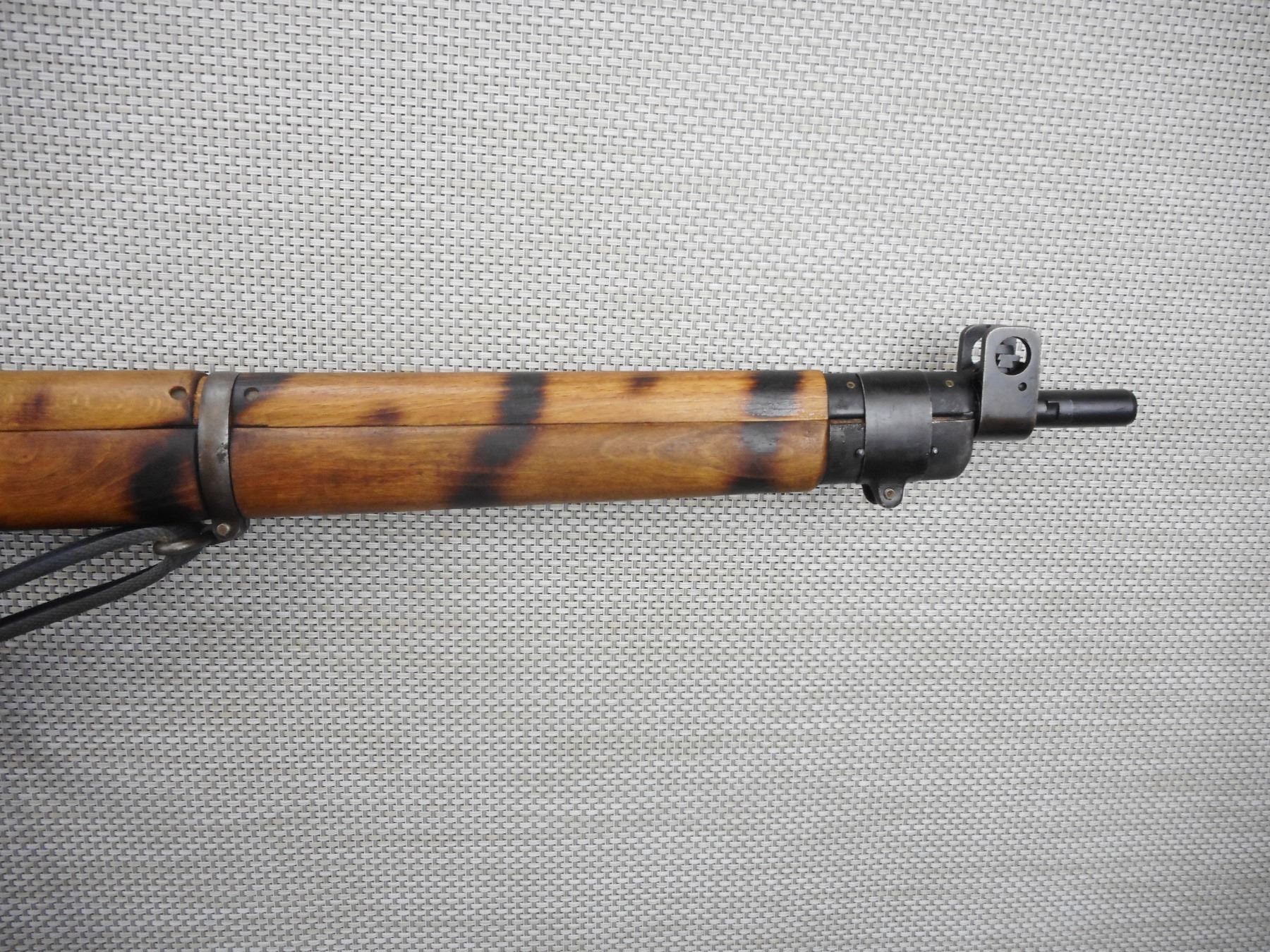WWII ERA, LEE ENFIELD , MODEL: NO 4 MKI* , CALIBER: 303 BR , COMES WITH MAGAZINE, DATED 1942, MARKED US PROPERTY, BORE IS VERY GOOD, BARLEY CORN FRONT AND PEEP APERTURE REAR SIGHTS, ORIGINAL MILITARY CANVAS SLING, RETAINS FULL MILITARY CONFIGURATION, SHOWS SOME HANDLING MARKS , WOOD HAS BEEN BURN STRIPED , BARREL LENGTH: 25" , SERIAL # 30C0011 , STOCK # 8544 , CONDITION: 6/10 , CLASS: CANADIAN NON RESTRICTED CLASS