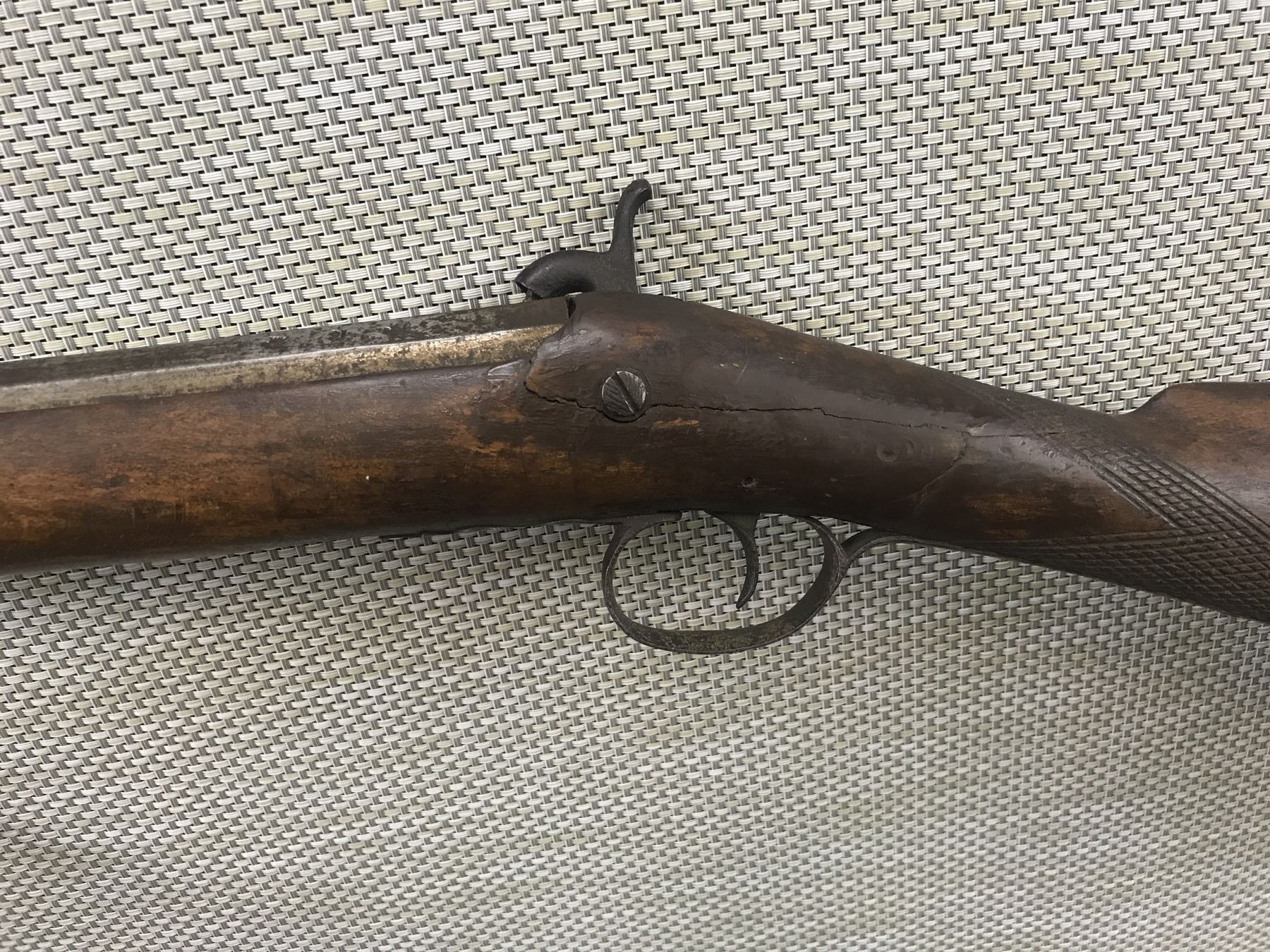 SMITH , MODEL: PERCUSSION FOWLING FUN , CALIBER: 12 BORE PERC , LONDON PROOFS, HOLDS COCK AND FIRES, 1/2 ROUND 1/2 OCTAGONAL BARREL, RAM ROD, BEAD FRONT SIGHT, NO REAR SIGHT, STOCK IS CRACKED AT THE WRIST, STEEL BUTT PLATE, SHOWS EXTENSIVE HANDLING MARKS , BARREL LENGTH: 33" , SERIAL # N/A , , CONDITION: ANTIQUE 4/10 , CLASS: CANADIAN ANTIQUE CLASS