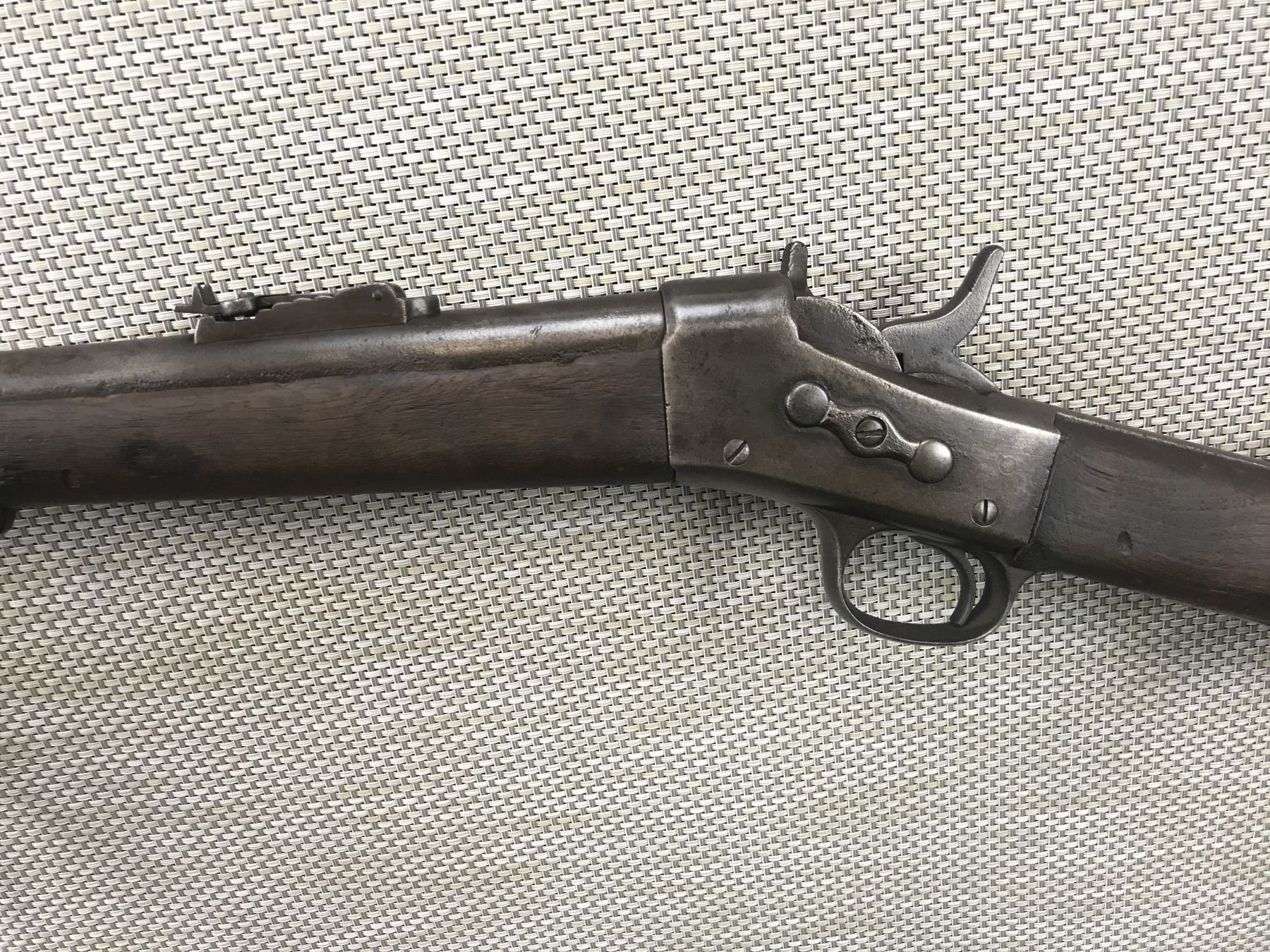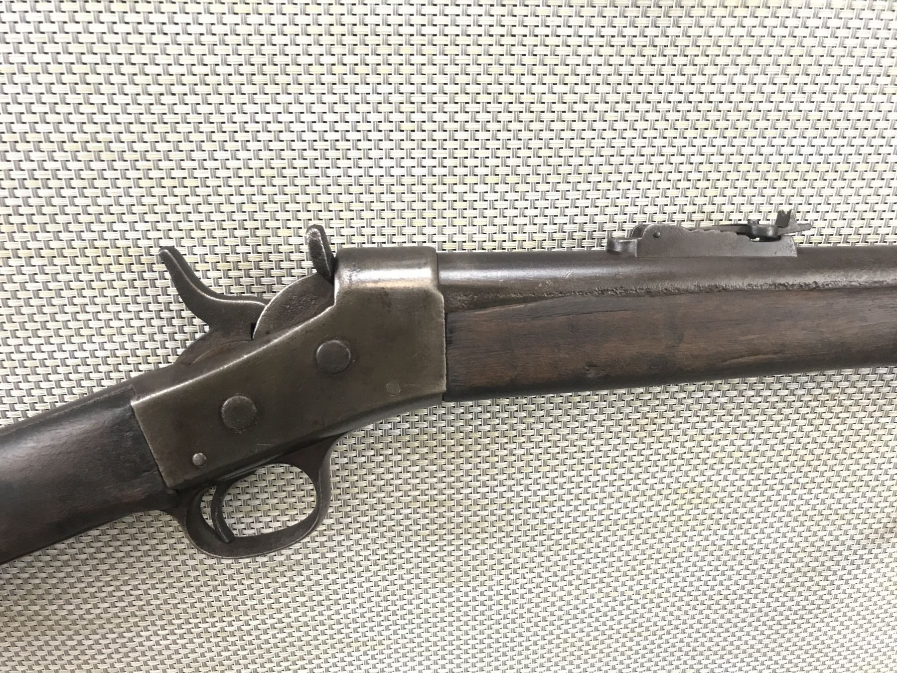 REMINGTON , MODEL: ROLLING BLOCK , CALIBER: 45-60 , DARK BORE, BLOCK FRONT AND ADJUSTABLE REAR SIGHT, NO MARKINGS VISIBLE, SHOWS EXTENSIVE HANDLING MARKS, ORIGINAL CLEANING ROD, BARREL IS PITTED ON THE OUTSIDE AND CRACKED AT THE FOREND, SLING SWIVEL LOOPS , BARREL LENGTH: 35" , SERIAL # N/A , , CONDITION: ANTIQUE 3/10 , CLASS: CANADIAN ANTIQUE CLASS