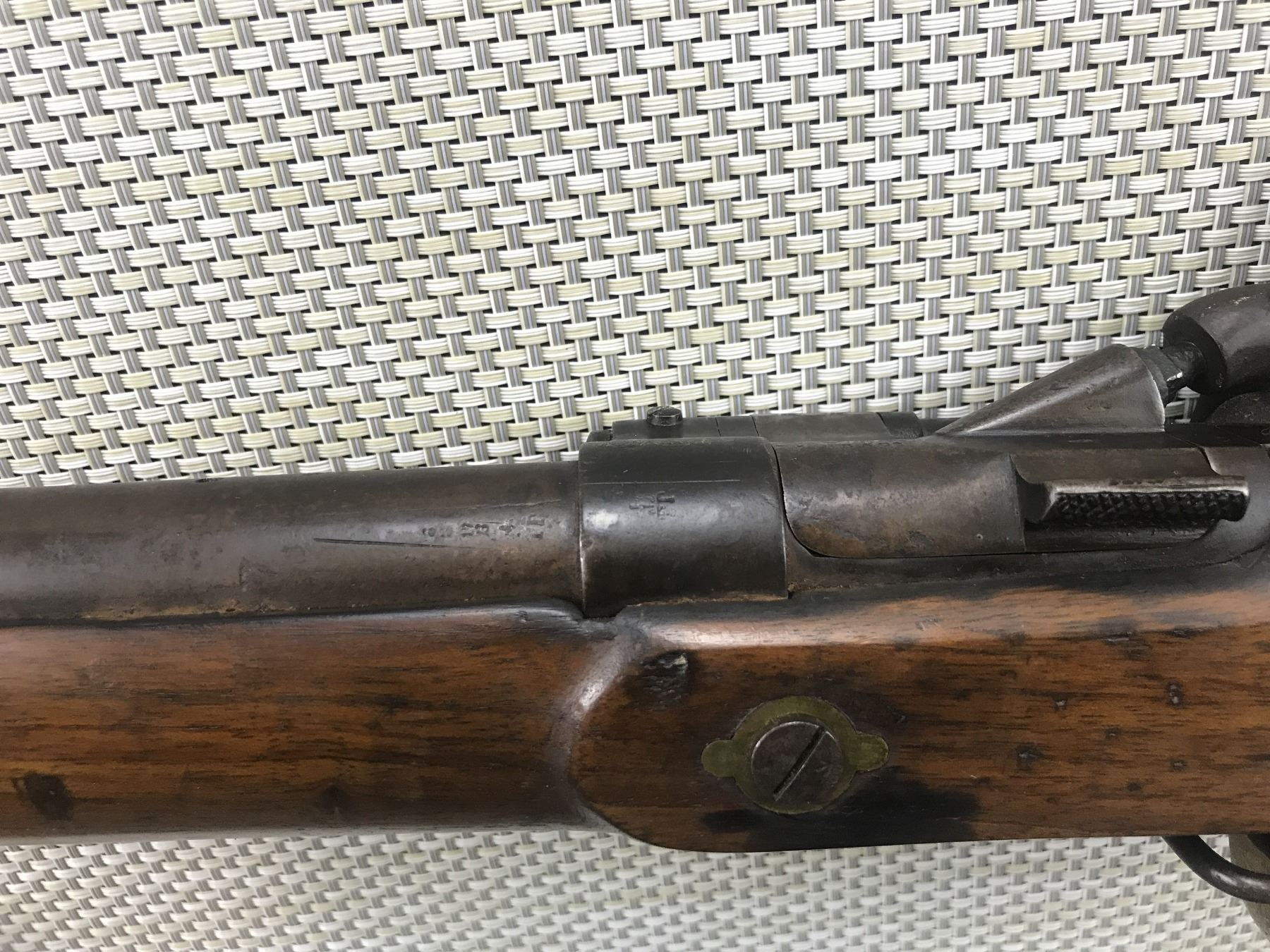 SNIDER ENFIELD , MODEL: MK ** CADET CARBINE , CALIBER: 577 SNIDER , DARK BORE, FLATTENED BEAD FRONT SIGHT, MISSING THE REAR SIGHT, MISSING A BUTT PLATE SCREW, SHOWS SOME HANDLING MARKS , BARREL LENGTH: 19 1/4" , SERIAL # N/A , , CONDITION: ANTIQUE 3/10 , CLASS: CANADIAN ANTIQUE CLASS