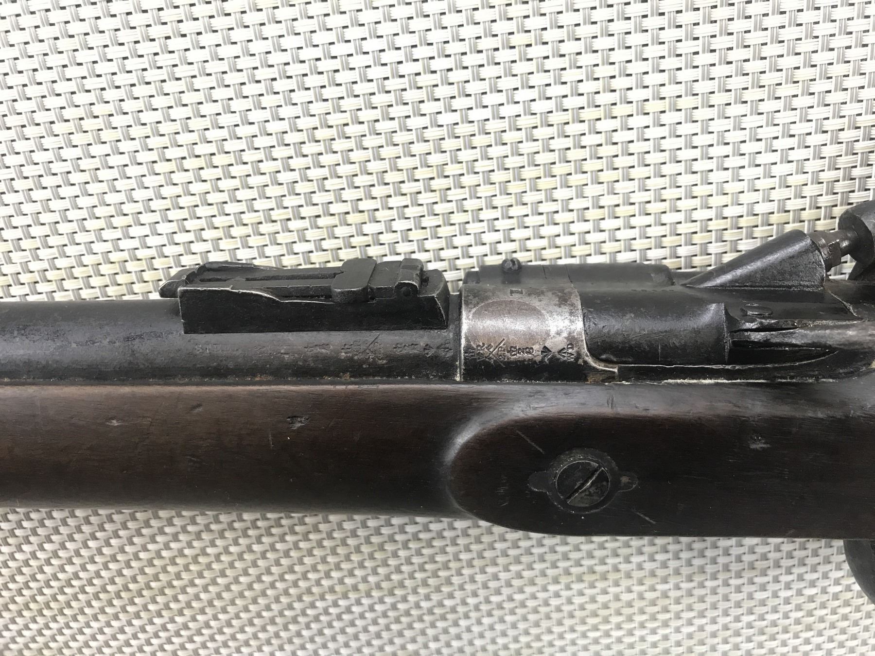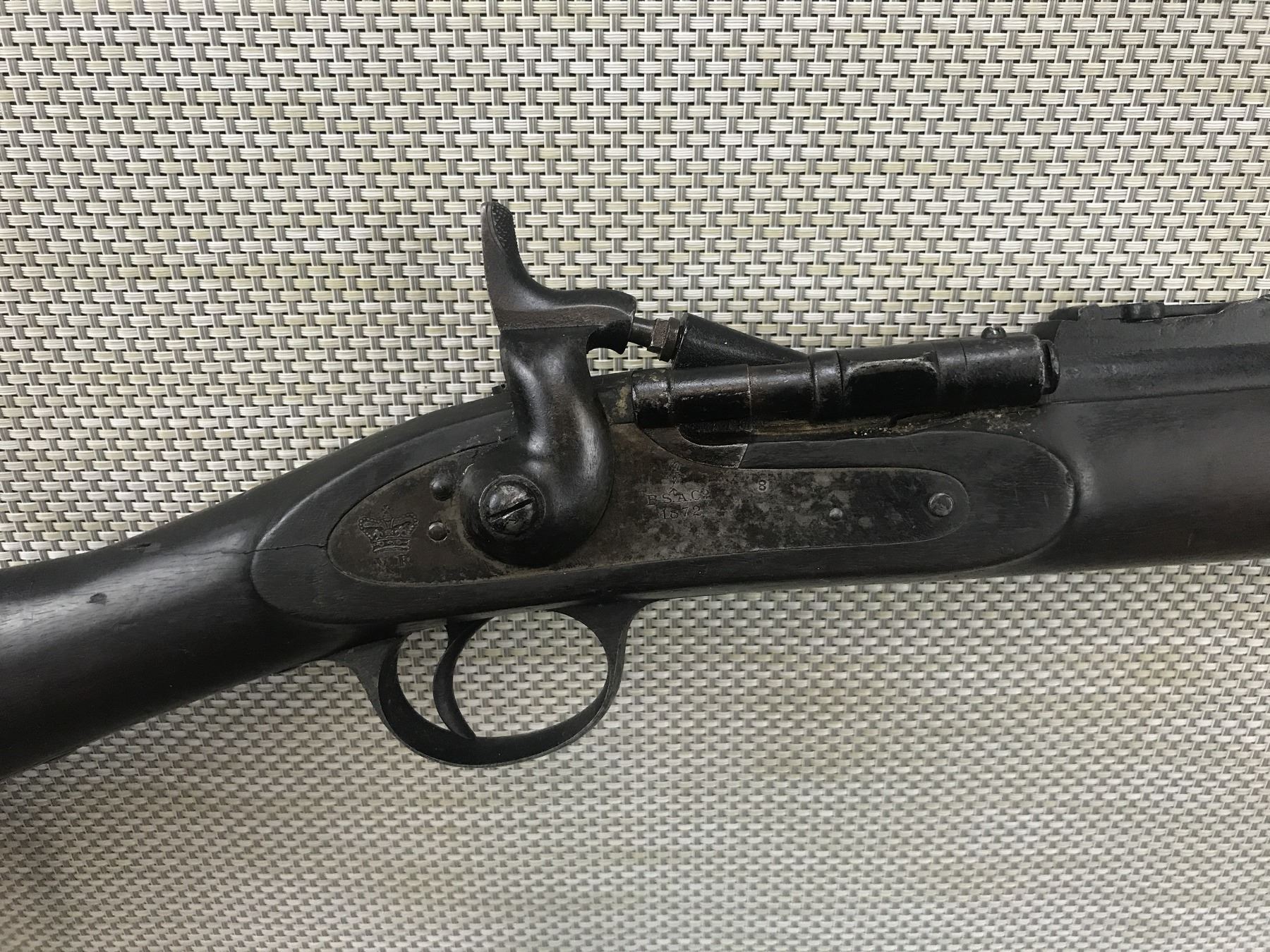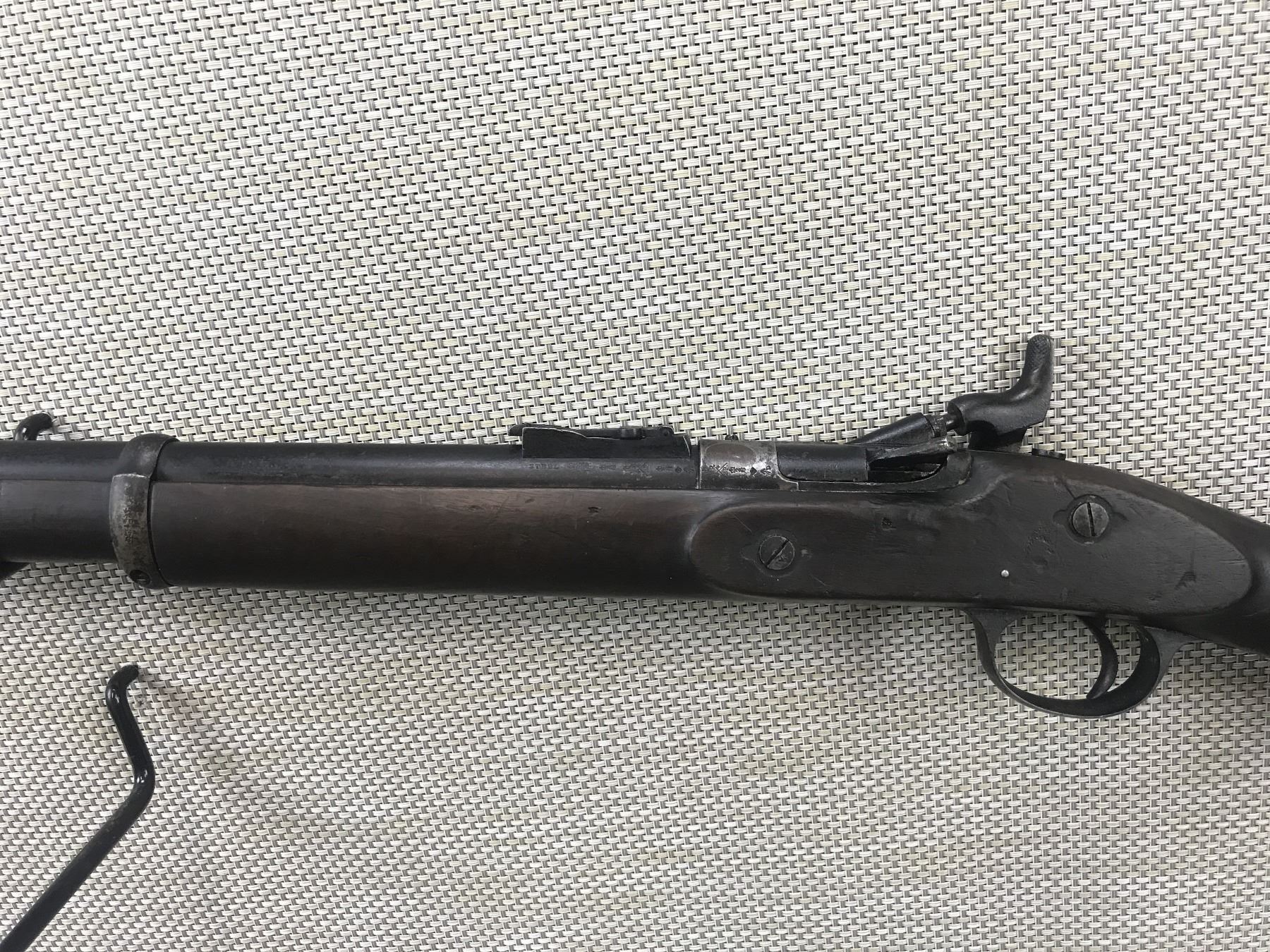 SNIDER ENFIELD , MODEL: MK III , CALIBER: 577 SNIDER , MISSING THE FIRING PIN AND THE CLEANING ROD, DARK BORE, BLOCK FRONT AND ADJUSTABLE REAR SIGHTS, LOCK IS DATED 1872 AND MARKED BSA, STOCK IS CARVED AND CRACKED AT THE WRIST, REPLACED ACTION LOCKING LEVER, SHOWS SURFACE RUST AND PITTING, EXTENSIVE HANDLING MARKS , BARREL LENGTH: 31" , SERIAL # 98 , , CONDITION: ANTIQUE 3/10 , CLASS: CANADIAN ANTIQUE CLASS