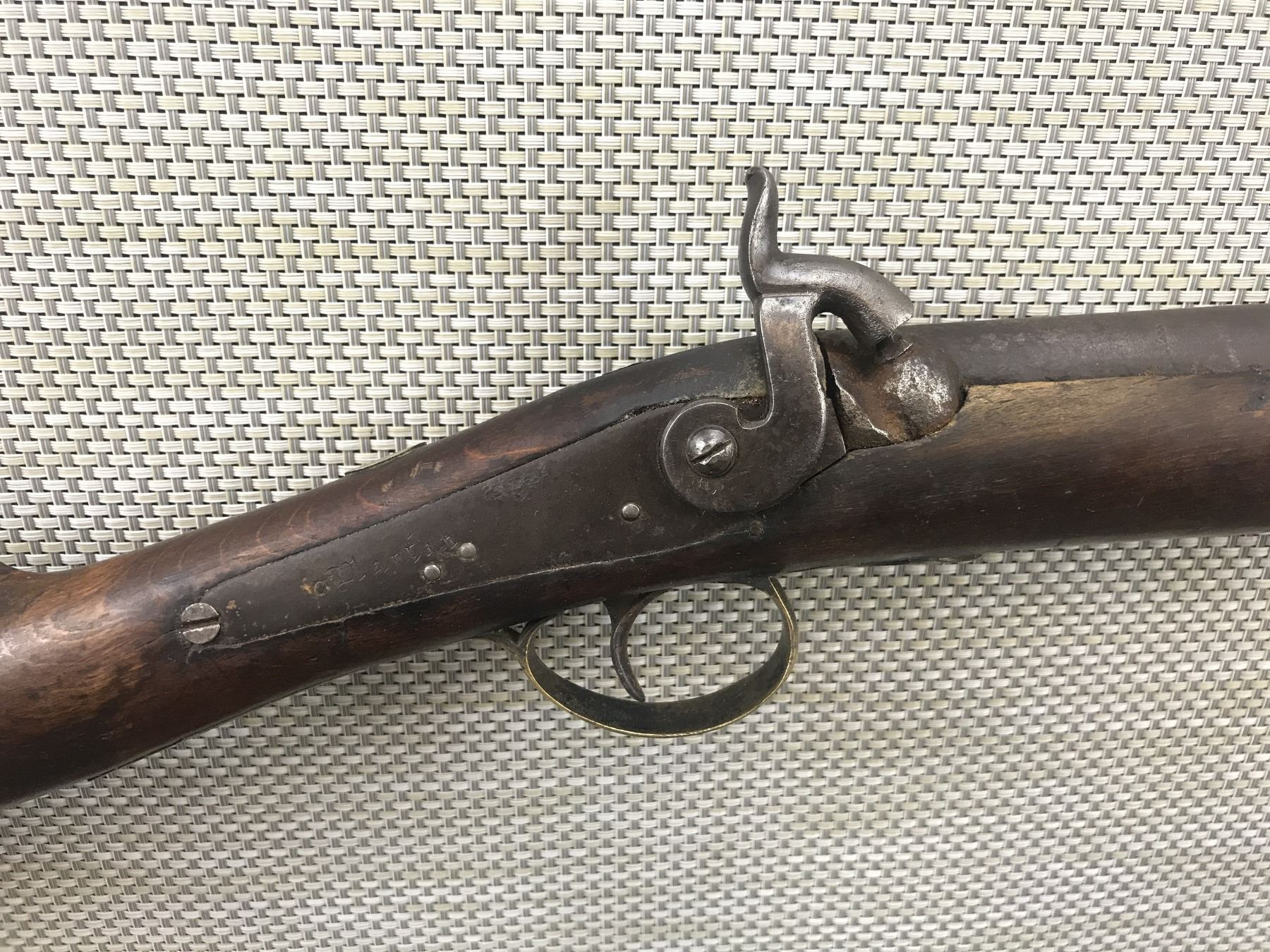MANTON , MODEL: PERCUSSION SHOTGUN , CALIBER: 12 BORE PERC , BEAD FRONT SIGHT, BROKEN RAM ROD RETAINING RING, SMOOTH RUSTY BORE, LONDON PROOFS, CRACK AT THE WRIST AND AT THE BUTT, BRASS BUTT PLATE, SHOWS EXTENSIVE HANDLING MARKS , BARREL LENGTH: 32" , SERIAL # N/A , , CONDITION: ANTIQUE 3/10 , CLASS: CANADIAN ANTIQUE CLASS