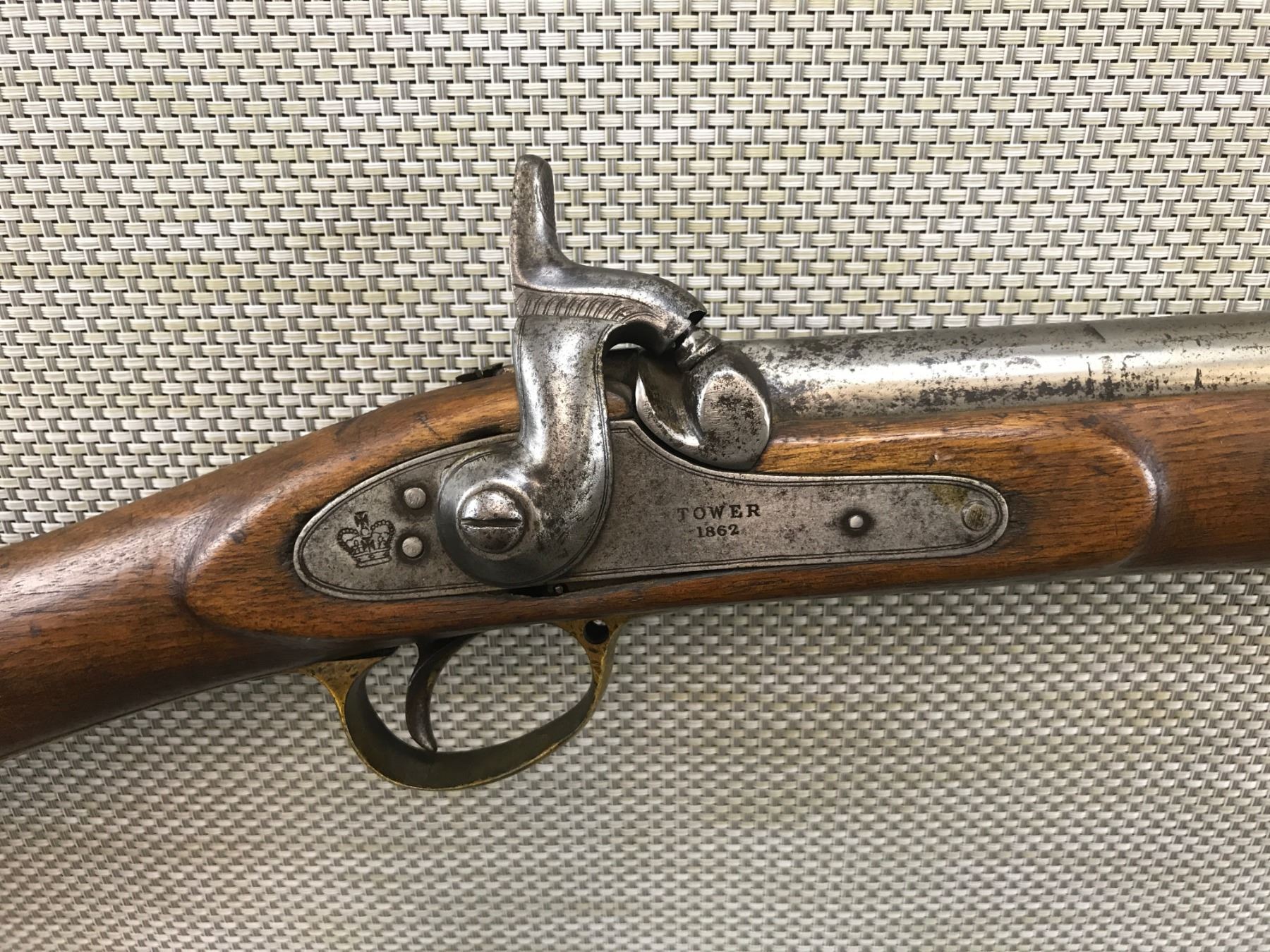 ENFIELD , MODEL: PATTERN 1853 MUSKET , CALIBER: 577 PERCUSSION , LOCK IS TOWER DATED 1862, MISSING THE RAM ROD, BLADE FRONT SIGHT, NON ORIGINAL BARREL BANDS , BARREL LENGTH: 39" , SERIAL # N/A , , CONDITION: ANTIQUE 4/10 , CLASS: CANADIAN ANTIQUE CLASS