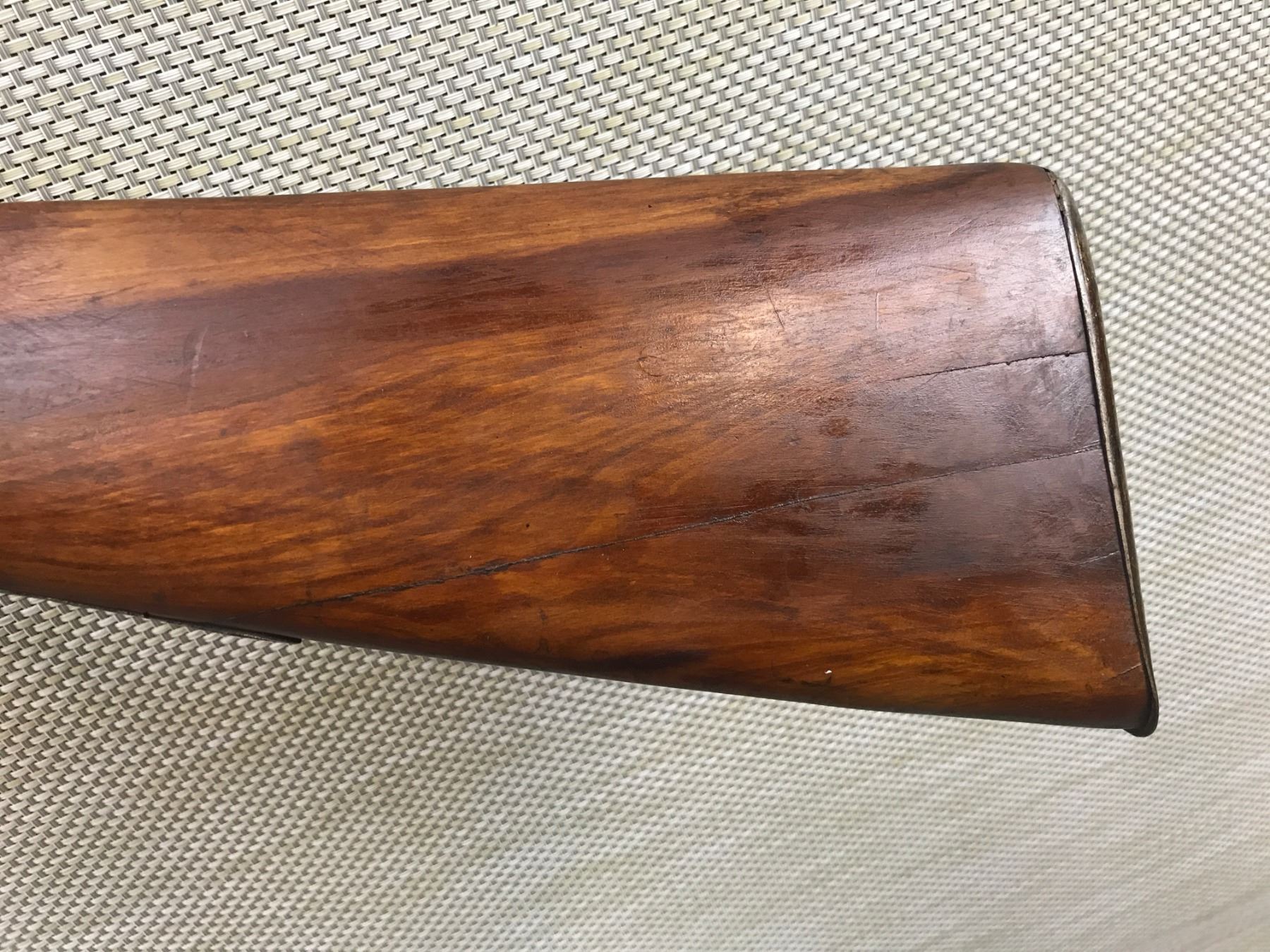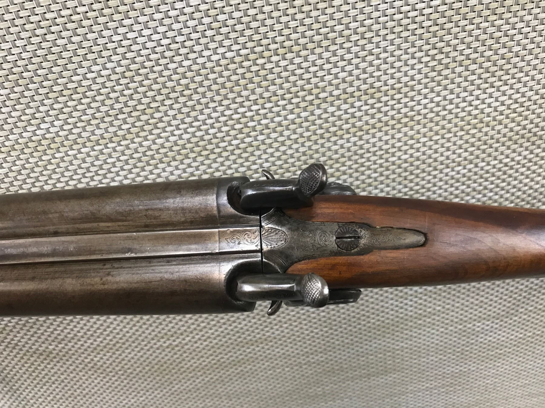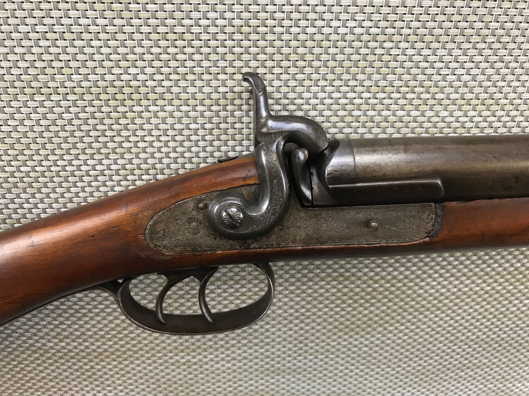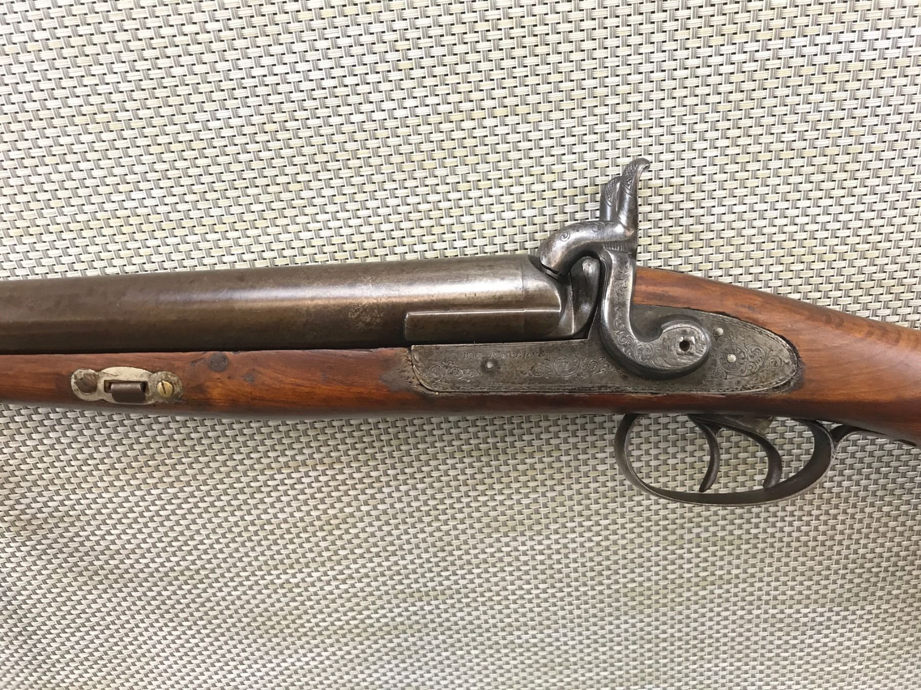 WG RAWBONE , MODEL: SIDE BY SIDE PERCUSSION SHOTGUN , CALIBER: 12 BORE PERC , TORONTO BARREL ADDRESS, BEAD FRONT SIGHT, BOTH HAMMERS COCK HOLD AND FIRE, MISSING THE HAMMER SCREW ON THE LEFT SIDE, RAM ROD, DINGS IN THE LEFT BARREL, BUTT STOCK HAS A CRACK , BARREL LENGTH: 31 1/2" , SERIAL # N/A , , CONDITION: ANTIQUE 5/10 , CLASS: CANADIAN ANTIQUE CLASS