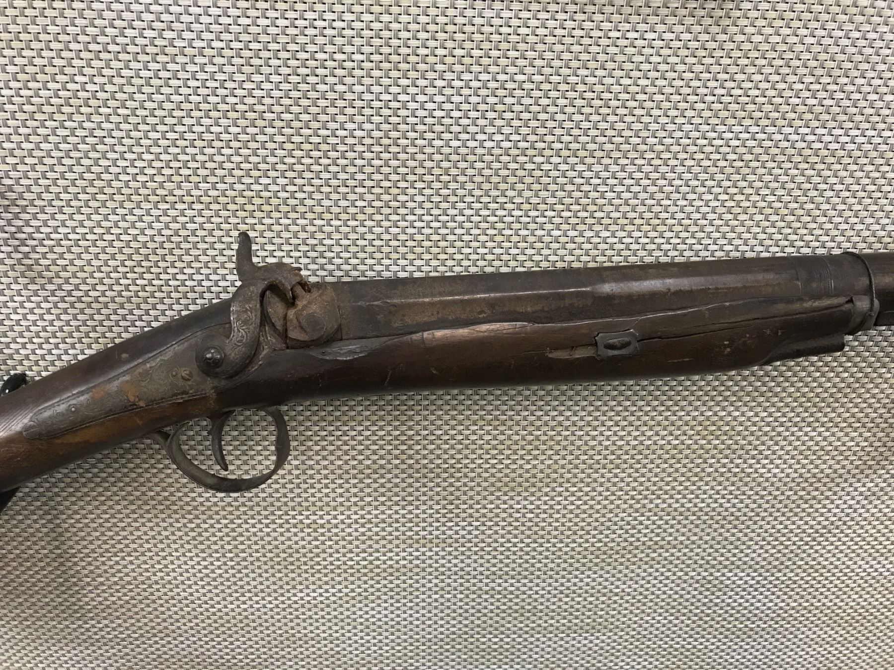 GILLARD , MODEL: SINGLE SHOT PERCUSSION FOWLING GUN , CALIBER: 12 BORE , BEAD FRONT SIGHT, BARREL BAND IS MISSING, RAM ROD IS MISSING , BARREL LENGTH: 27" , SERIAL # N/A , , CONDITION: ANTIQUE 3/10 , CLASS: CANADIAN ANTIQUE CLASS